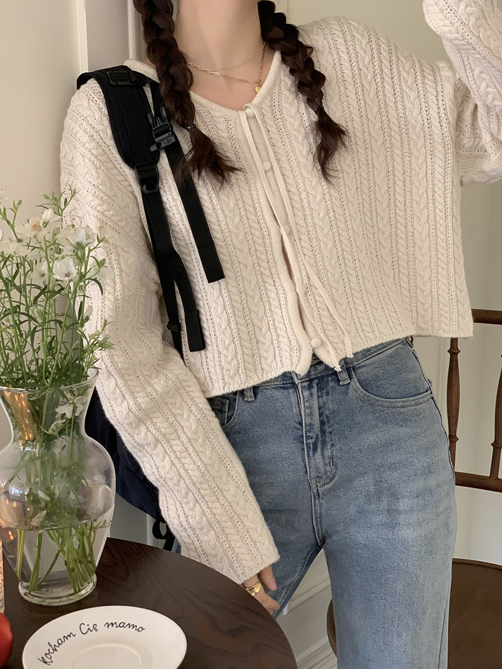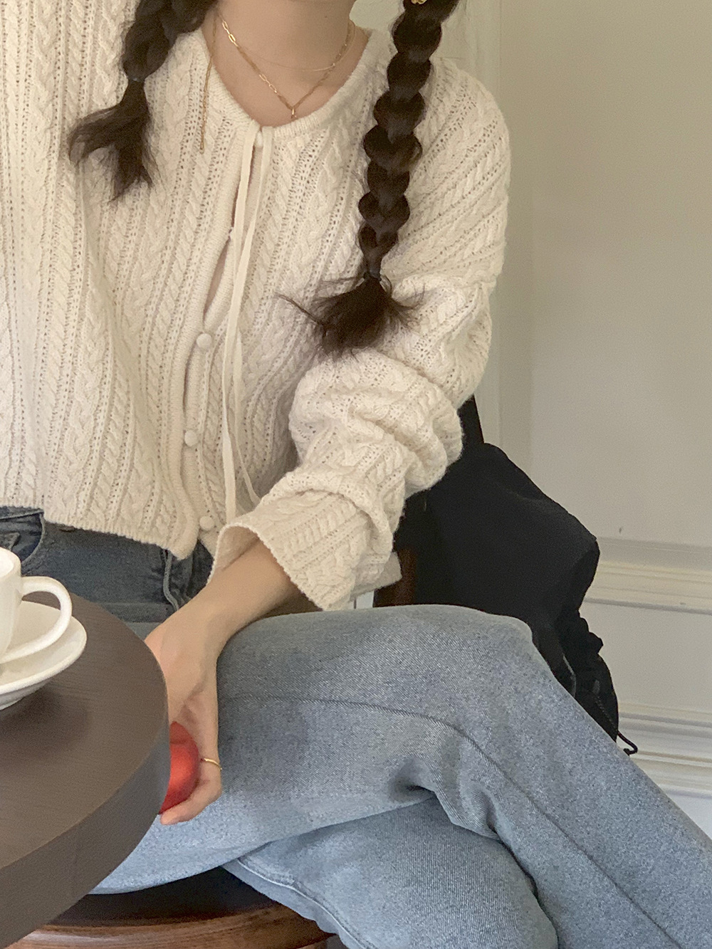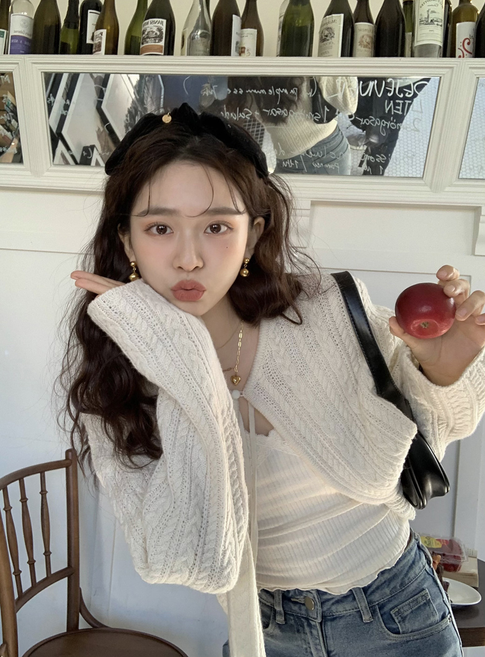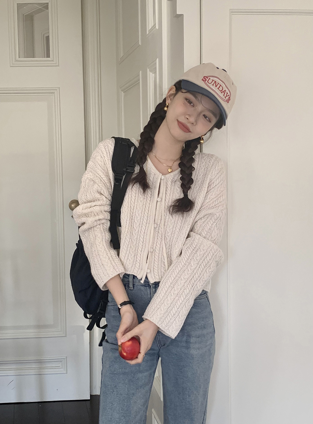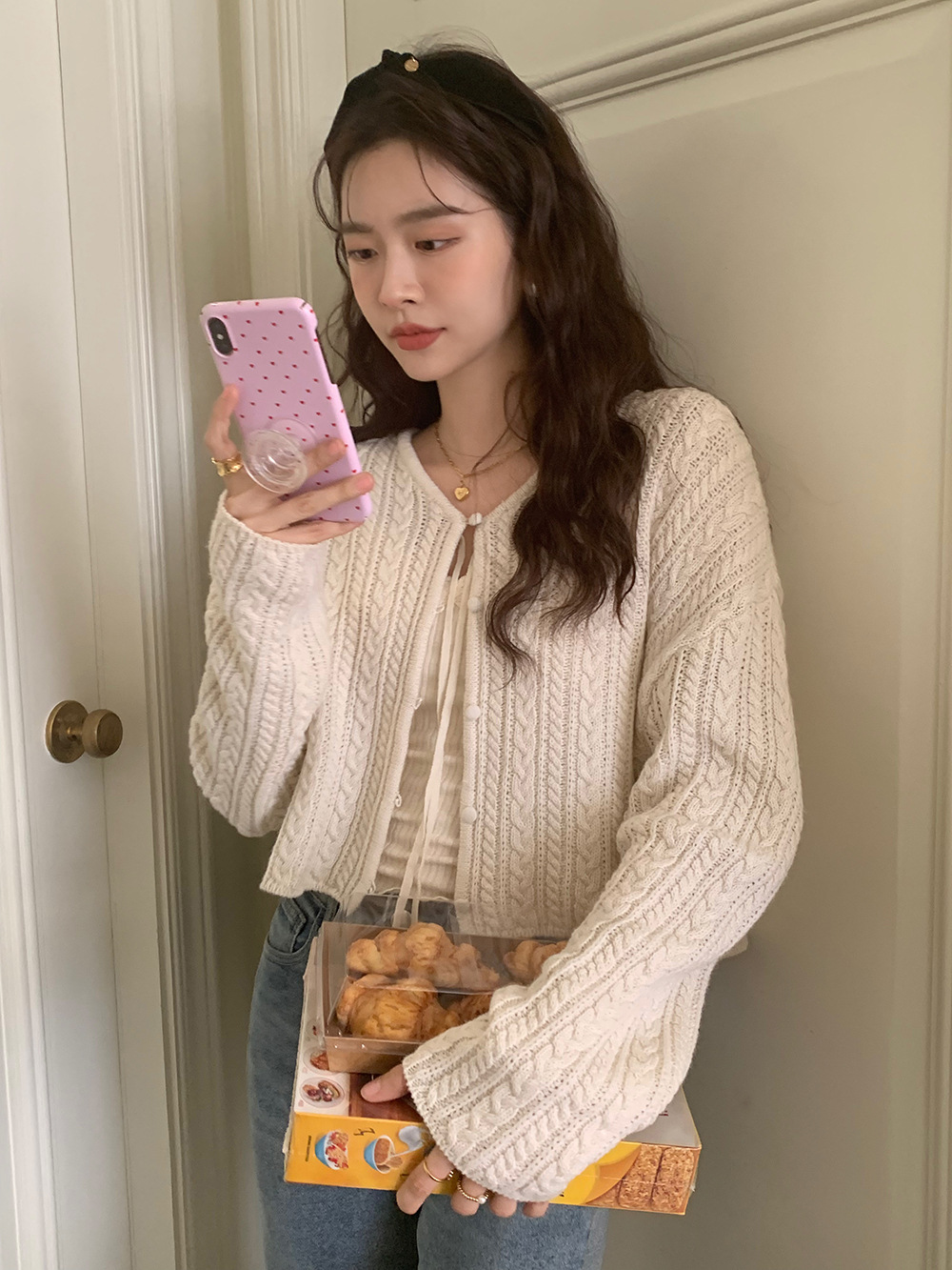 JMA-546 实拍2024秋冬韩版鬼马少女落肩麻花针织开衫甜美可爱系带毛衣外套