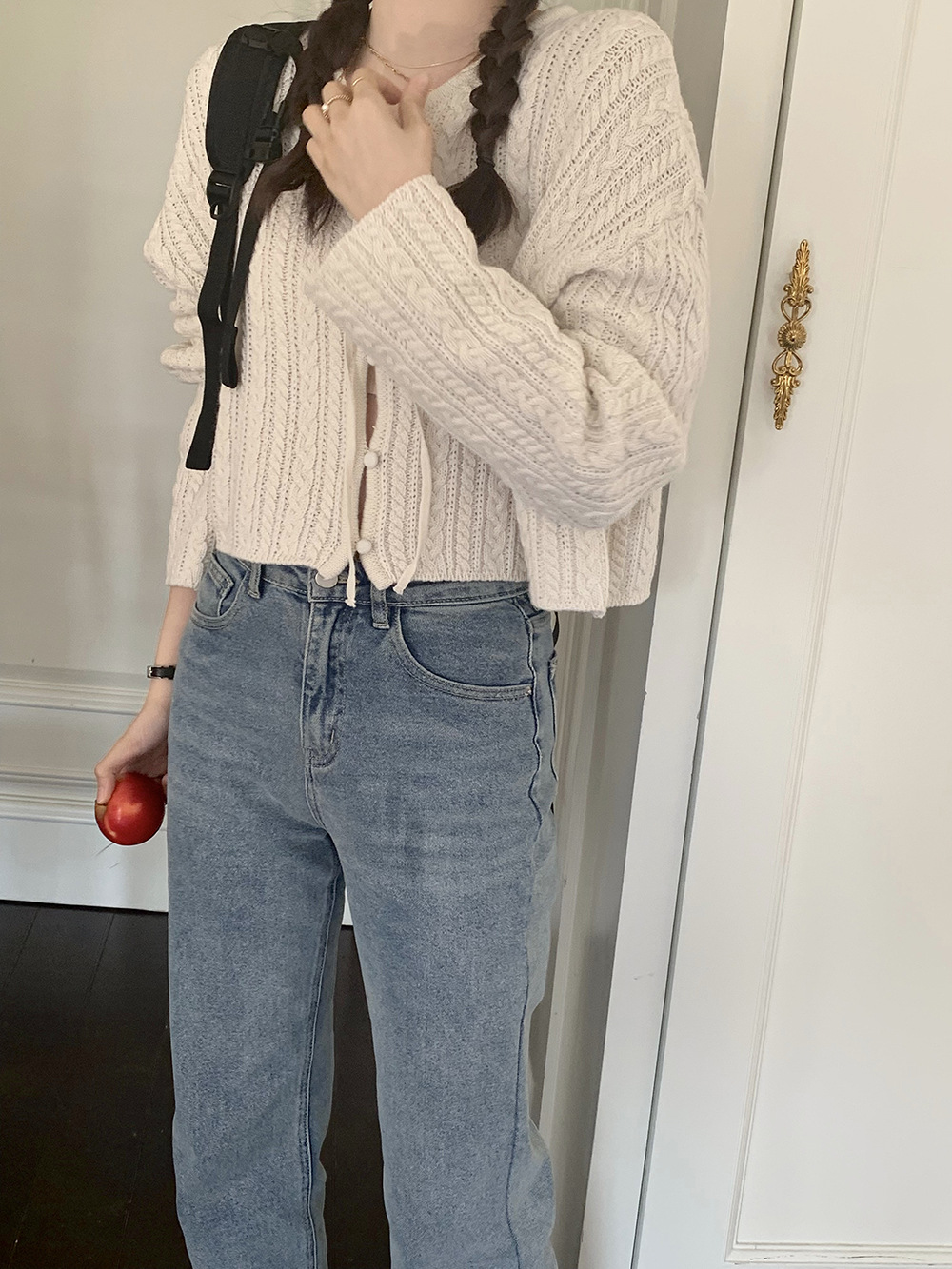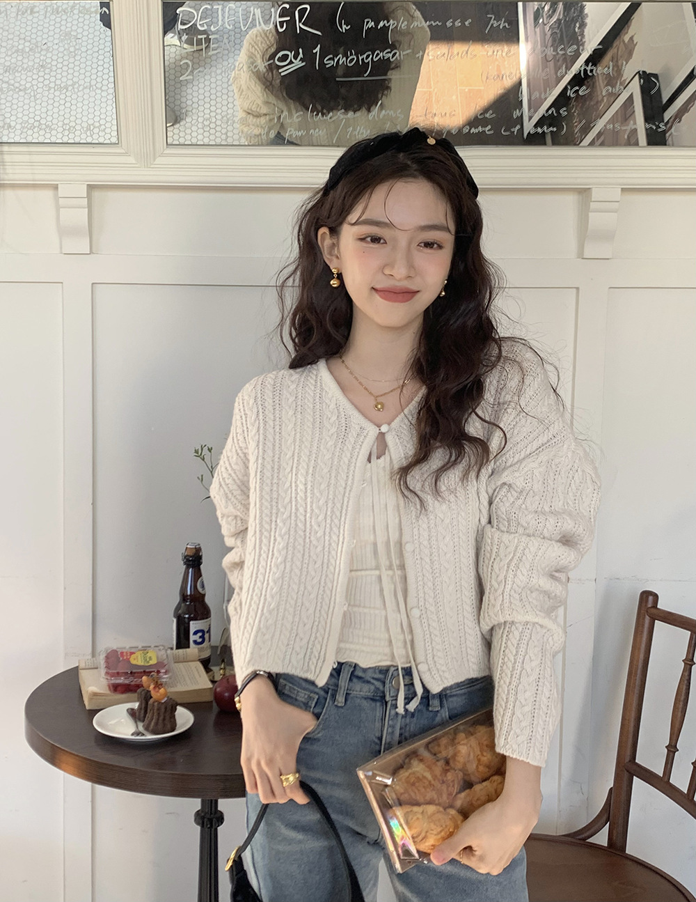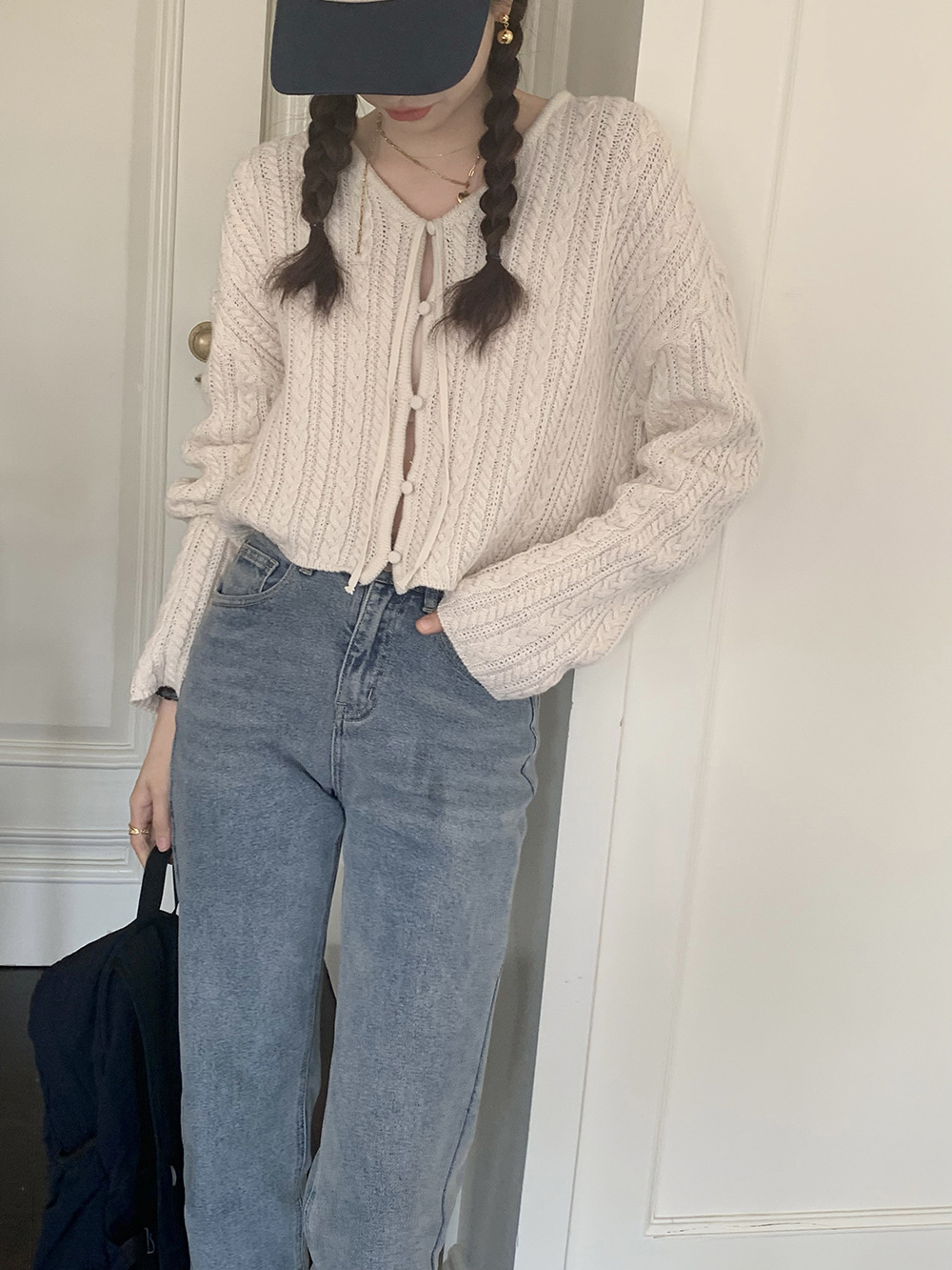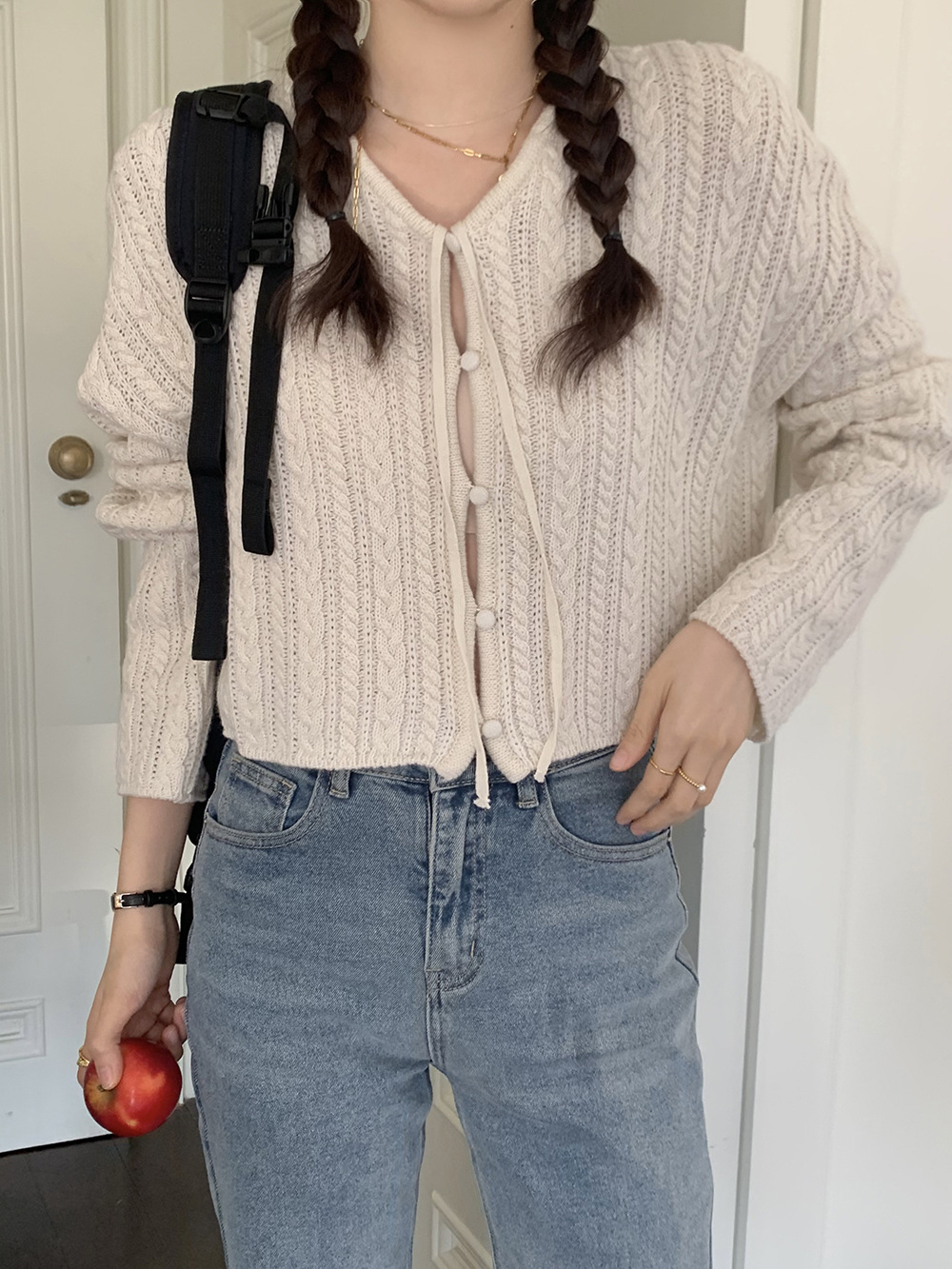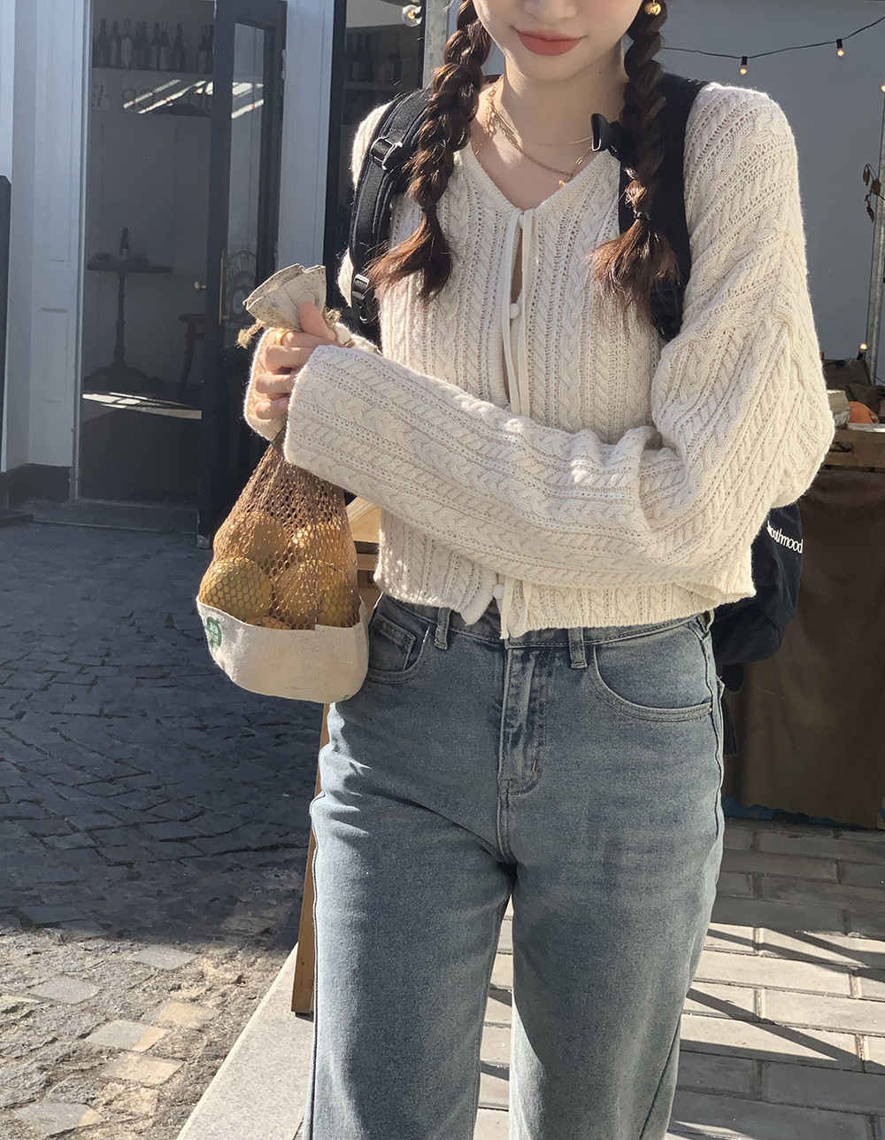 JMA-546 实拍2024秋冬韩版鬼马少女落肩麻花针织开衫甜美可爱系带毛衣外套