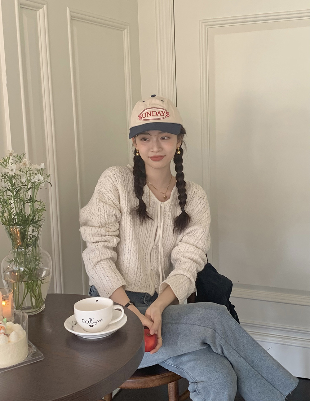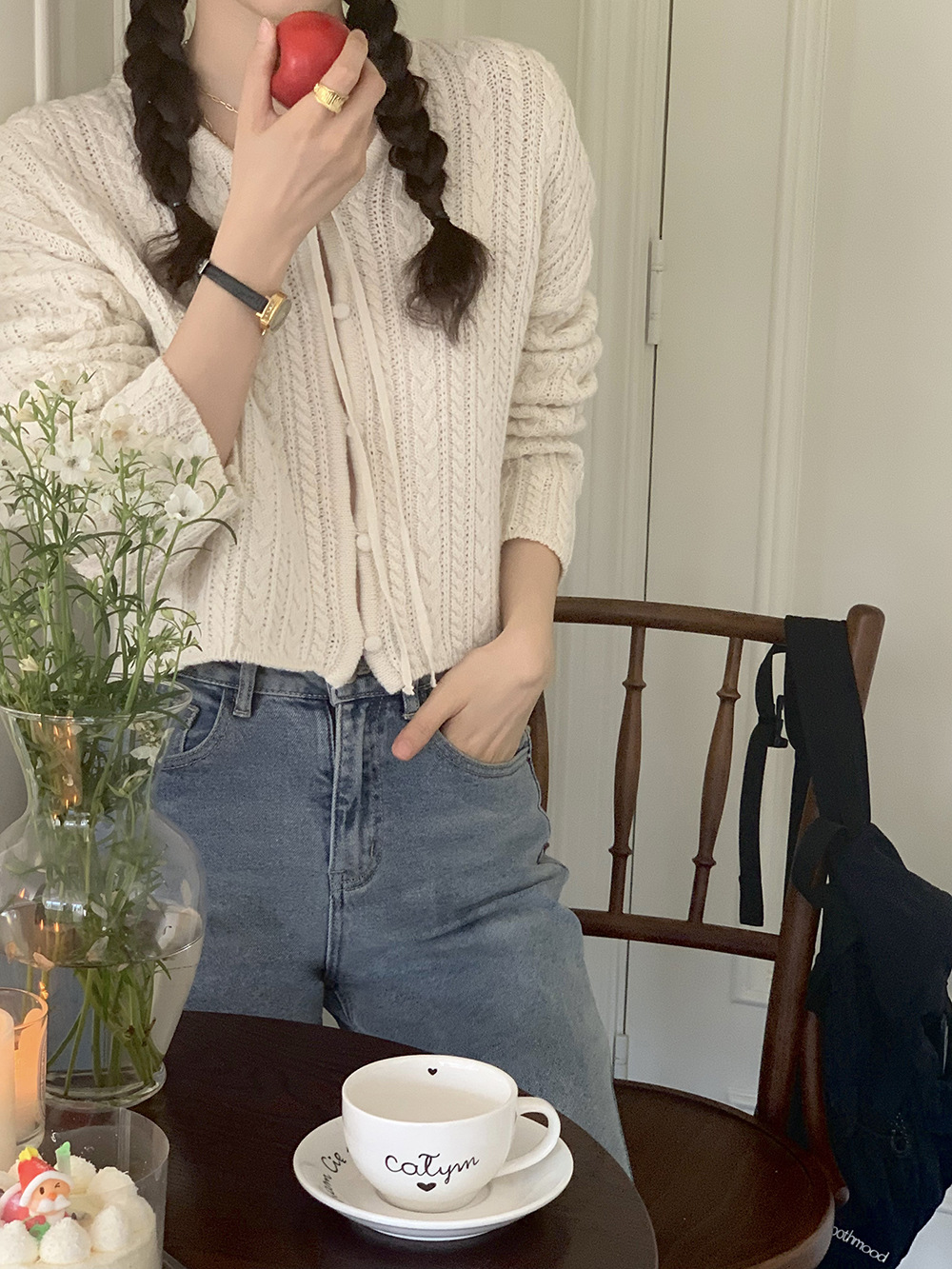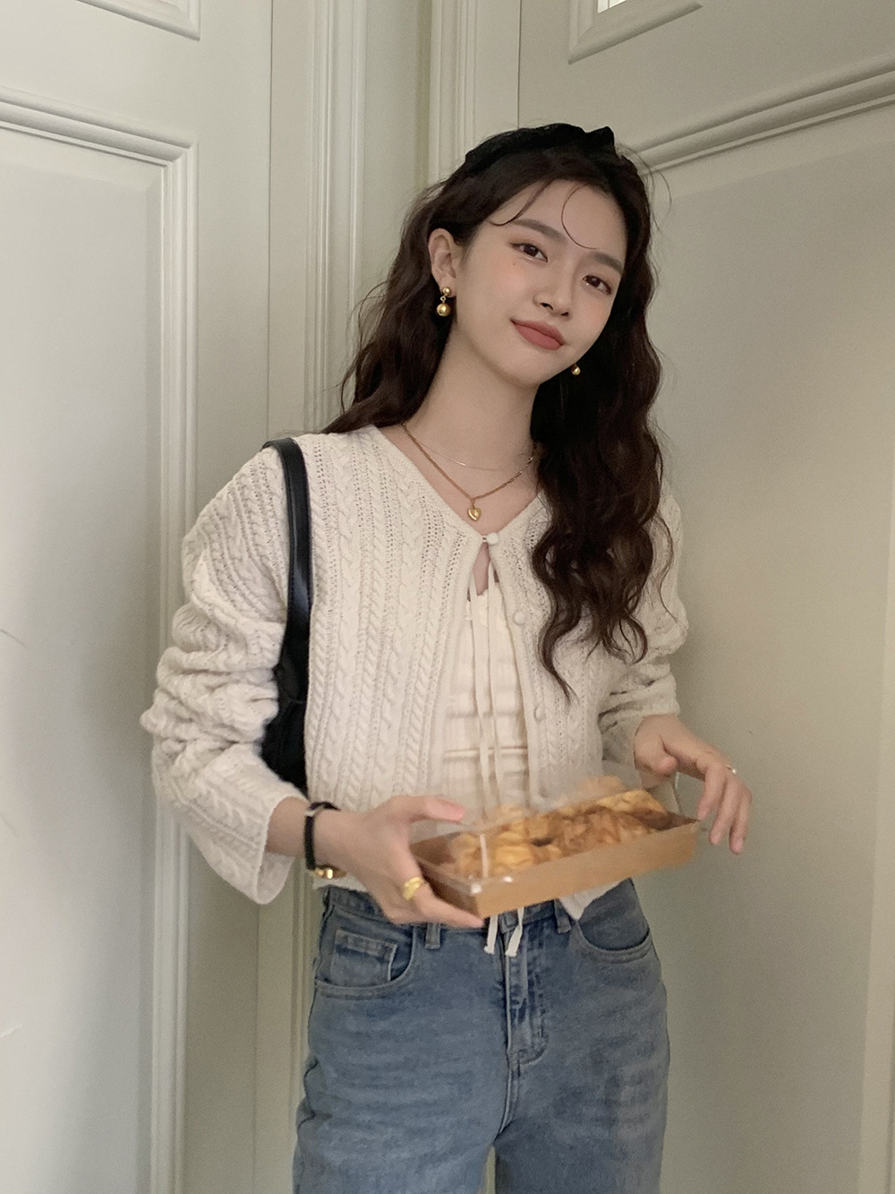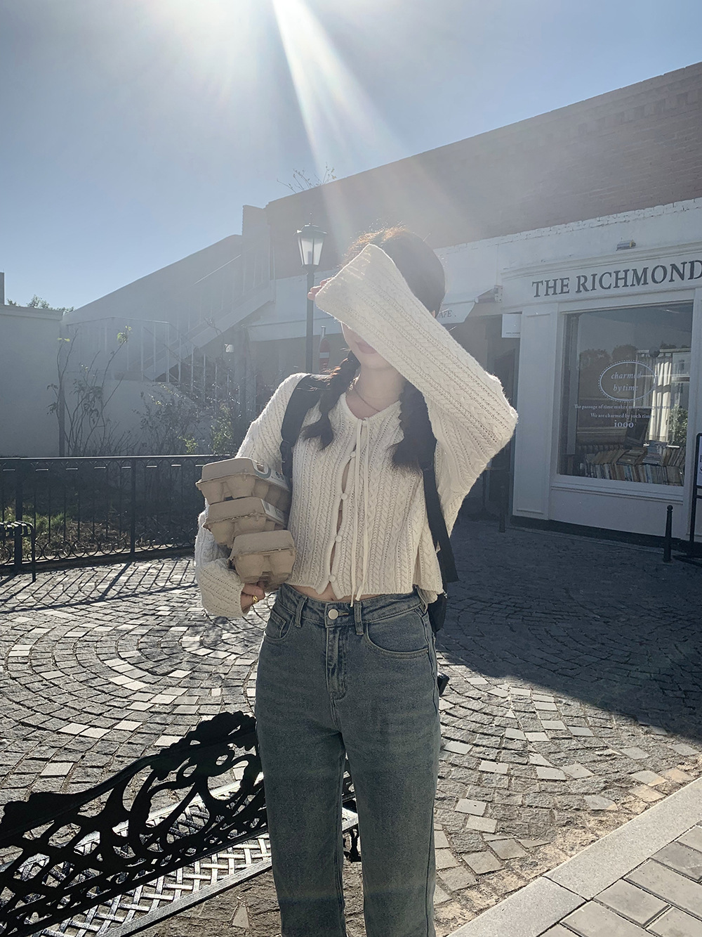 JMA-546 实拍2024秋冬韩版鬼马少女落肩麻花针织开衫甜美可爱系带毛衣外套