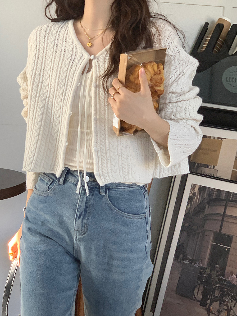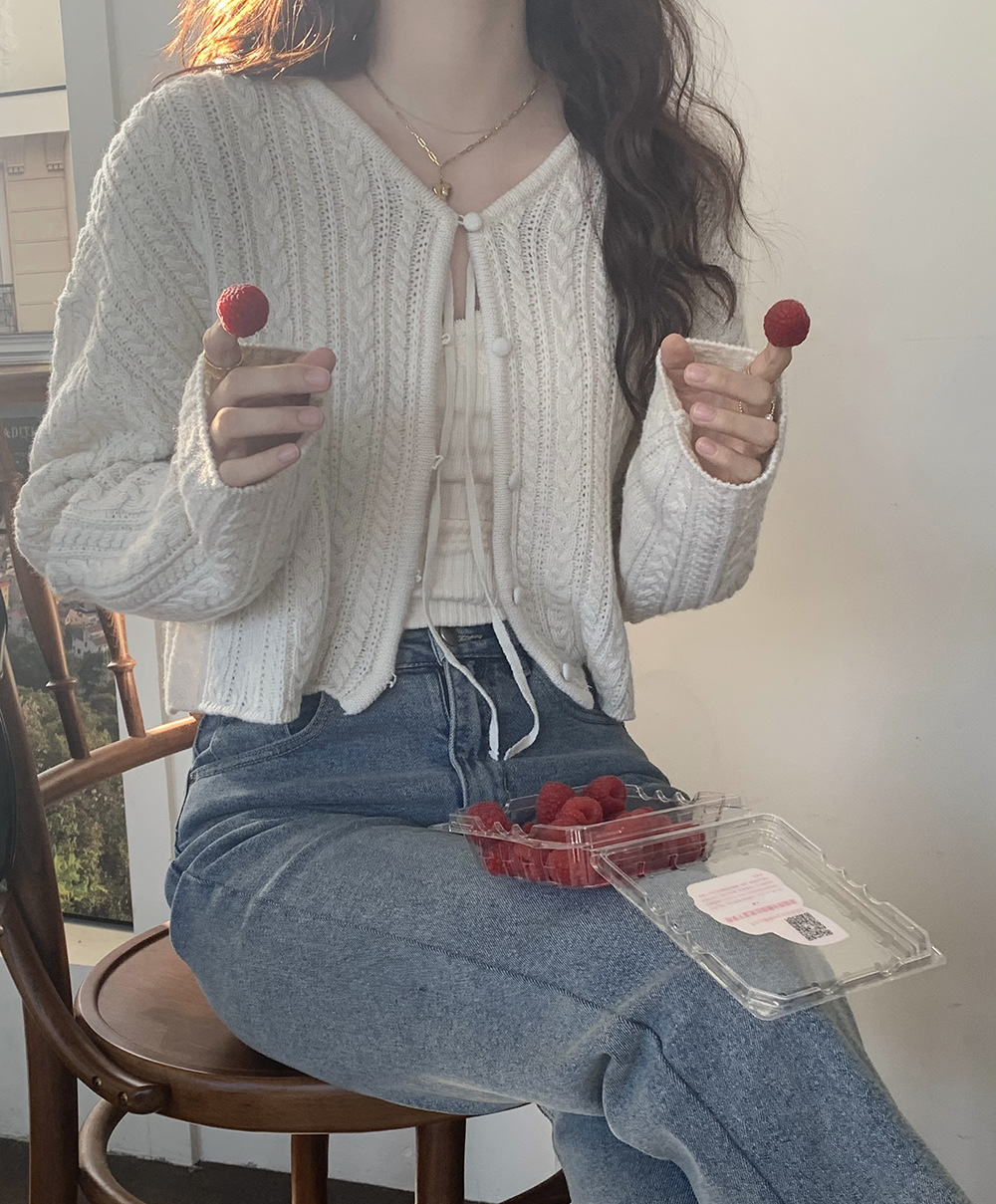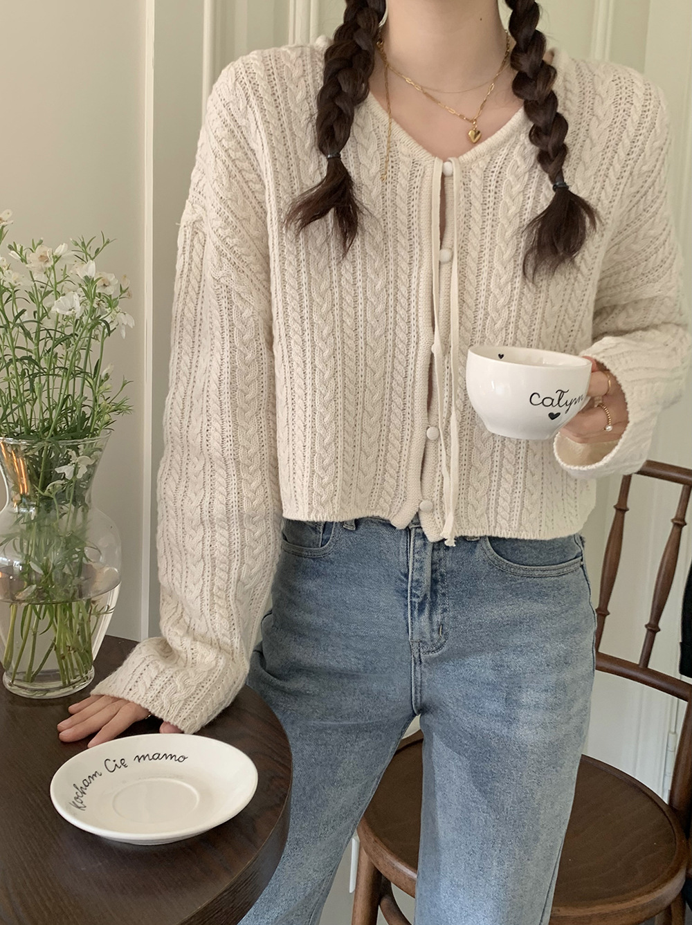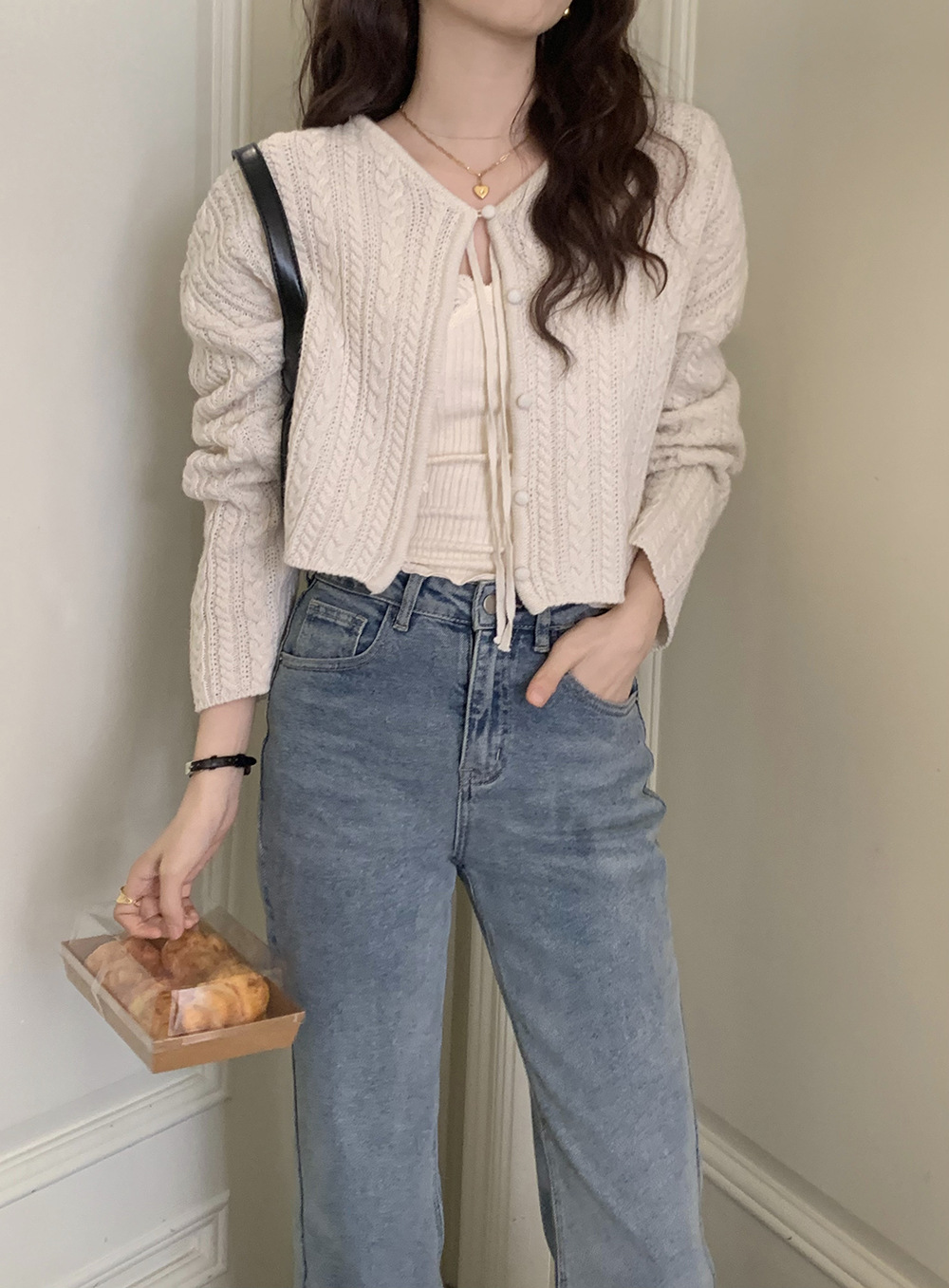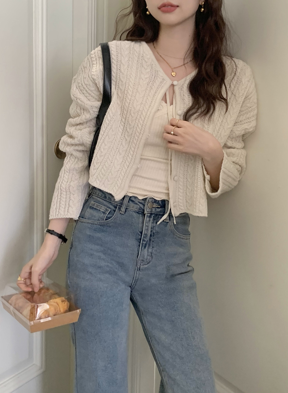 JMA-546 实拍2024秋冬韩版鬼马少女落肩麻花针织开衫甜美可爱系带毛衣外套