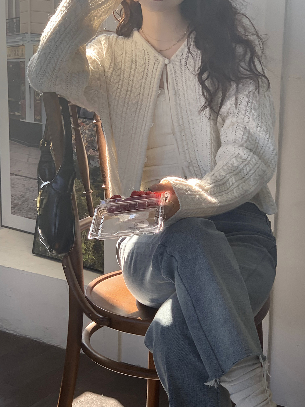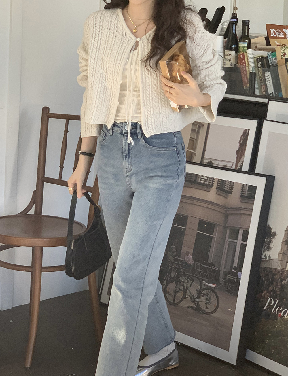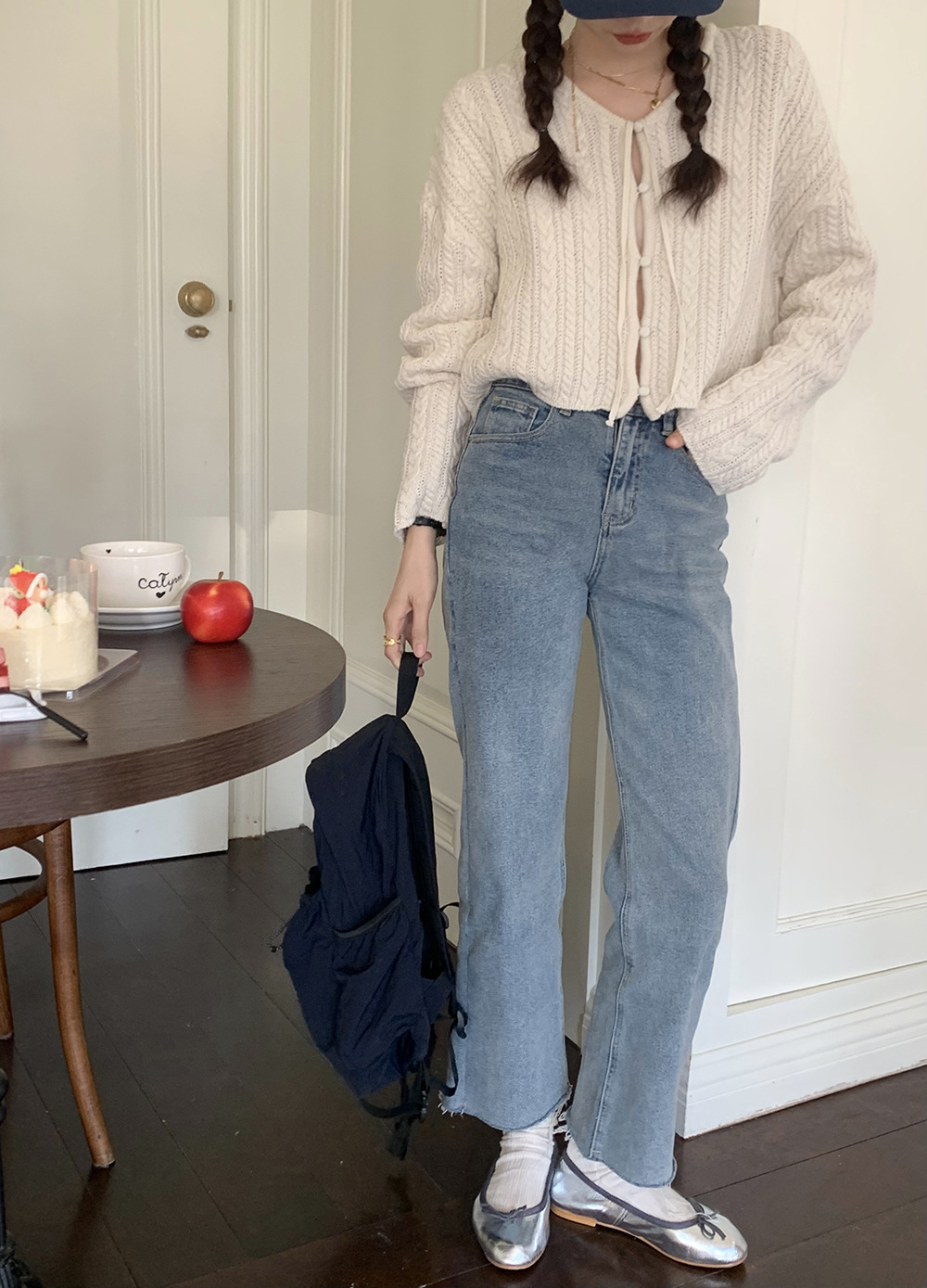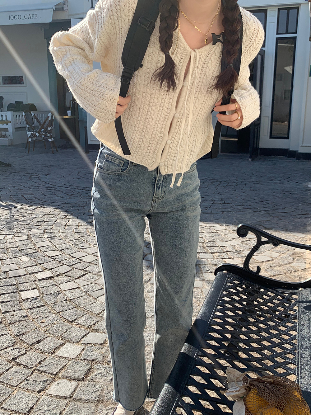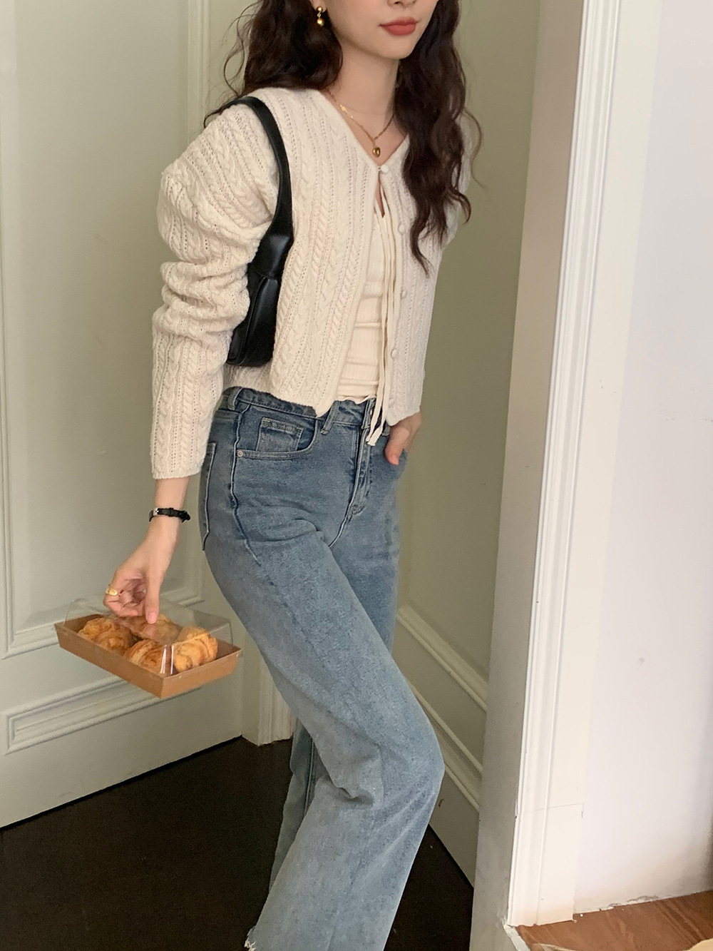 JMA-546 实拍2024秋冬韩版鬼马少女落肩麻花针织开衫甜美可爱系带毛衣外套