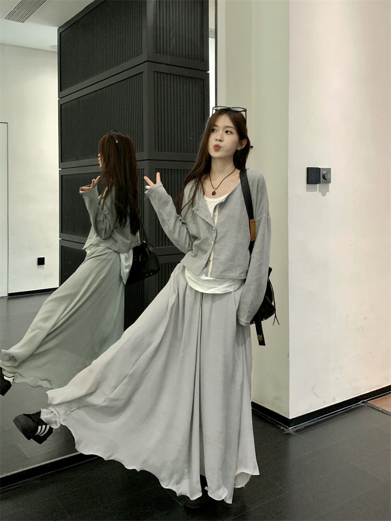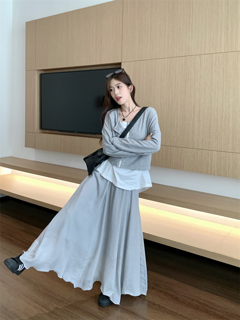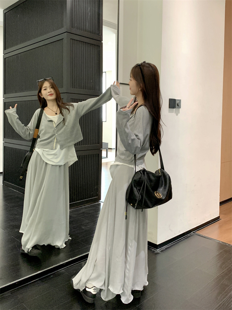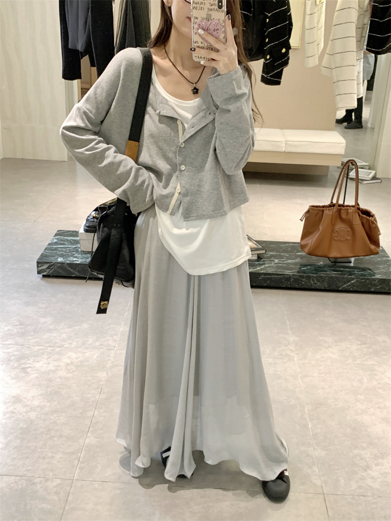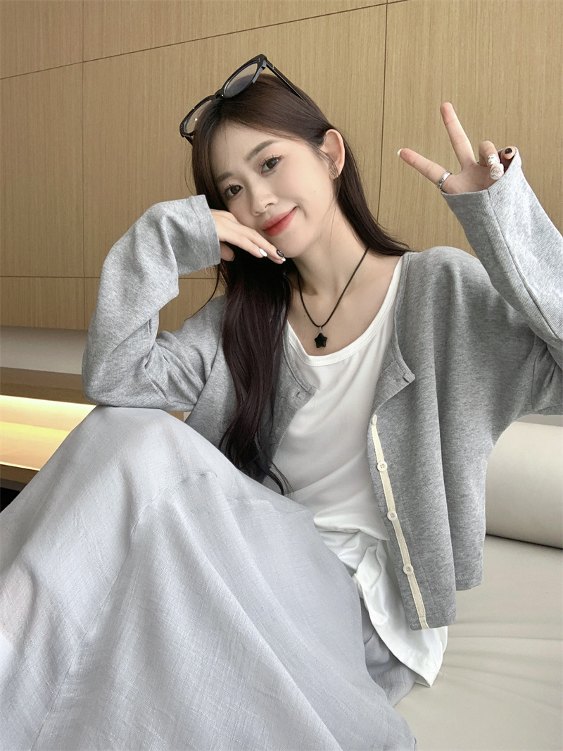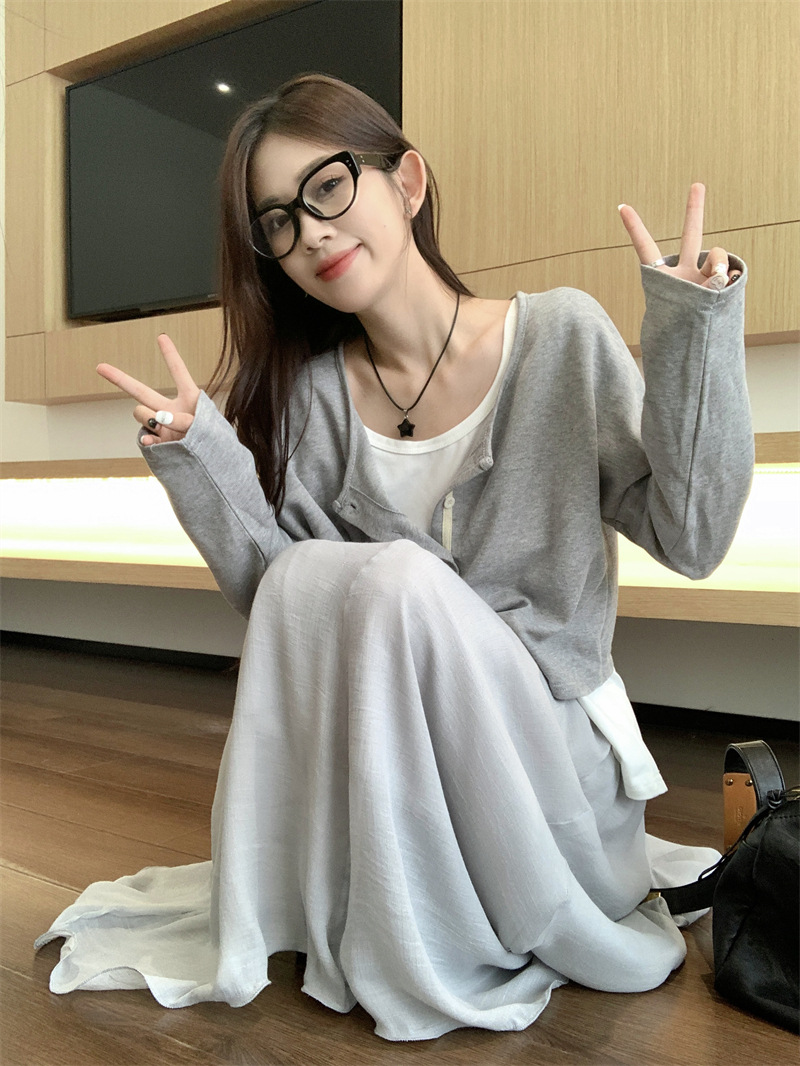 JMA-547 实拍 秋季韩版慵懒风宽松薄款针织防晒开衫外套+吊带背心+半身裙