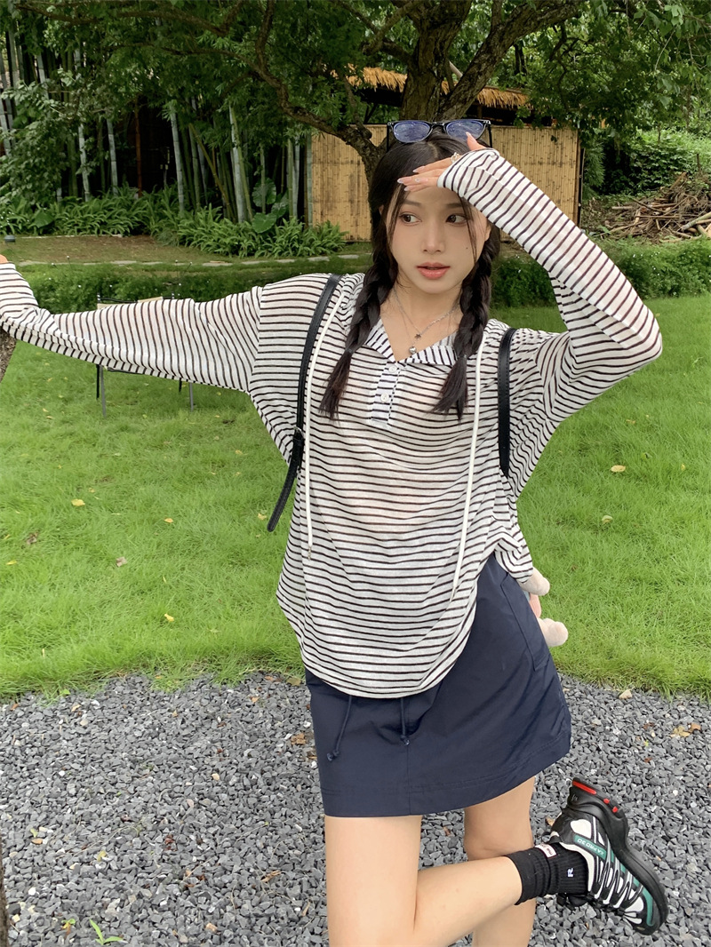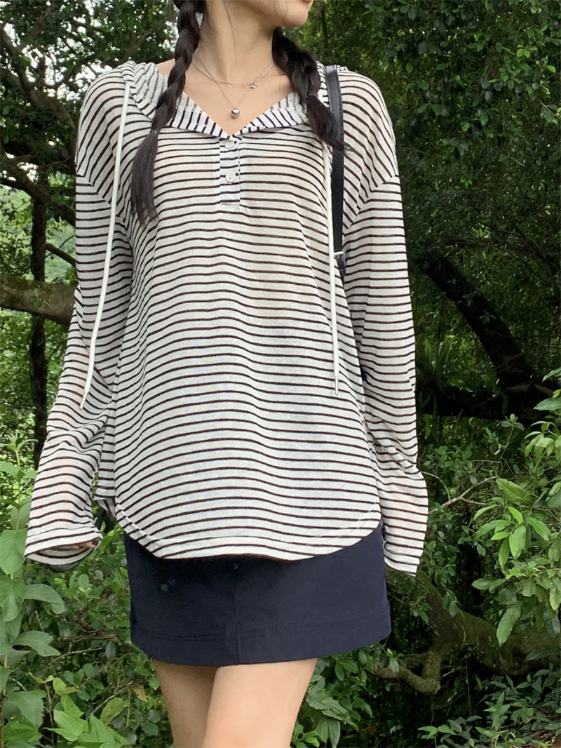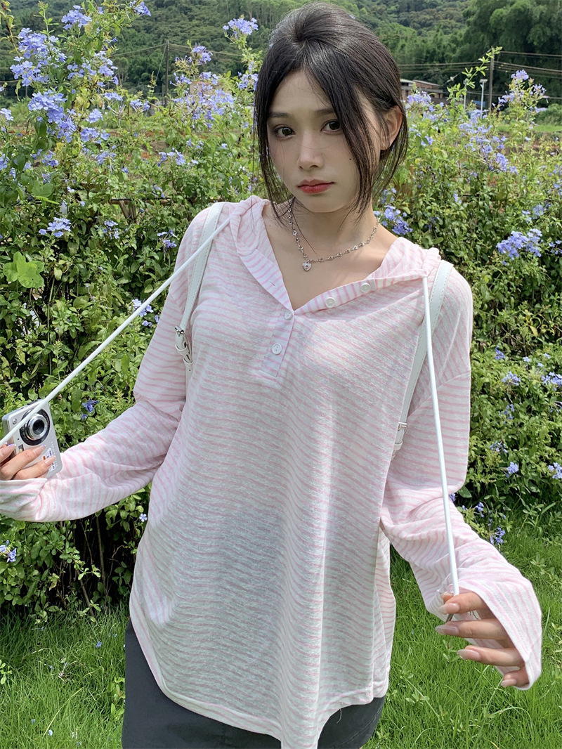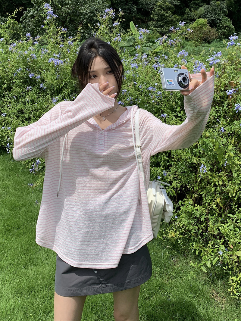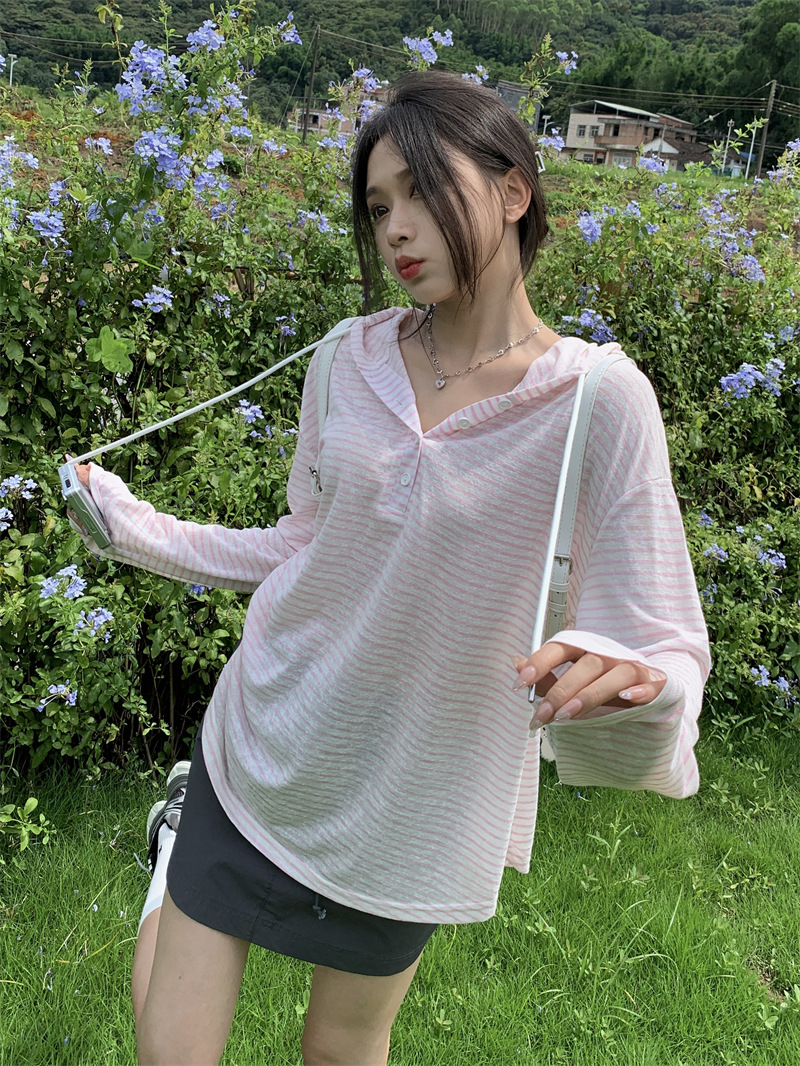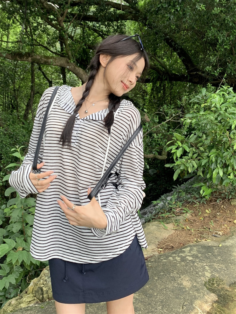 JMA-549 实拍 2024秋季韩版薄款条纹连帽设计感宽松显瘦休闲长袖T恤上衣女