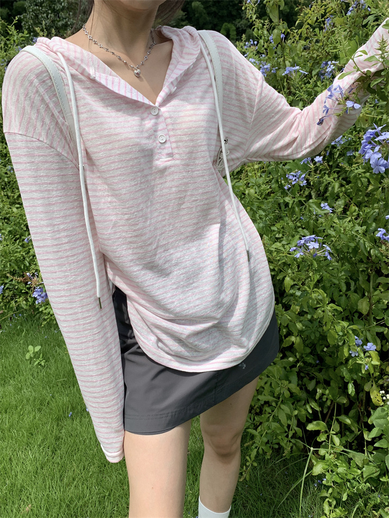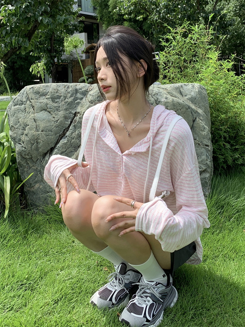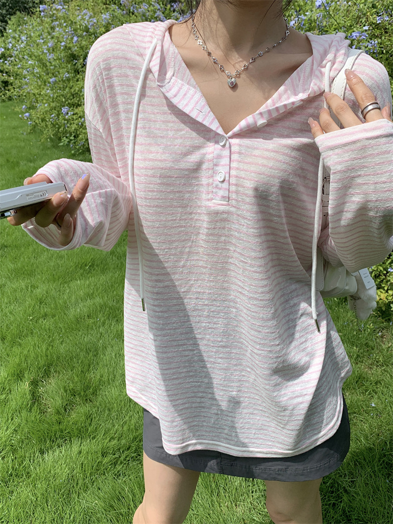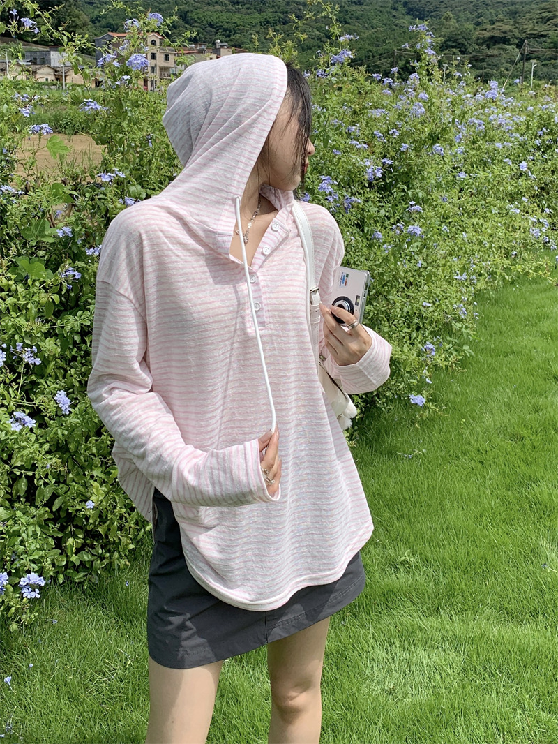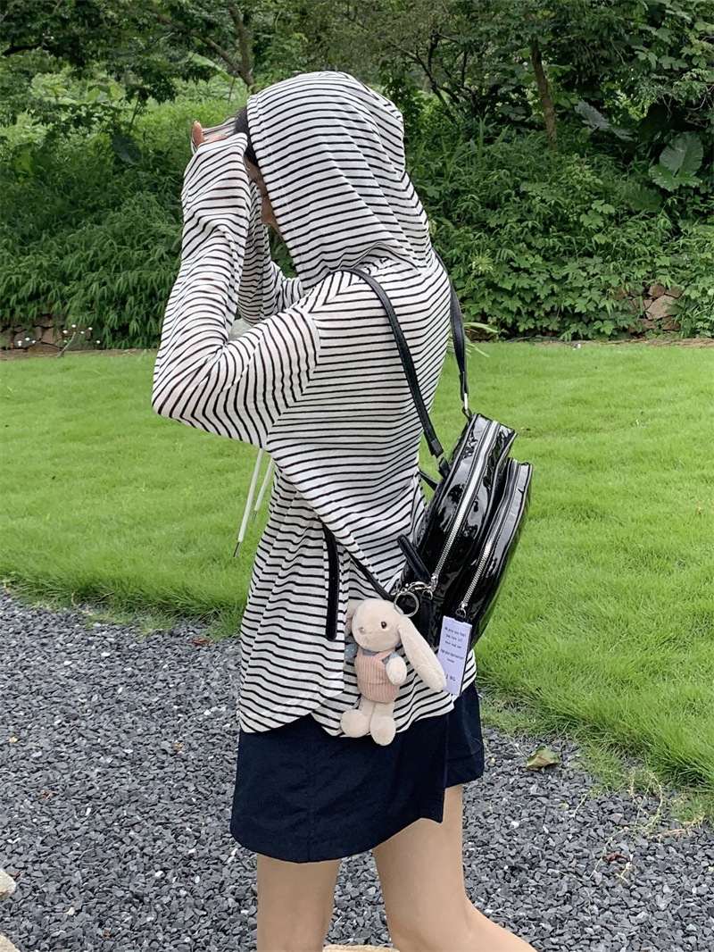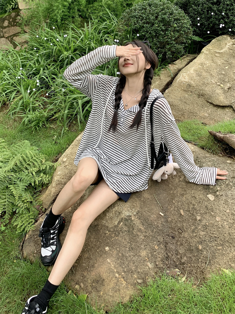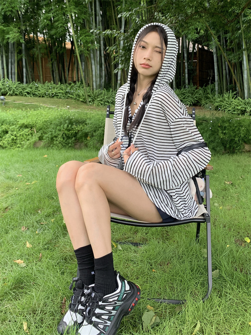 JMA-549 实拍 2024秋季韩版薄款条纹连帽设计感宽松显瘦休闲长袖T恤上衣女