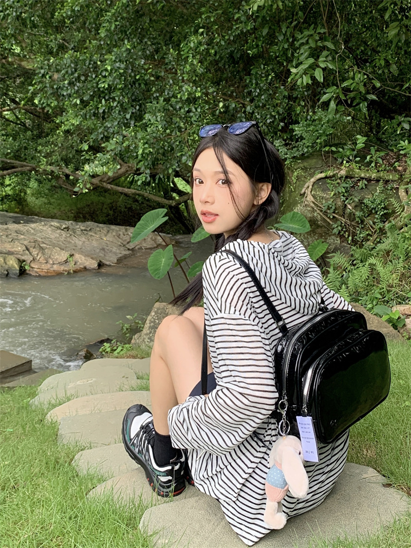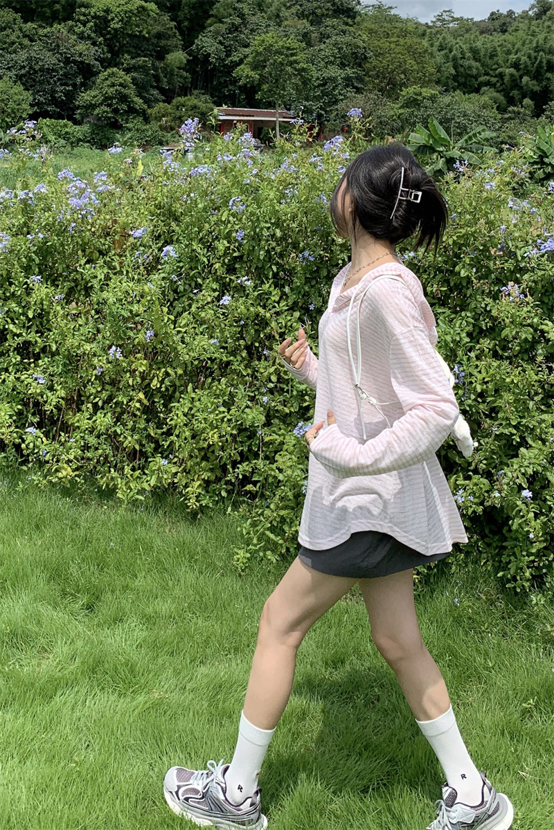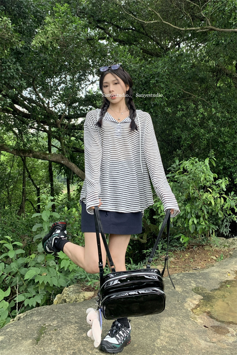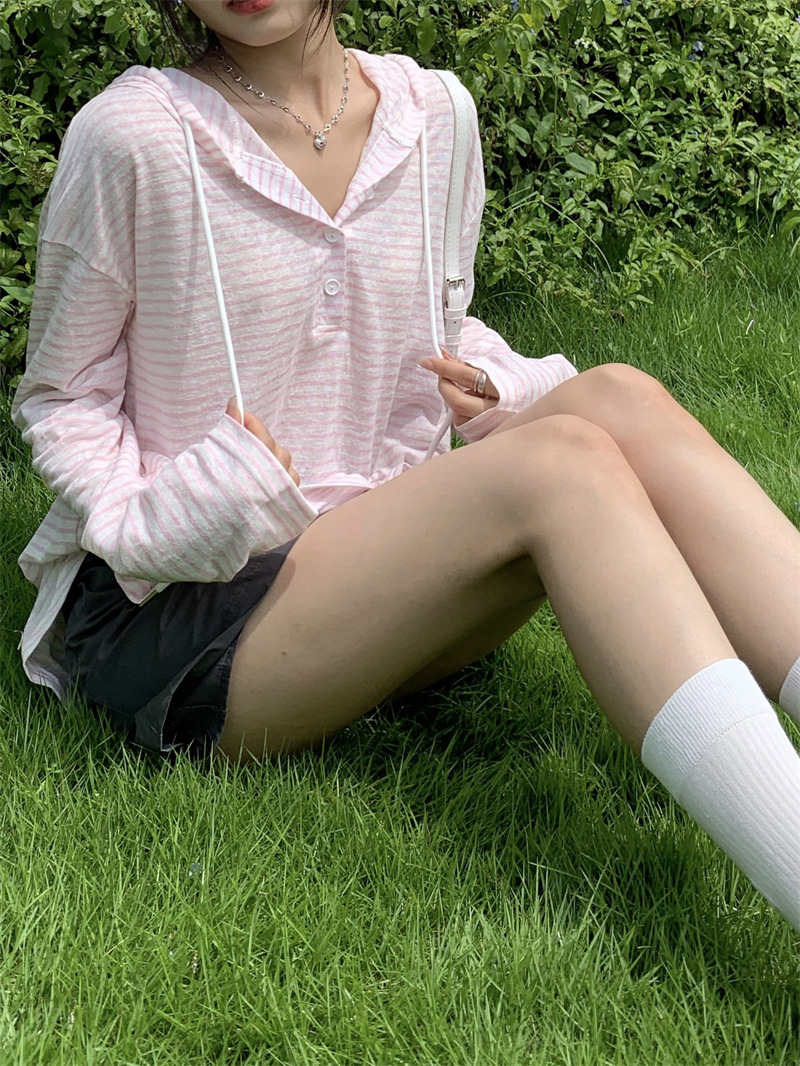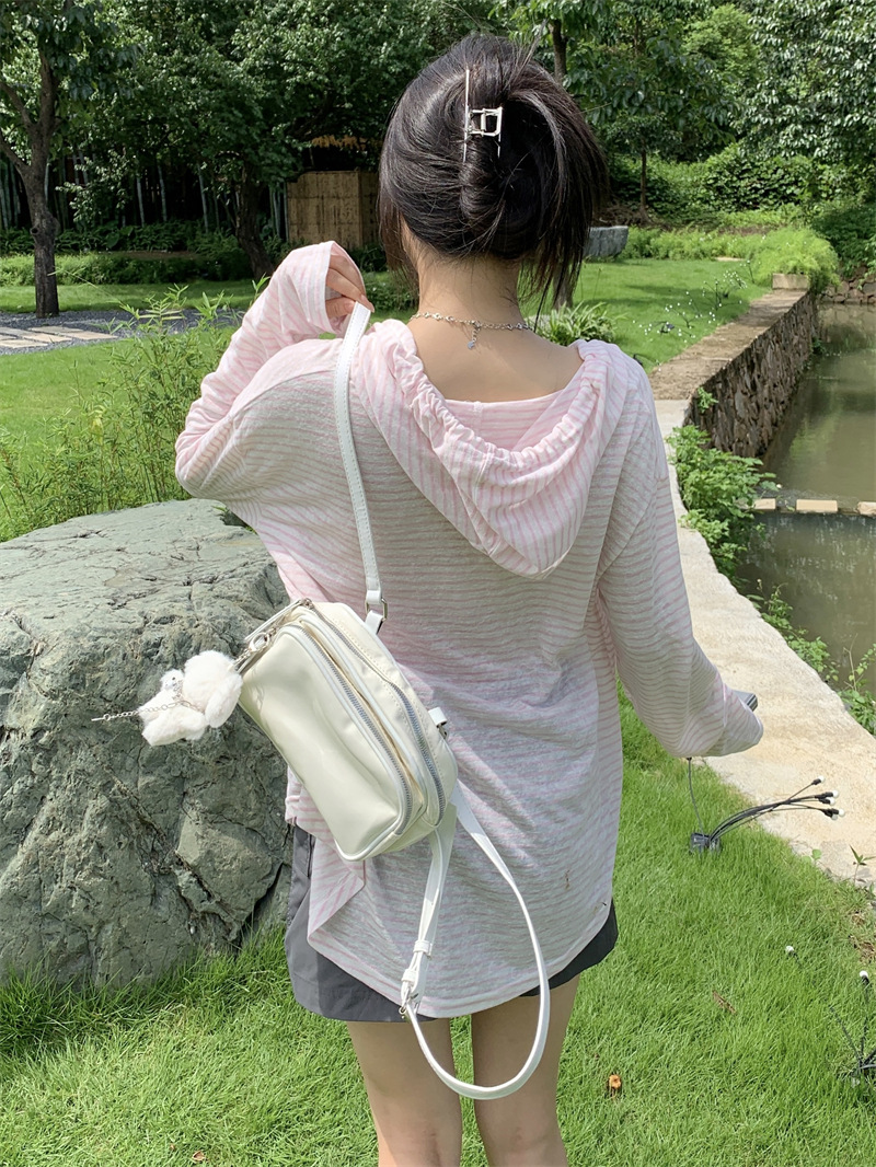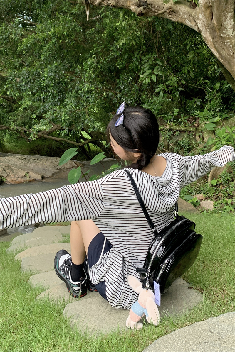 JMA-549 实拍 2024秋季韩版薄款条纹连帽设计感宽松显瘦休闲长袖T恤上衣女