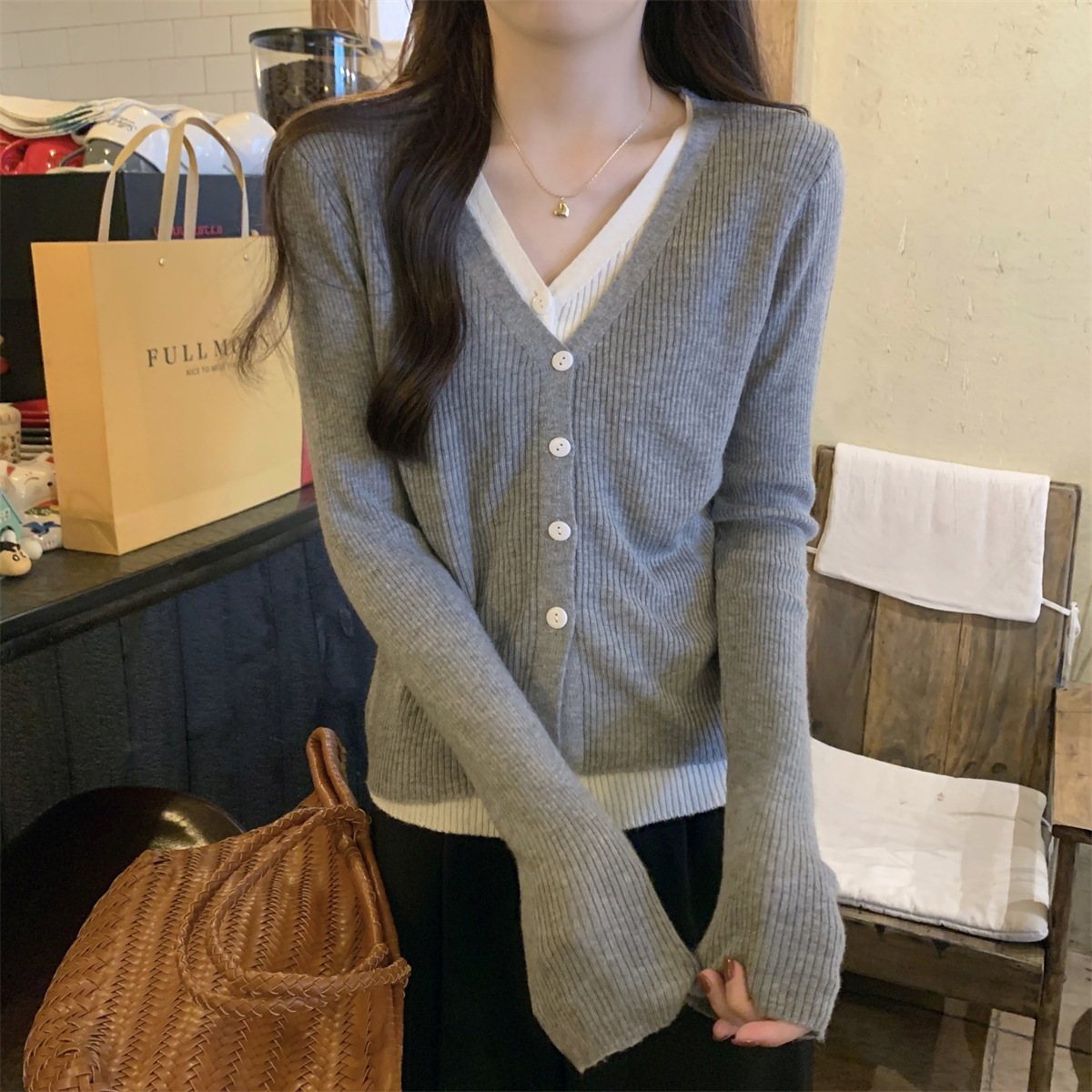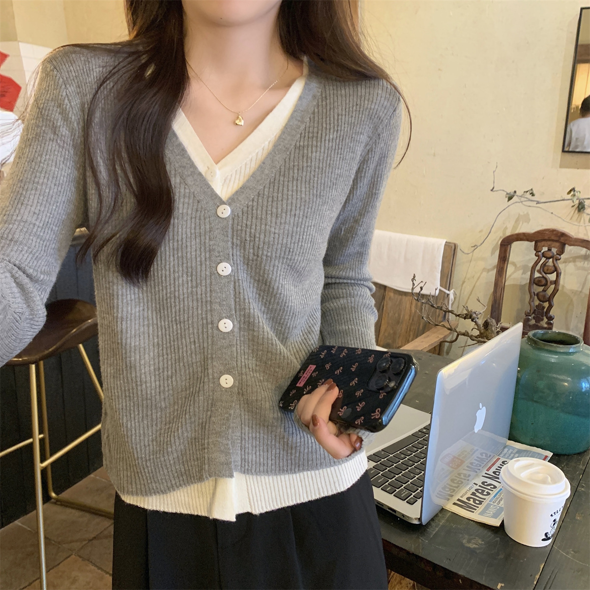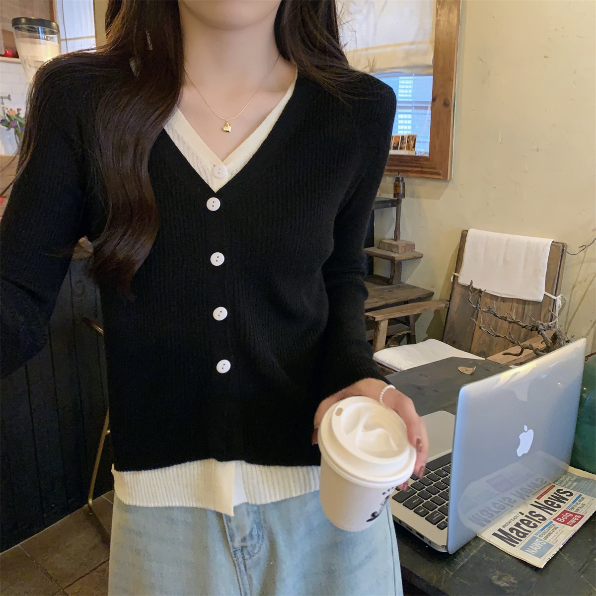JMA-554 实拍 2024秋冬韩版v领假两件撞色软糯针织衫开衫女长袖簿毛衣外套
