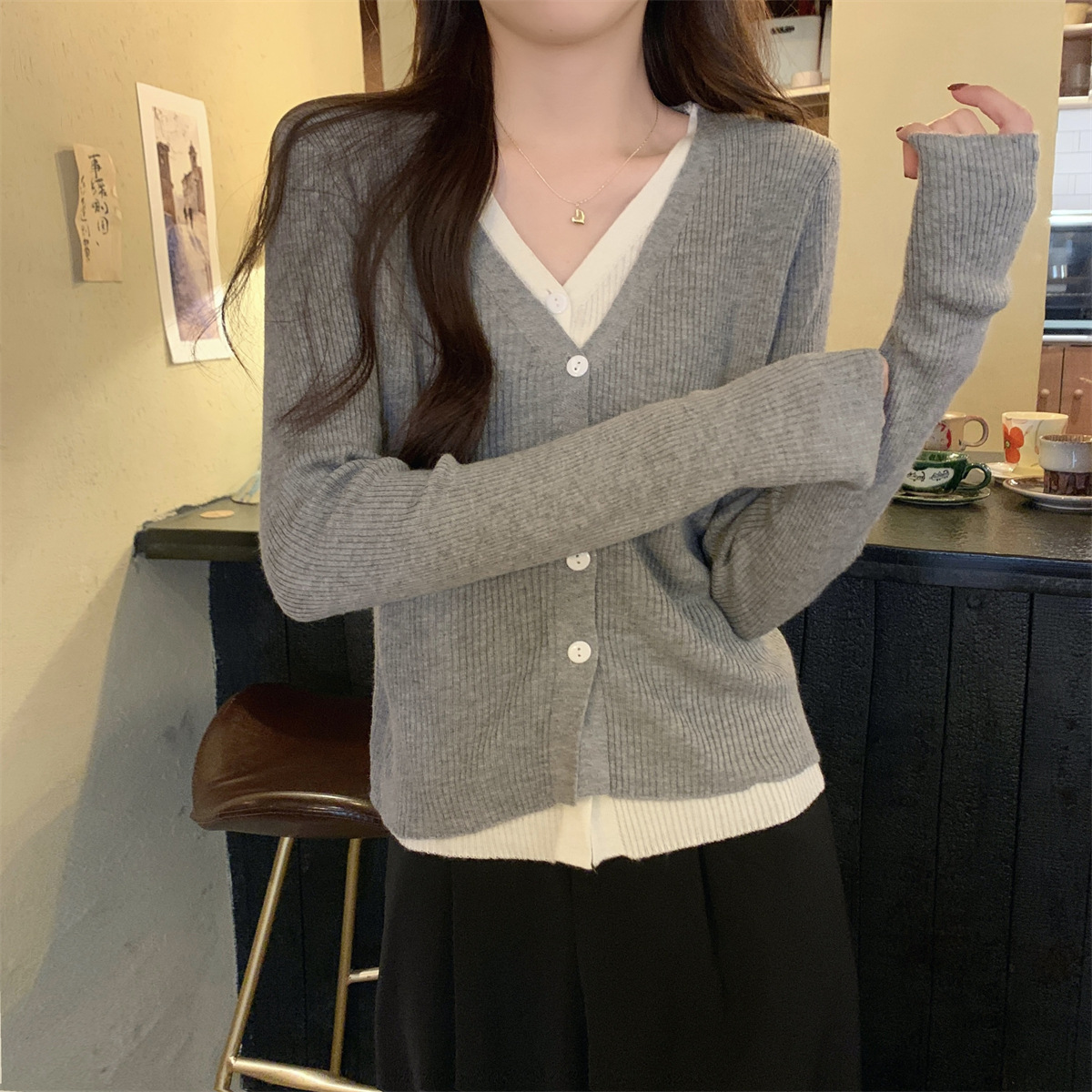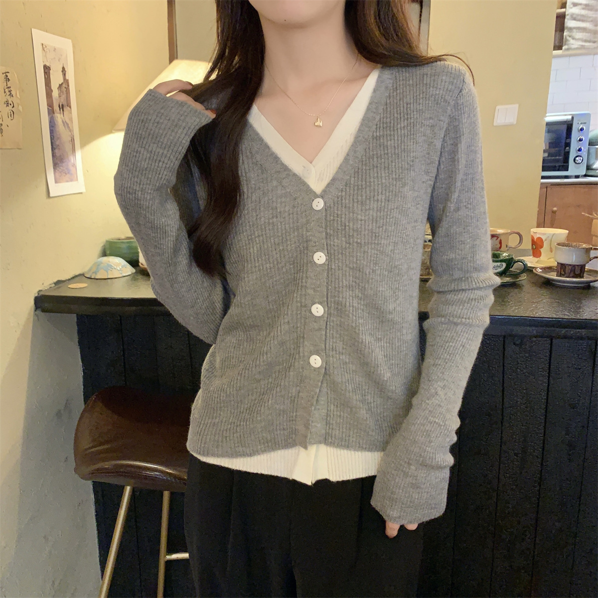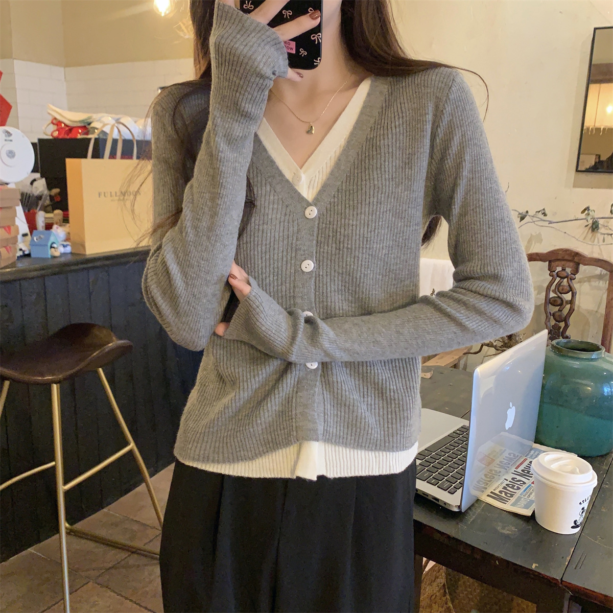 JMA-554 实拍 2024秋冬韩版v领假两件撞色软糯针织衫开衫女长袖簿毛衣外套