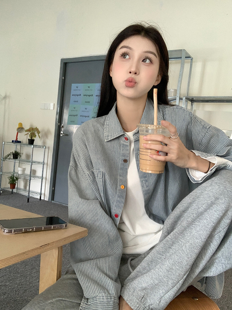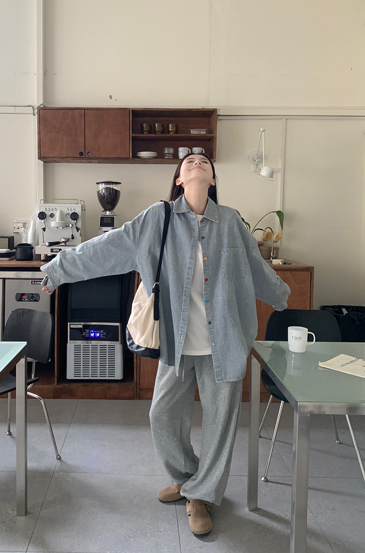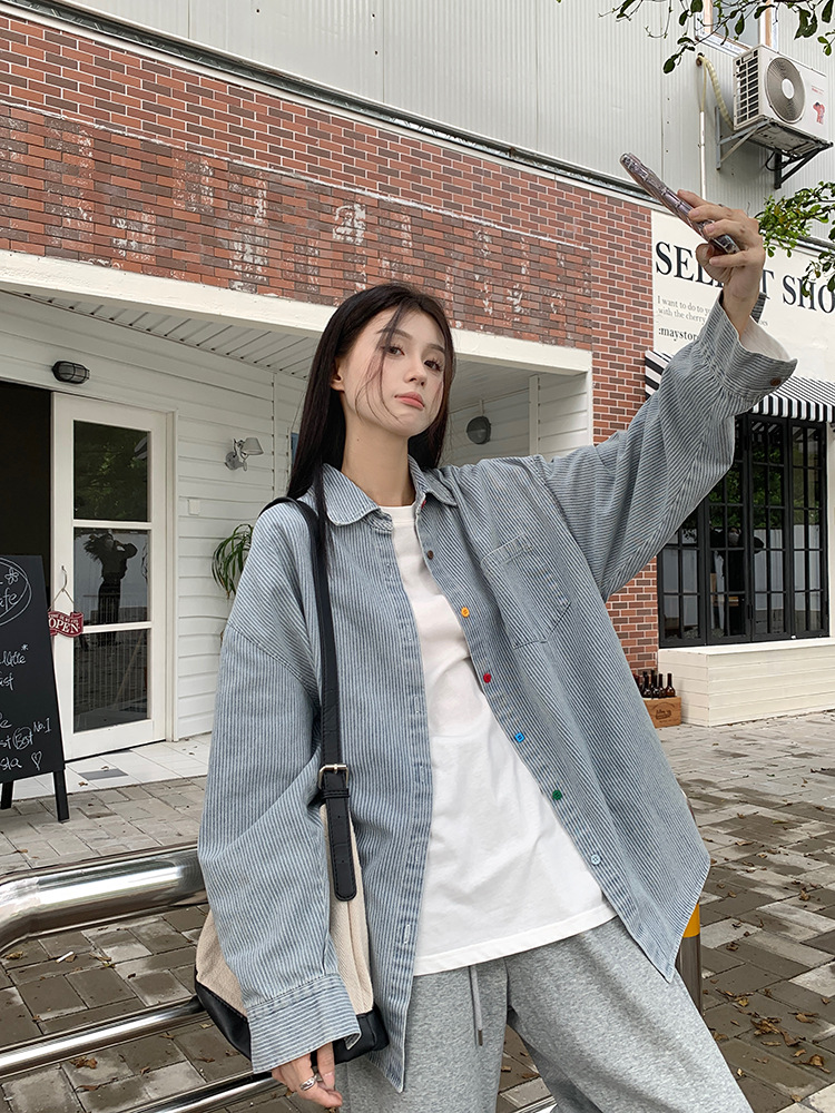 JMA-556 实拍2024秋季彩色扣设计感小众蓝白条纹水洗牛仔宽松长袖衬衫外套