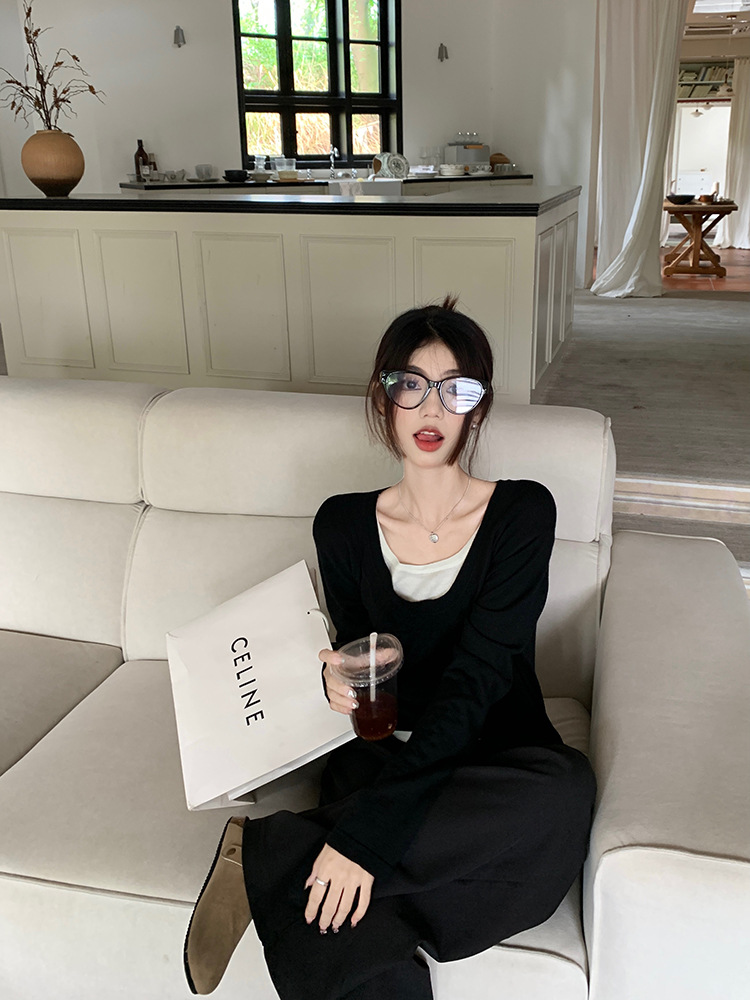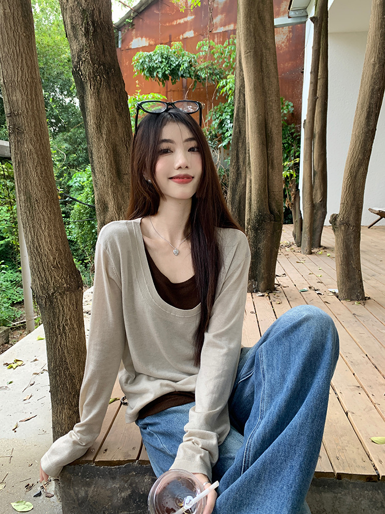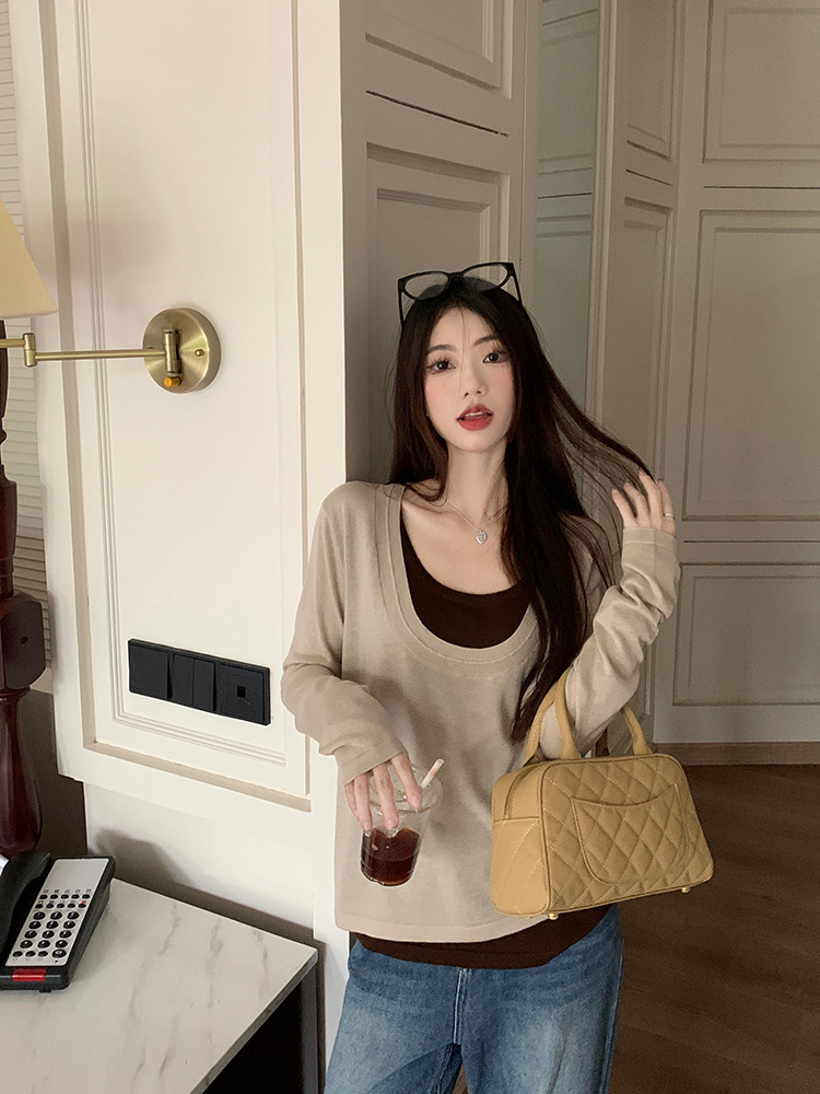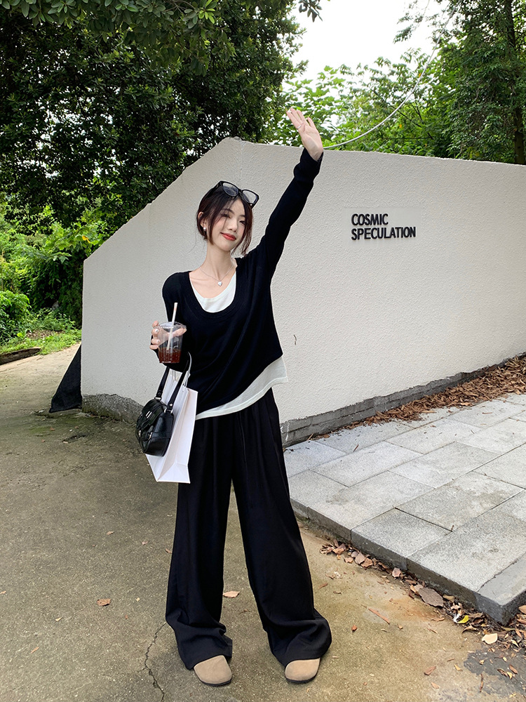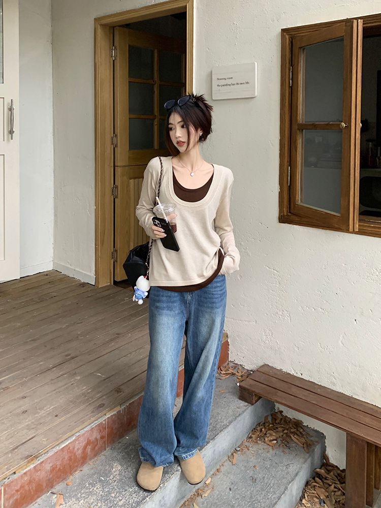 JMA-557 实拍2024秋季新款韩版撞色假两件针织衫上衣慵懒风设计感簿毛衣女