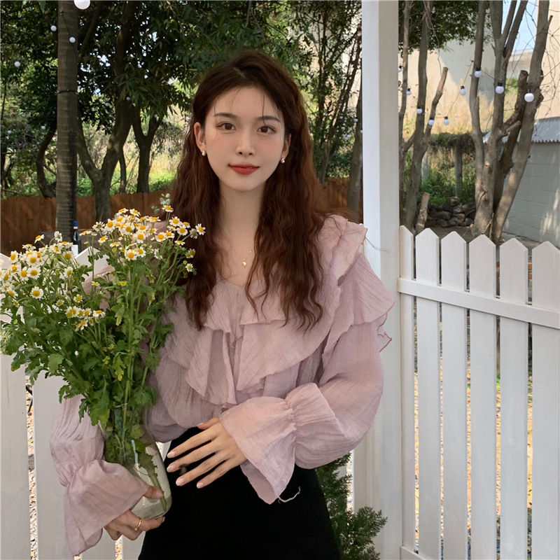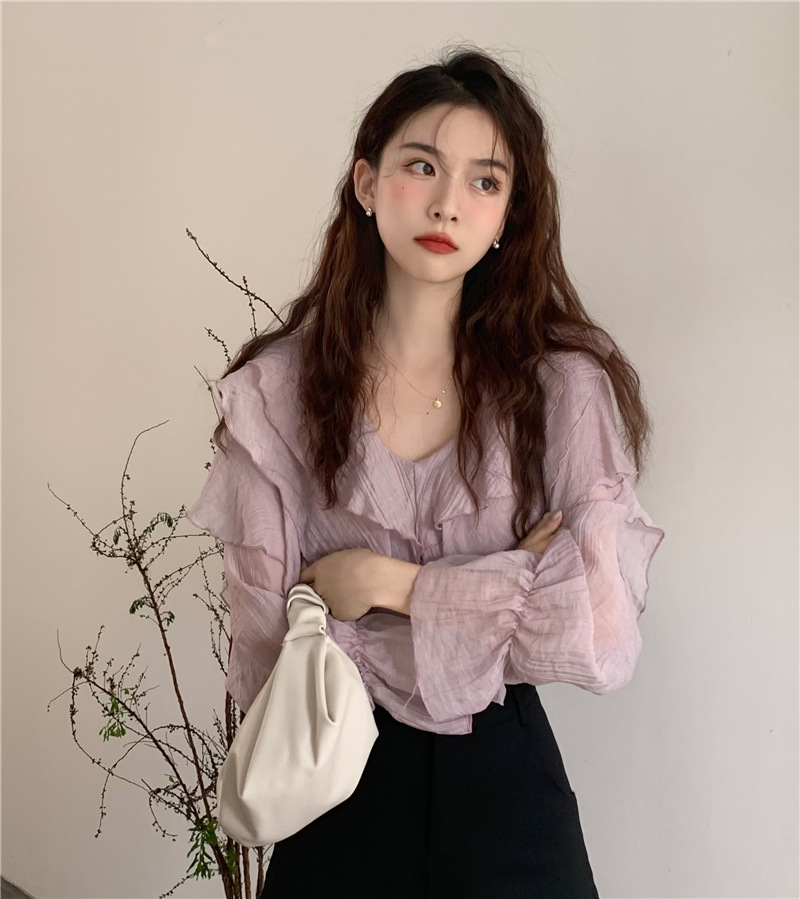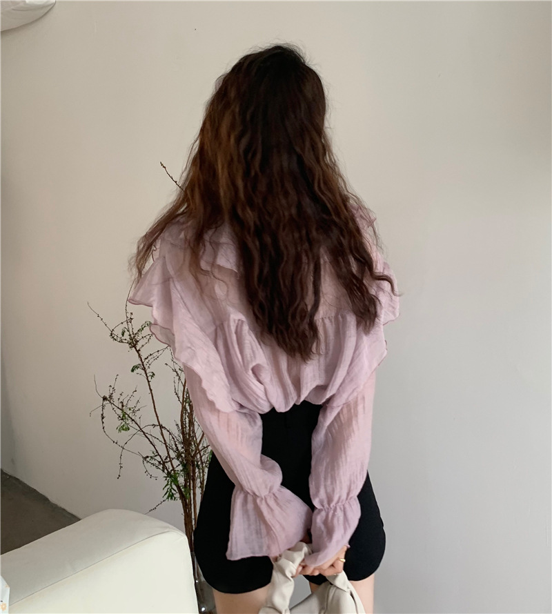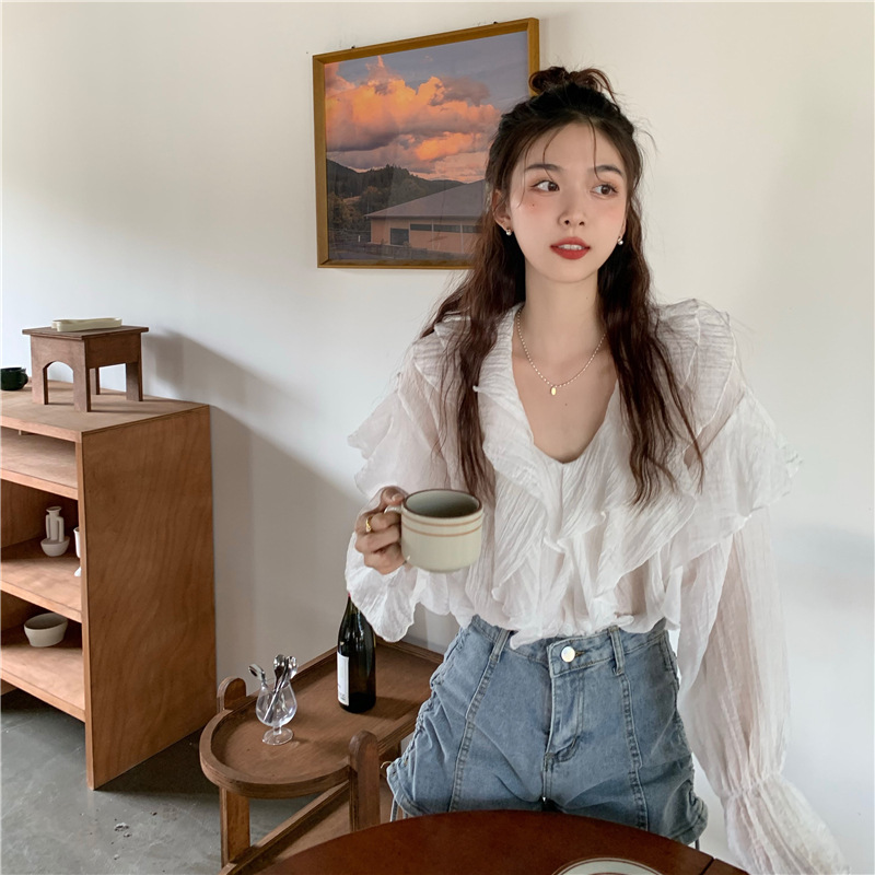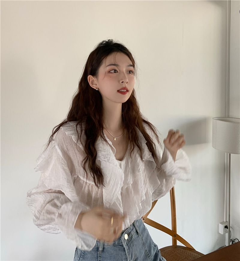 JMA-571 实拍 2024春季新款韩系小众荷叶边V领长袖防晒衬衫女气质上衣