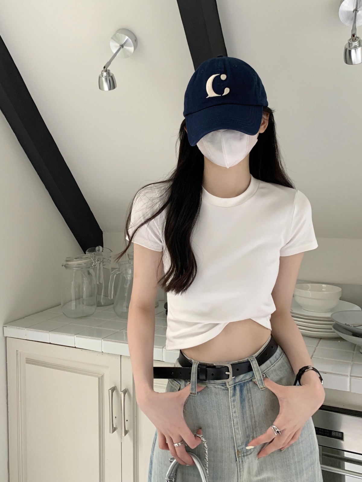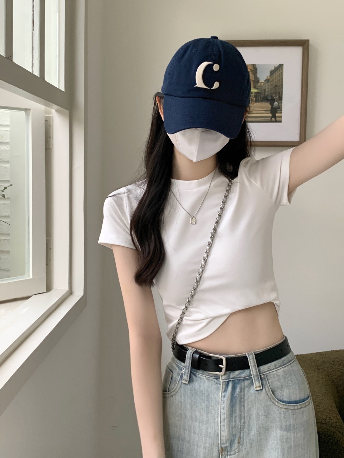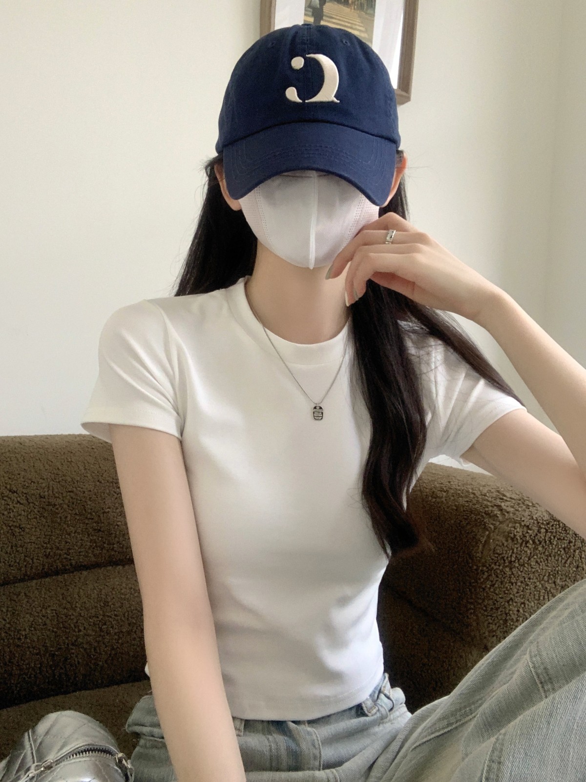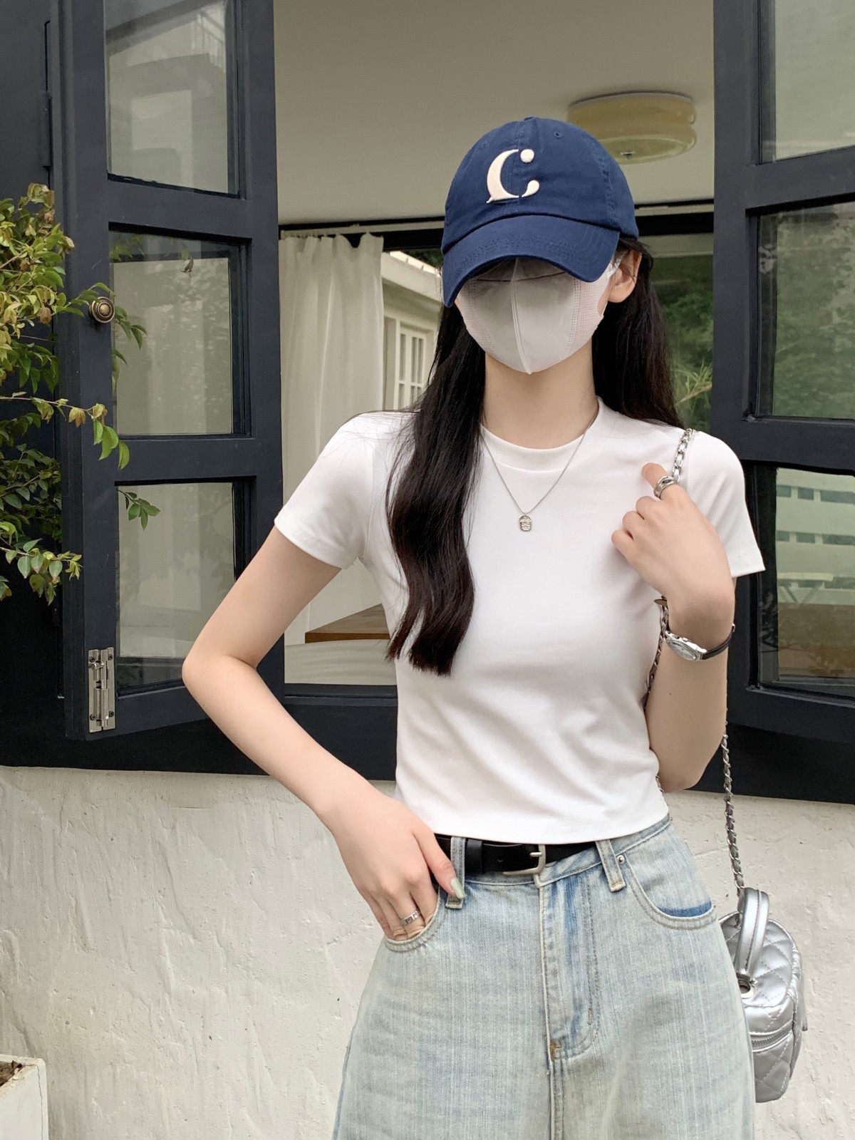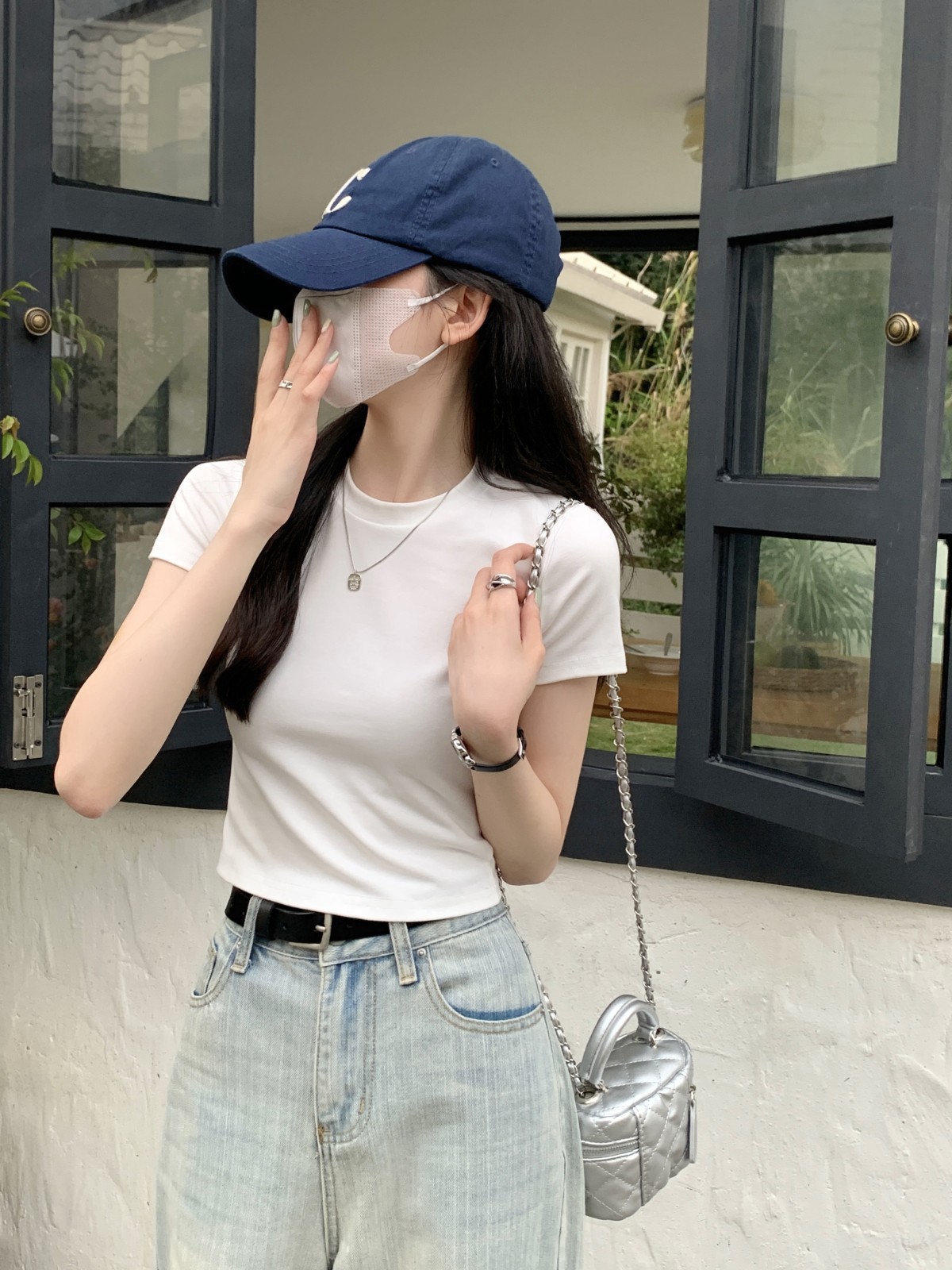 JMA-580 实拍 修身短款白色正肩T恤女2023夏季新款小个子打底短袖体恤上衣