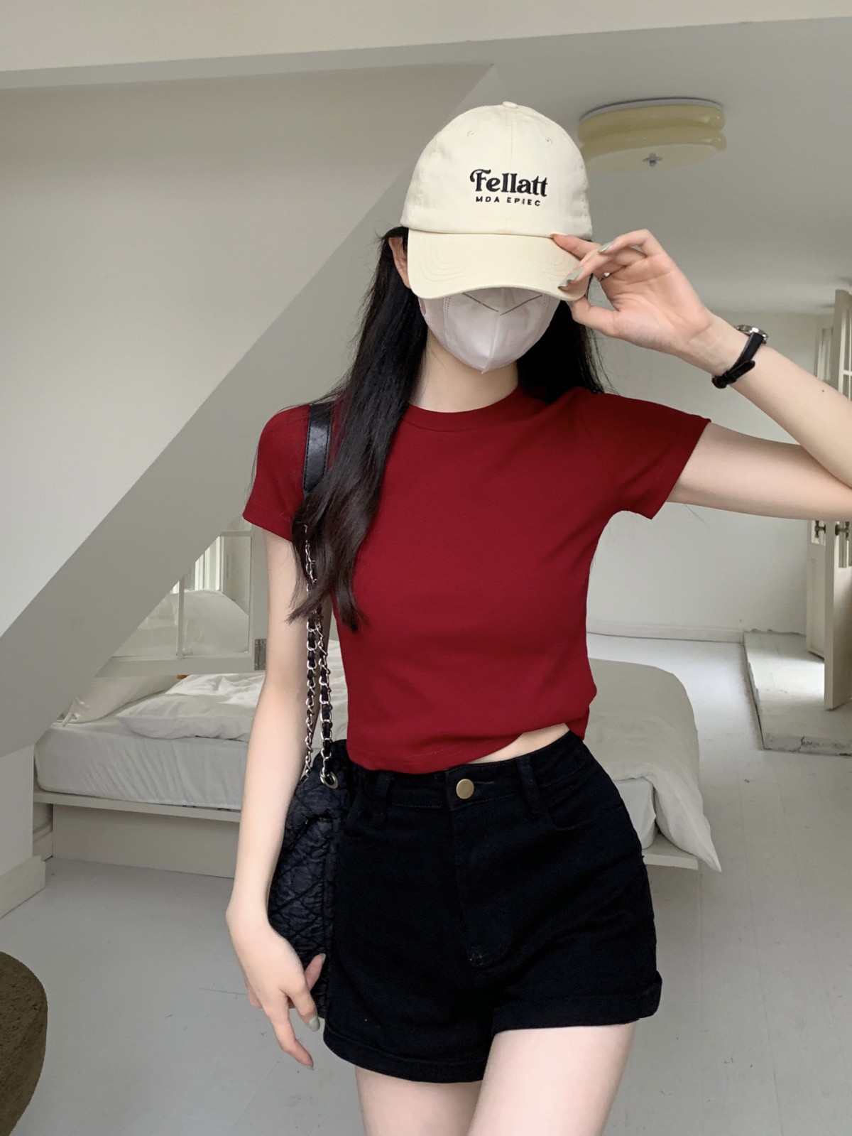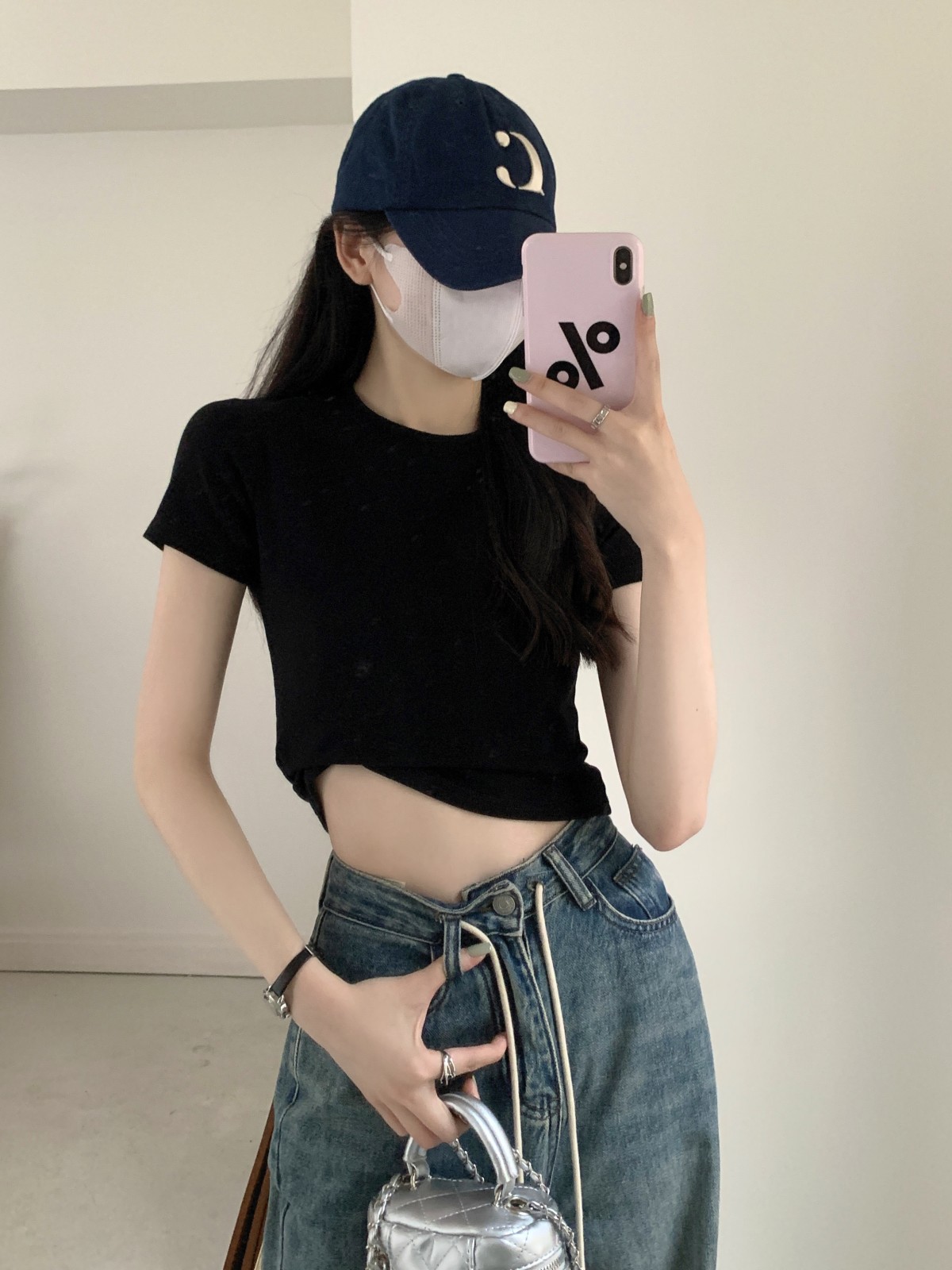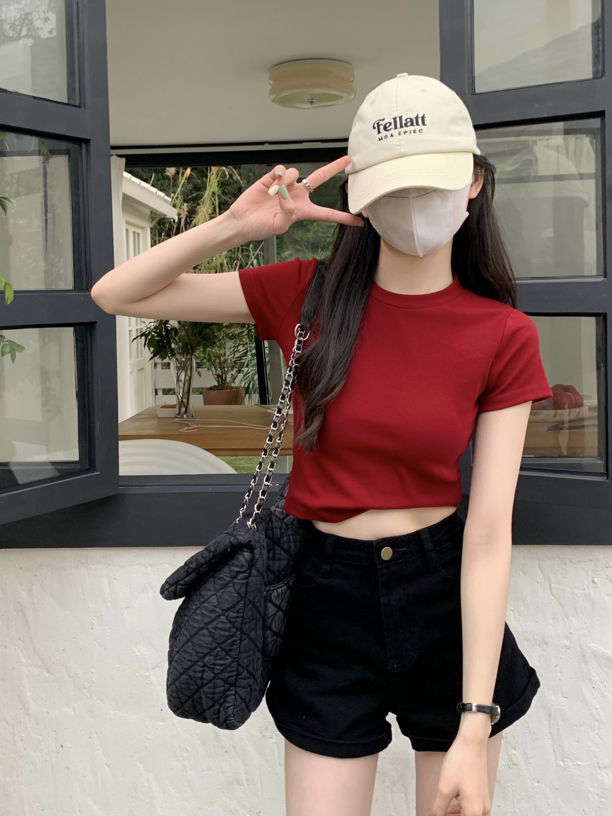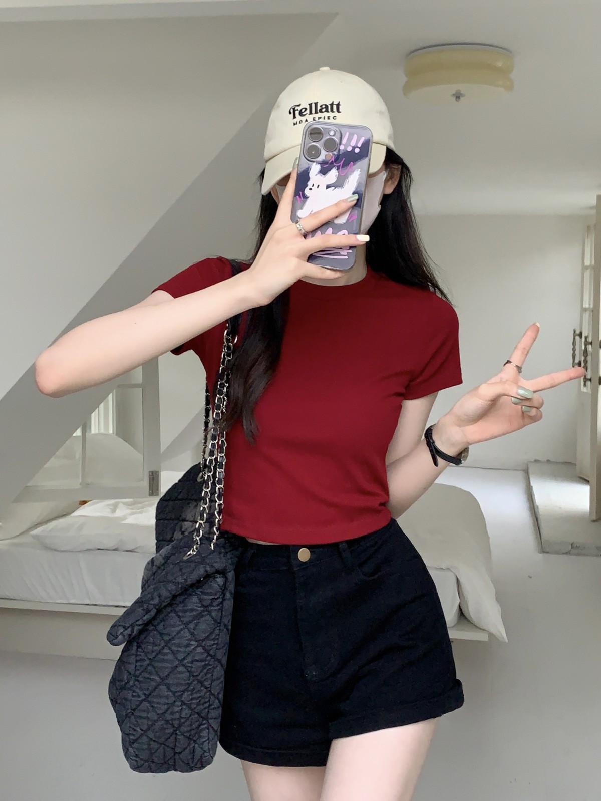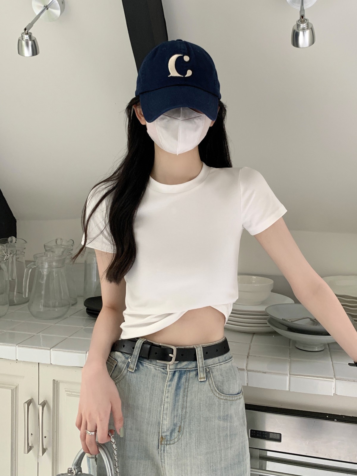 JMA-580 实拍 修身短款白色正肩T恤女2023夏季新款小个子打底短袖体恤上衣
