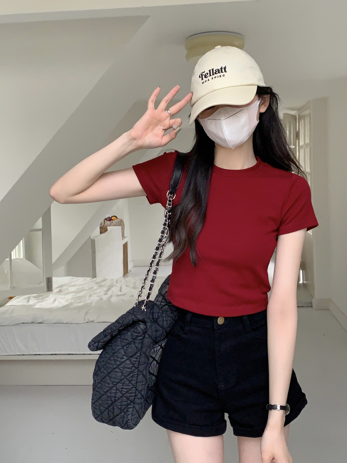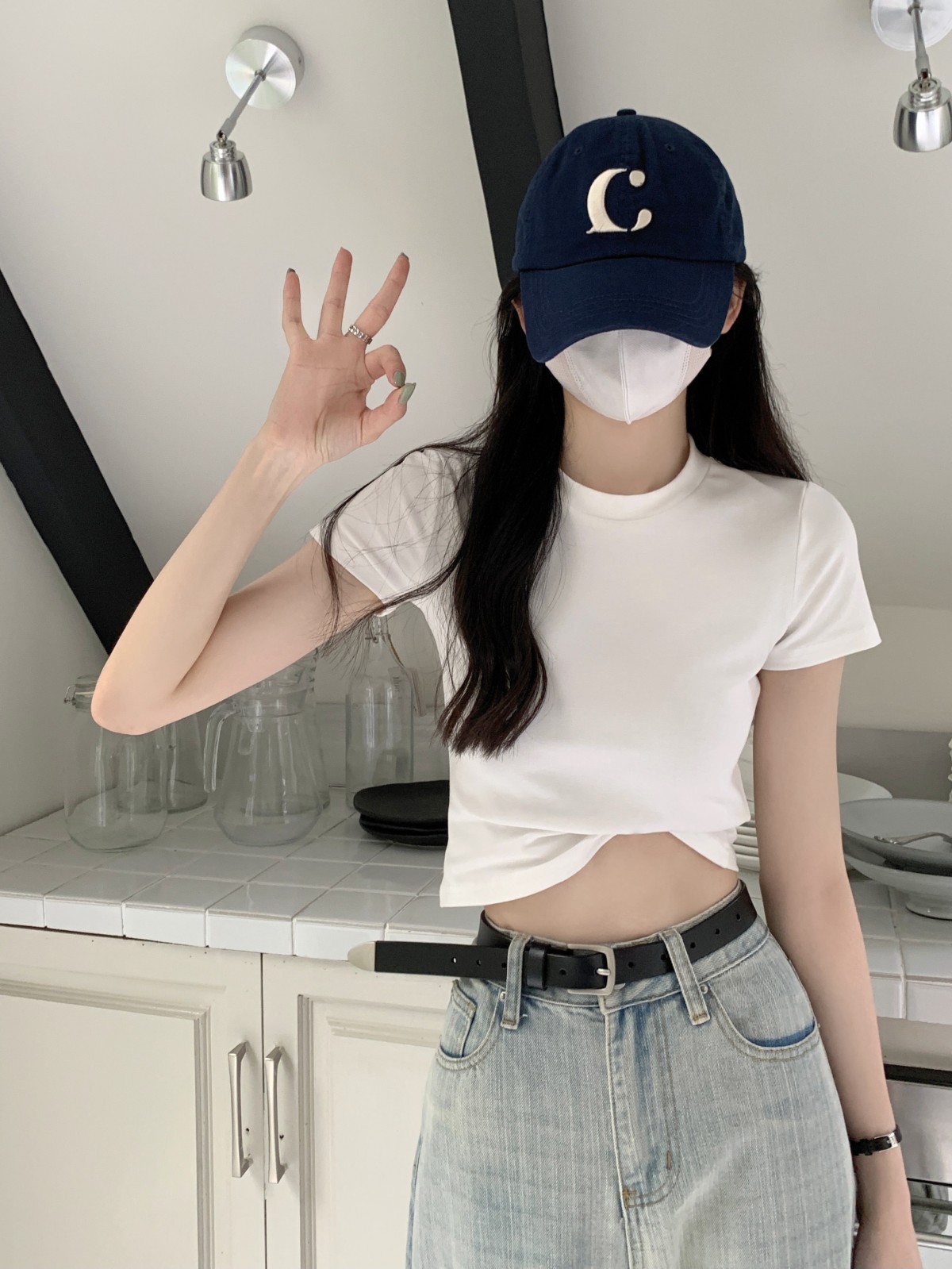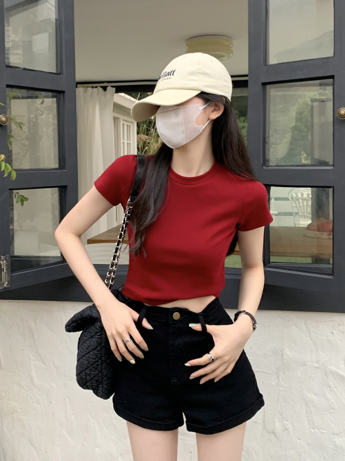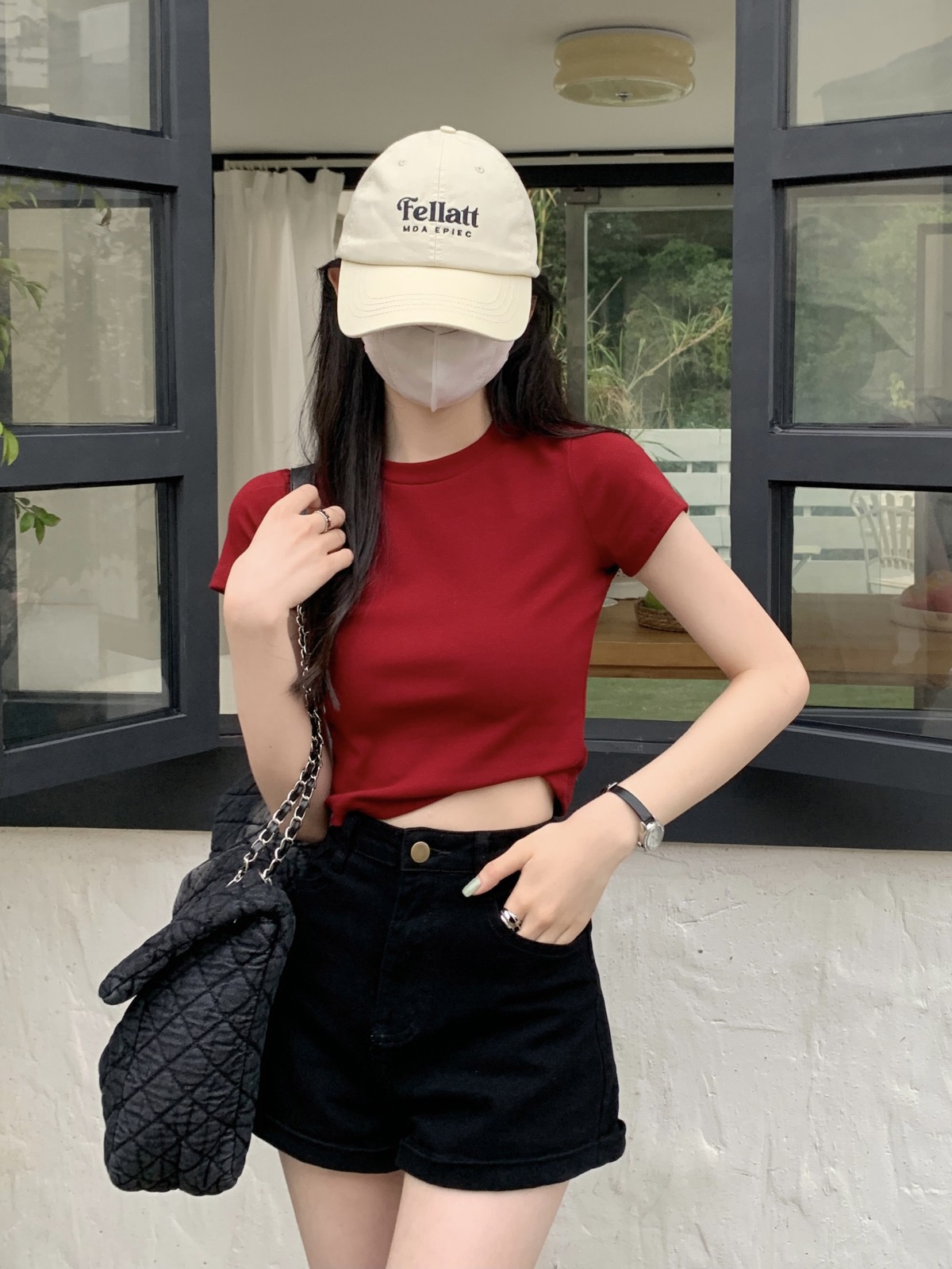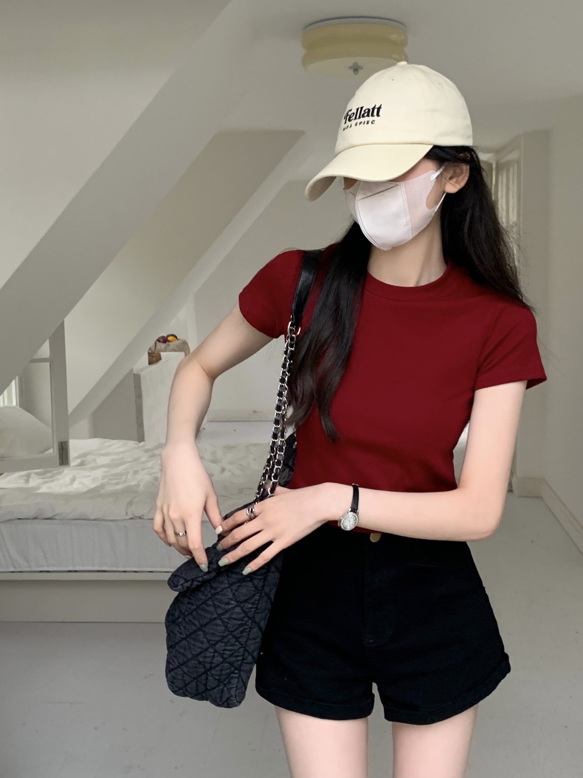 JMA-580 实拍 修身短款白色正肩T恤女2023夏季新款小个子打底短袖体恤上衣