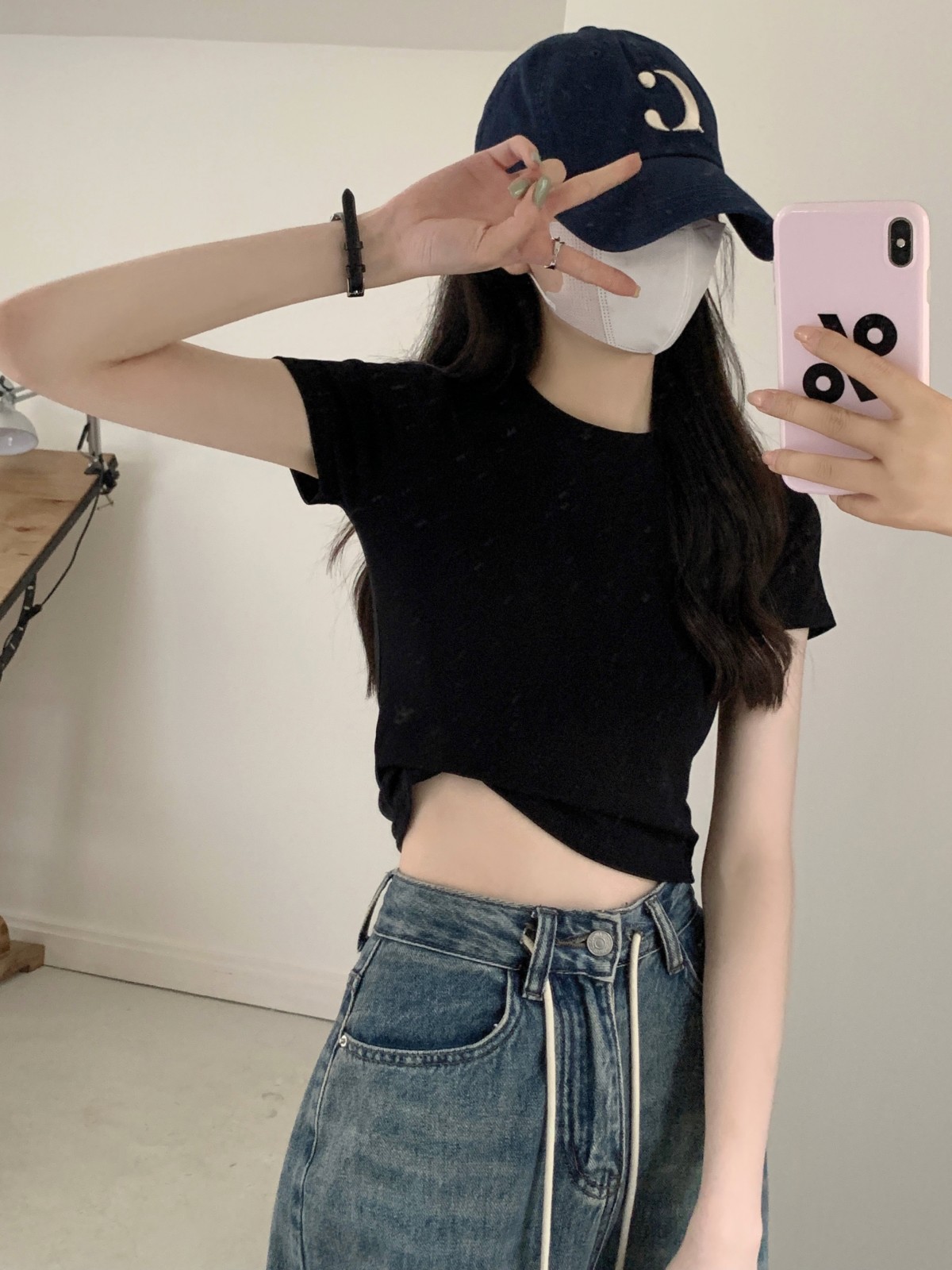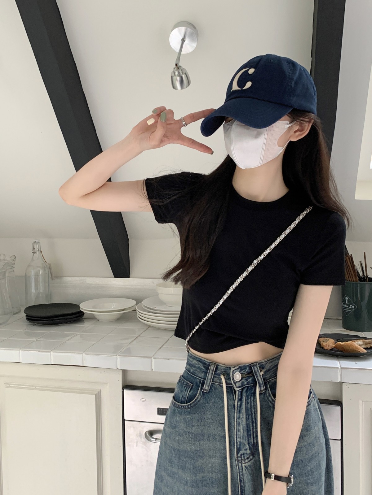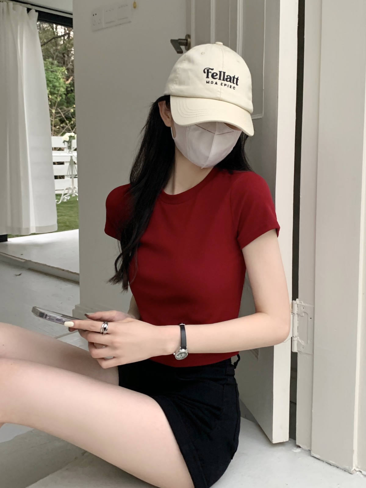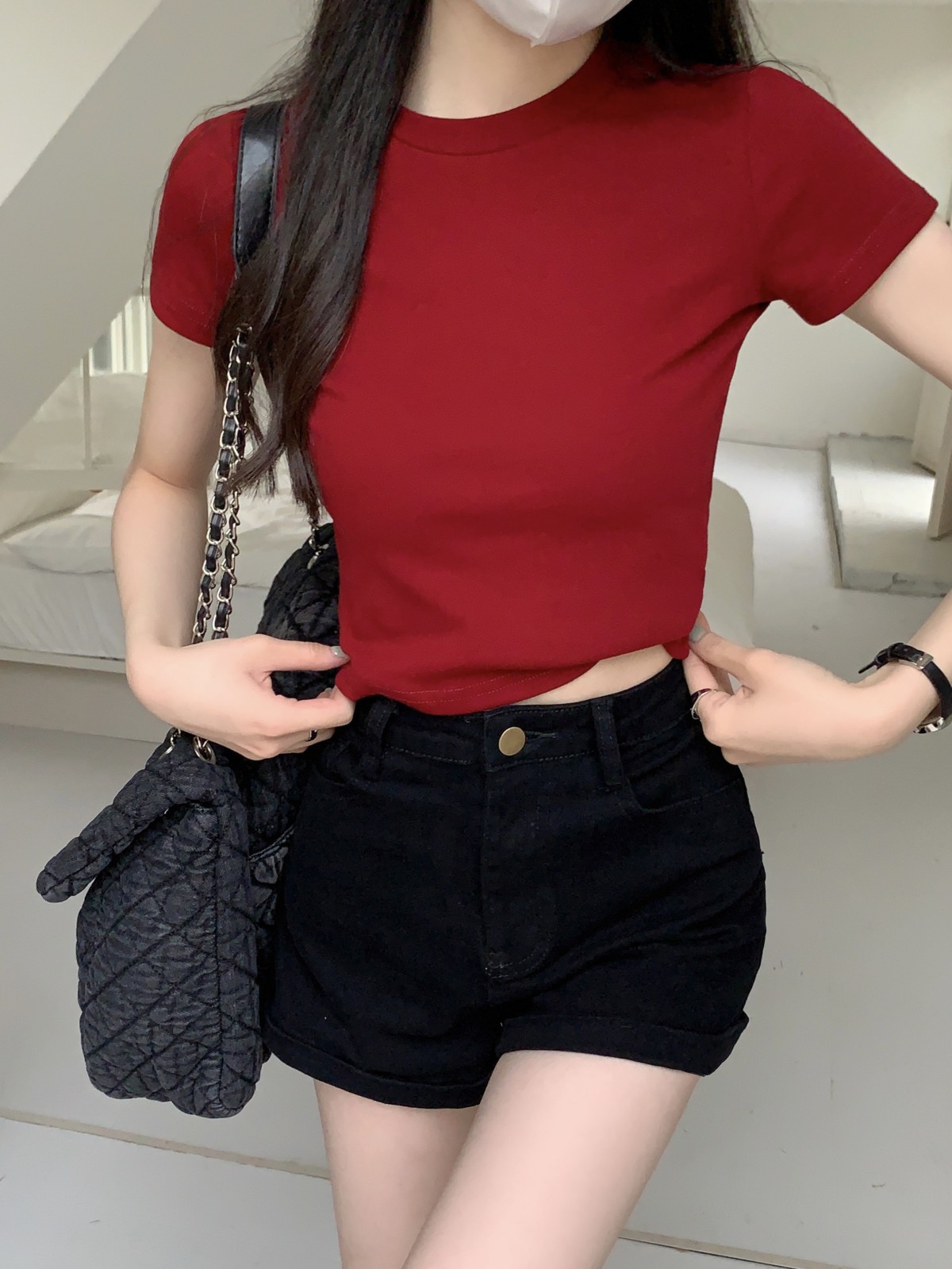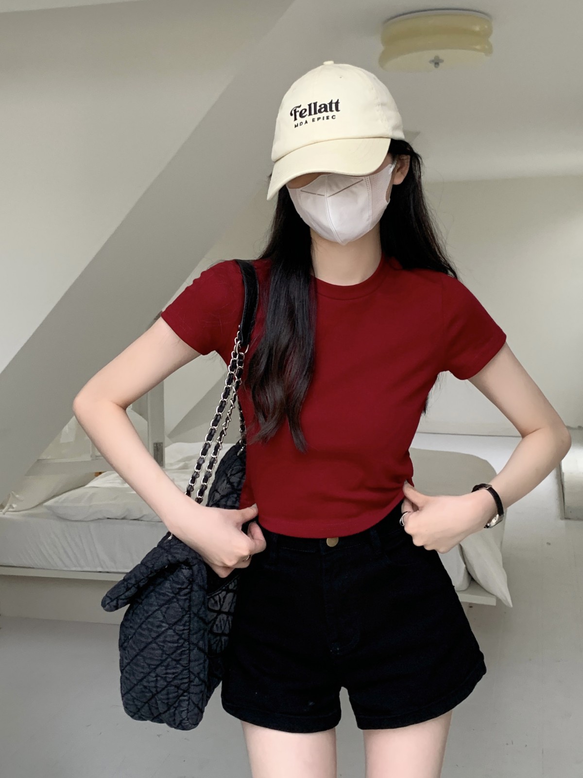JMA-580 实拍 修身短款白色正肩T恤女2023夏季新款小个子打底短袖体恤上衣