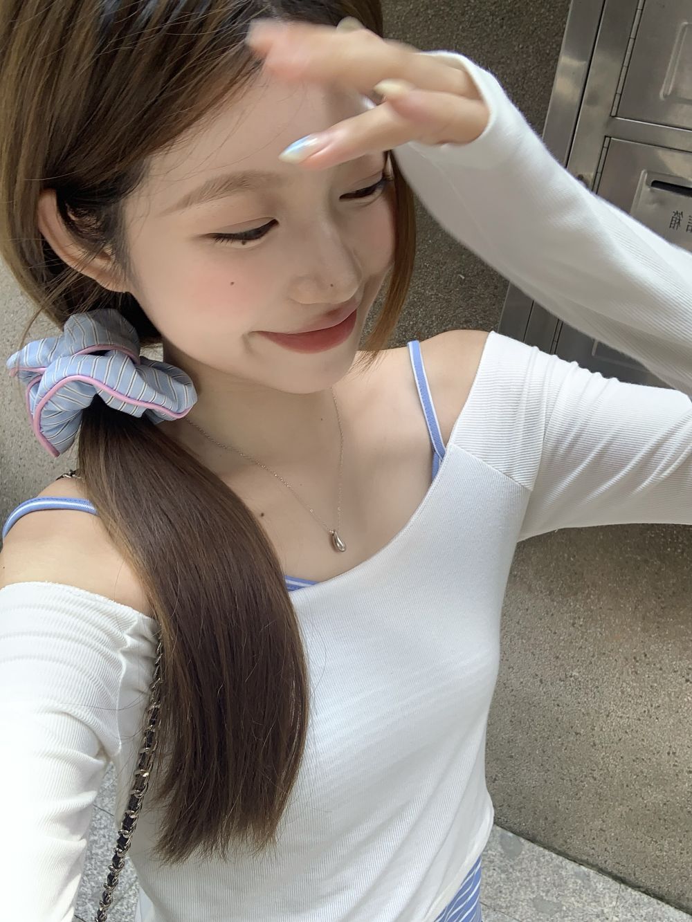 蓝条纹加白罩衫
