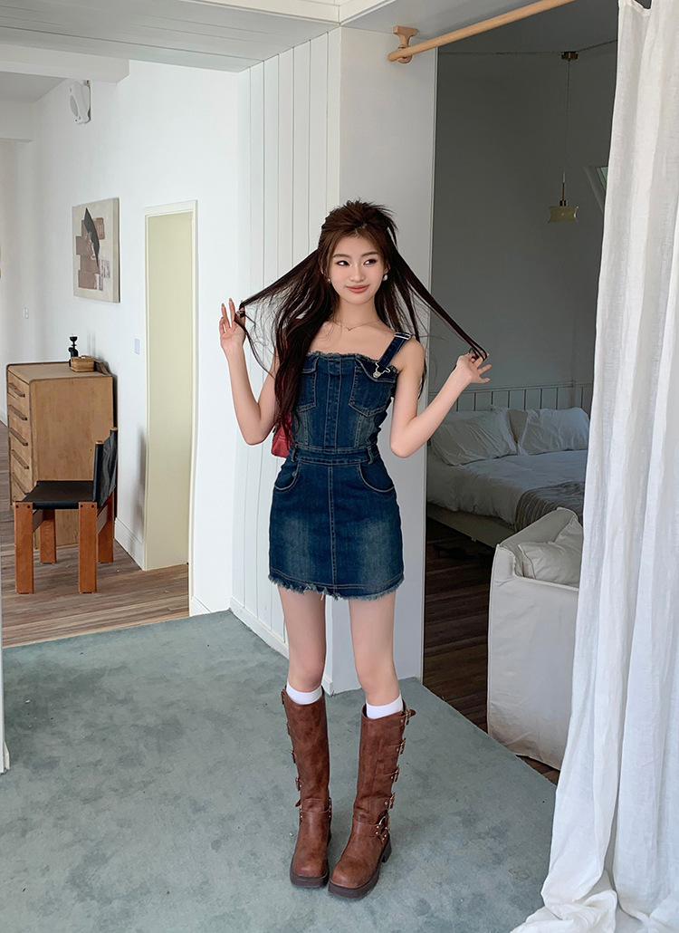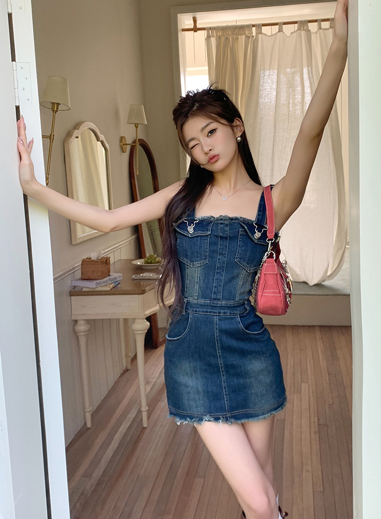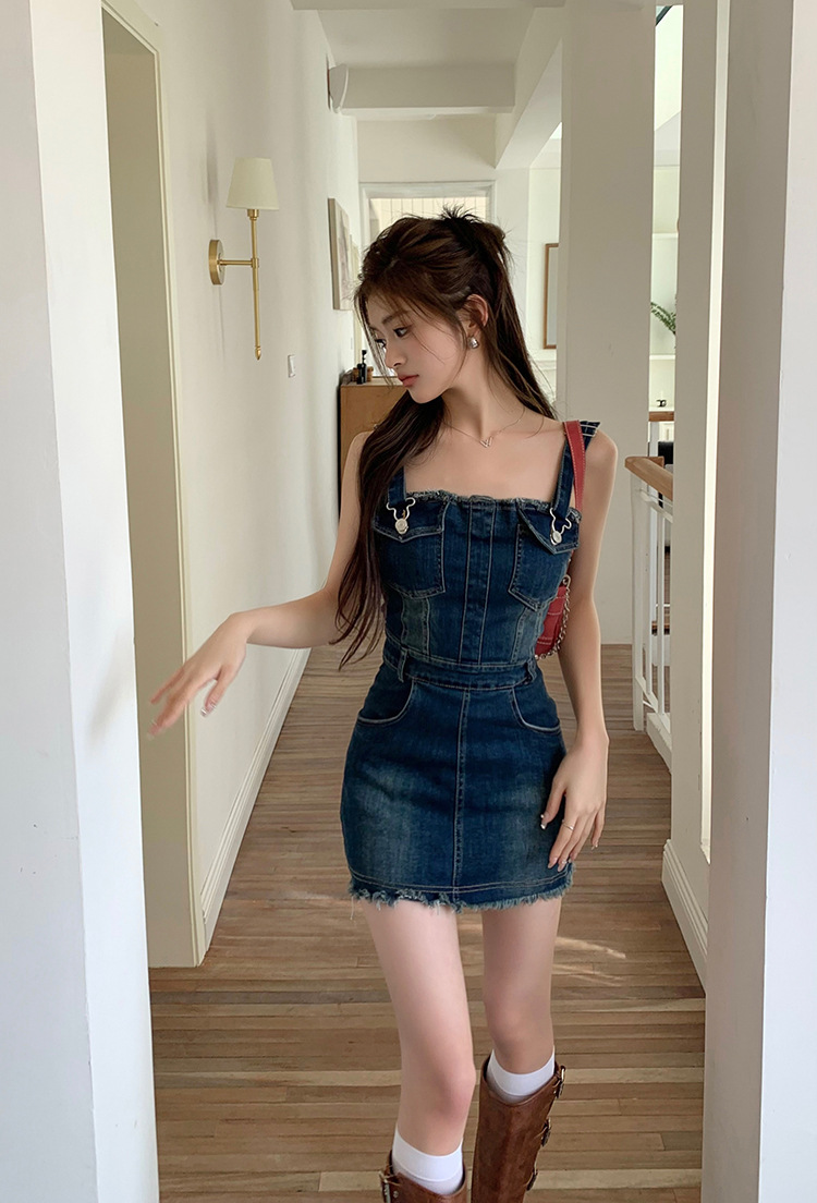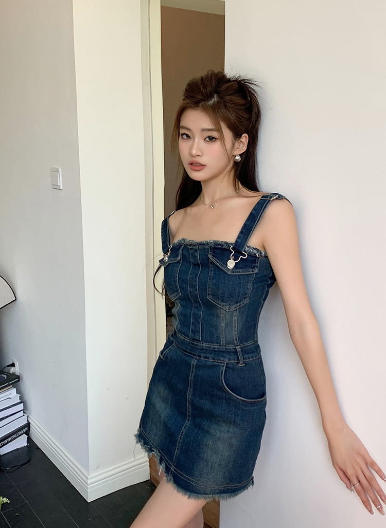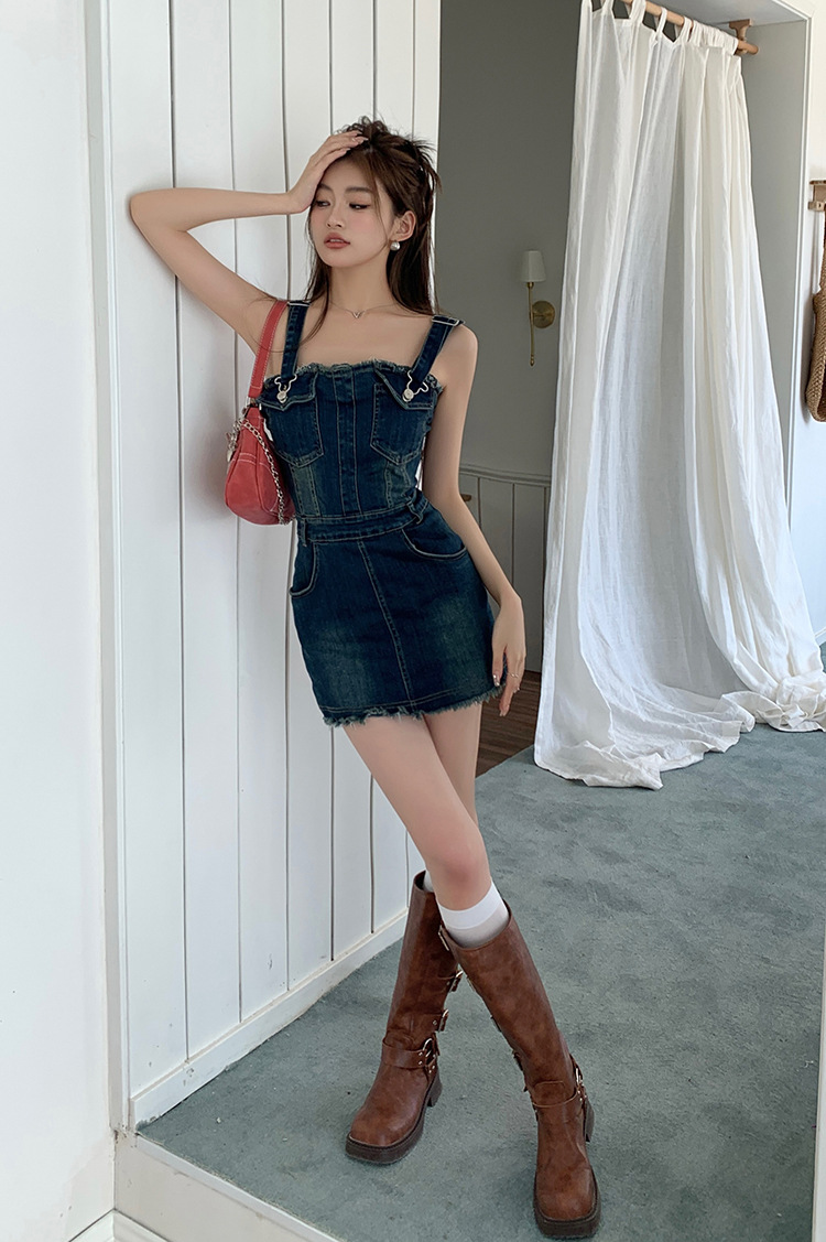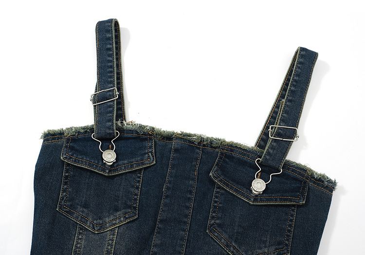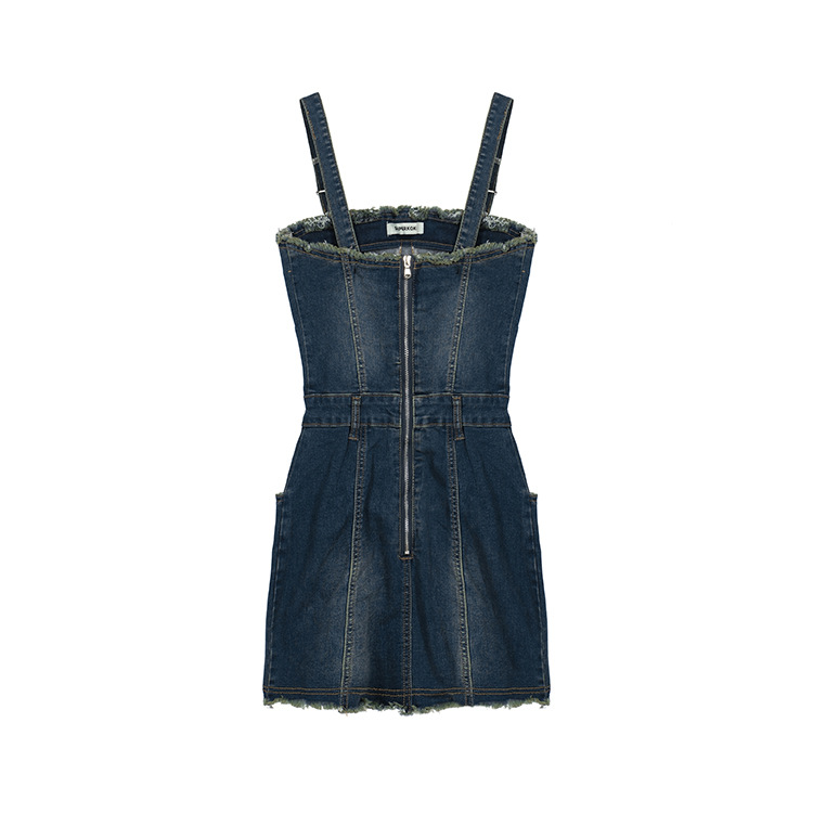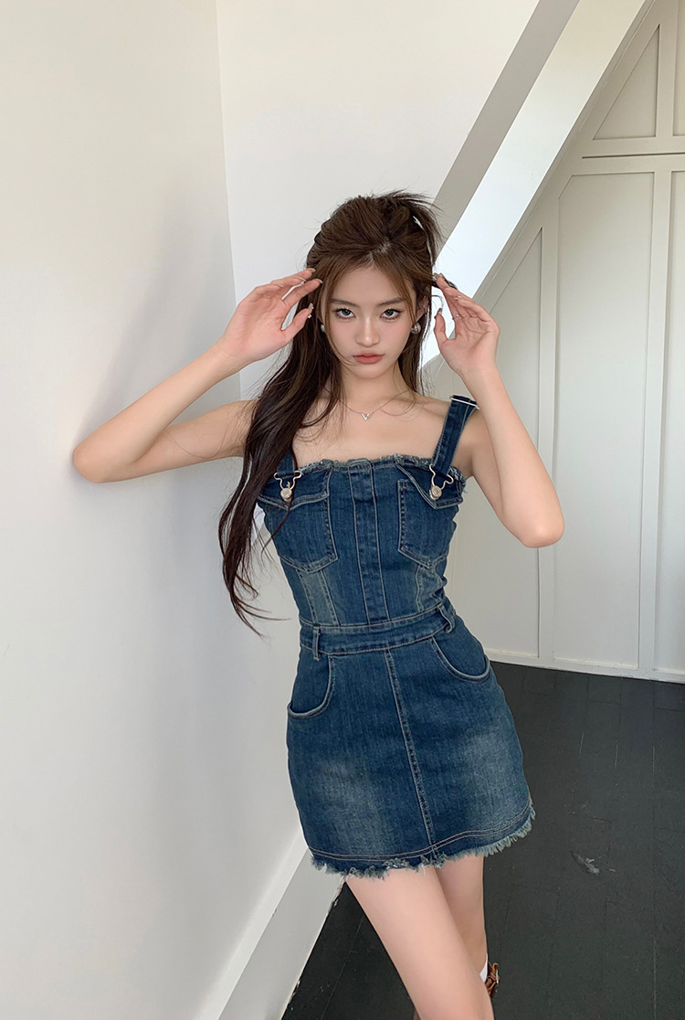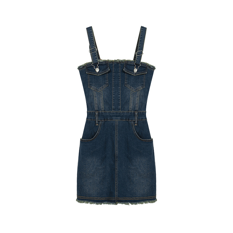 JMA-590 实拍 2024春夏新款复古水洗牛仔背带连衣裙女性感辣妹包臀短裙子