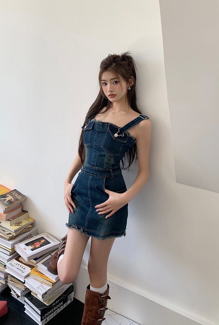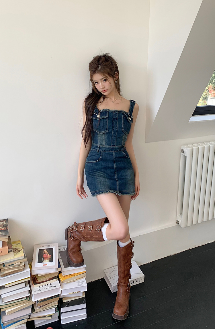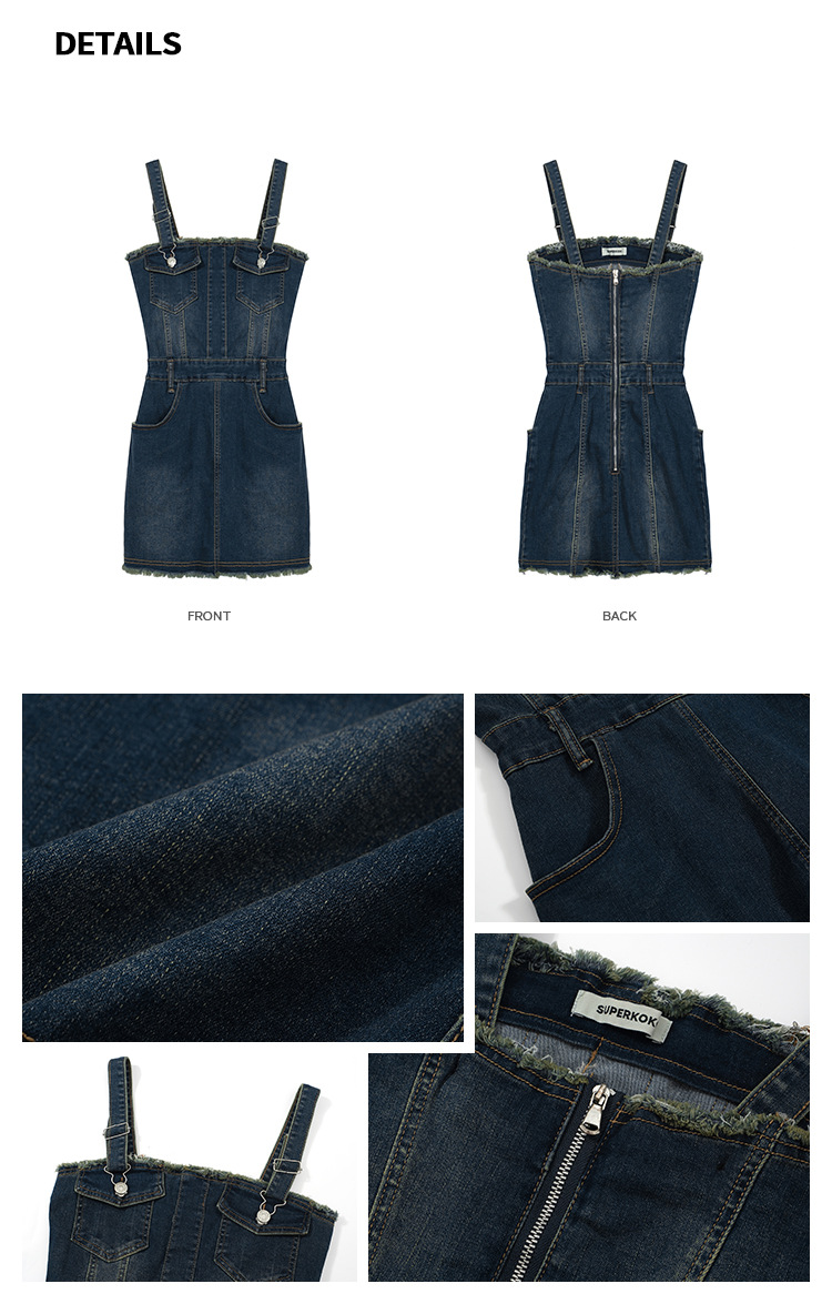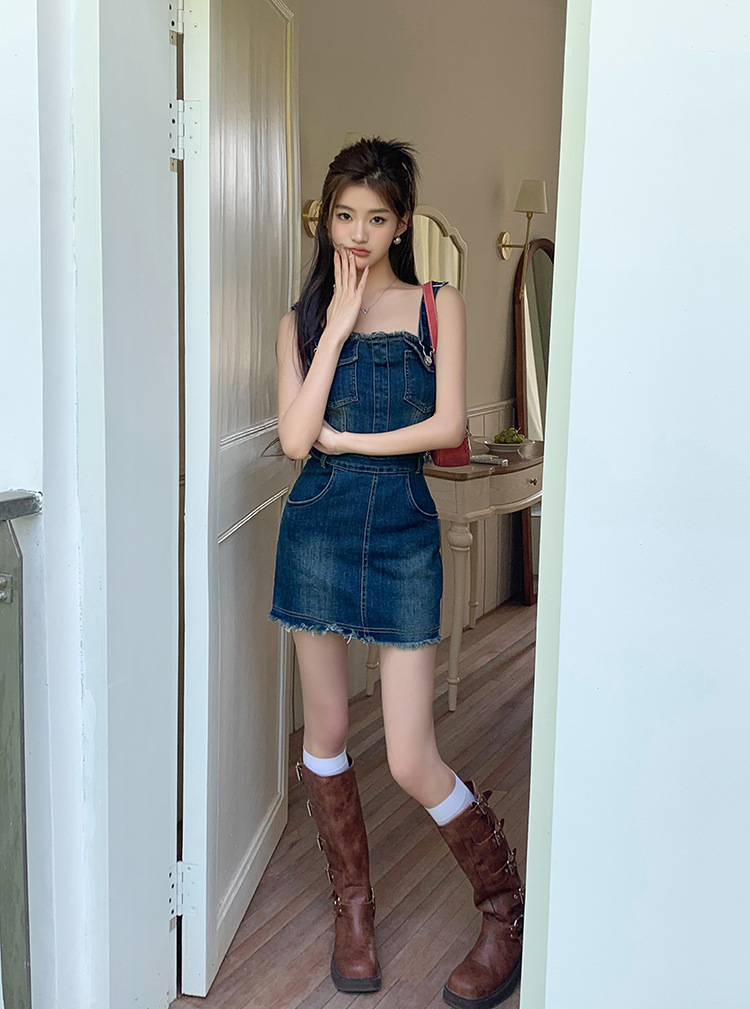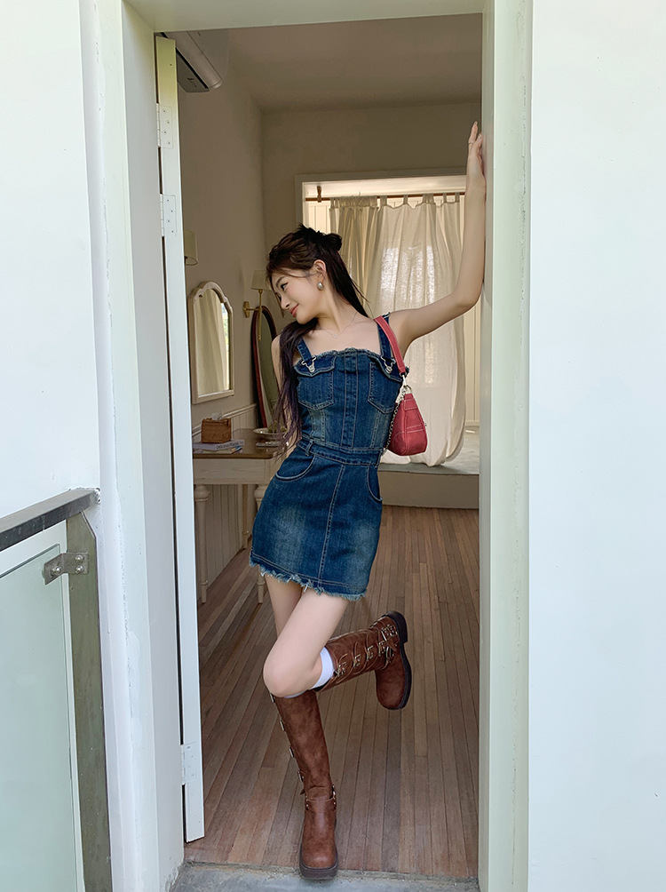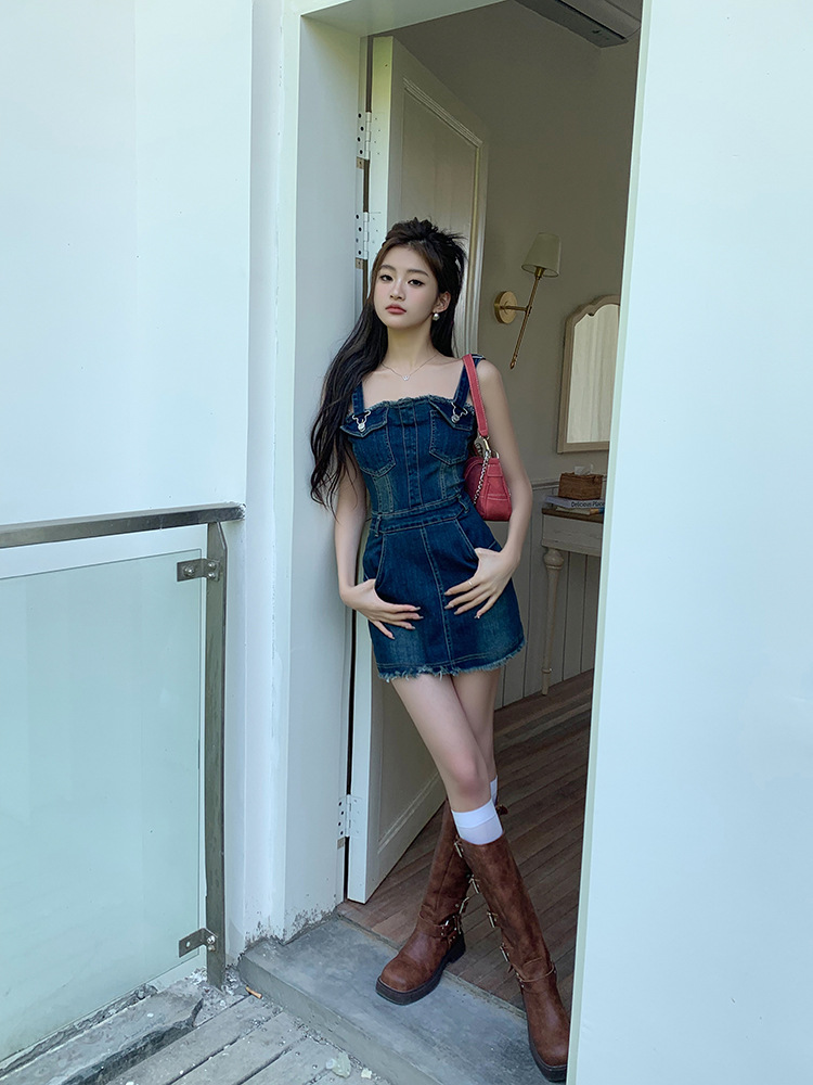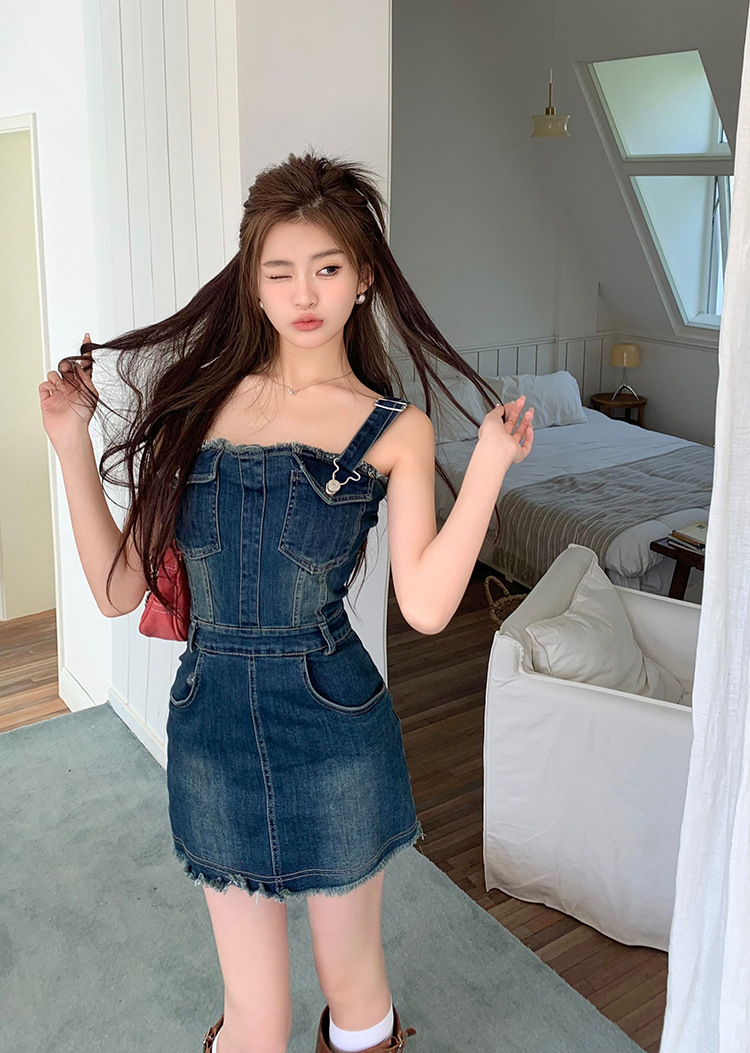 JMA-590 实拍 2024春夏新款复古水洗牛仔背带连衣裙女性感辣妹包臀短裙子