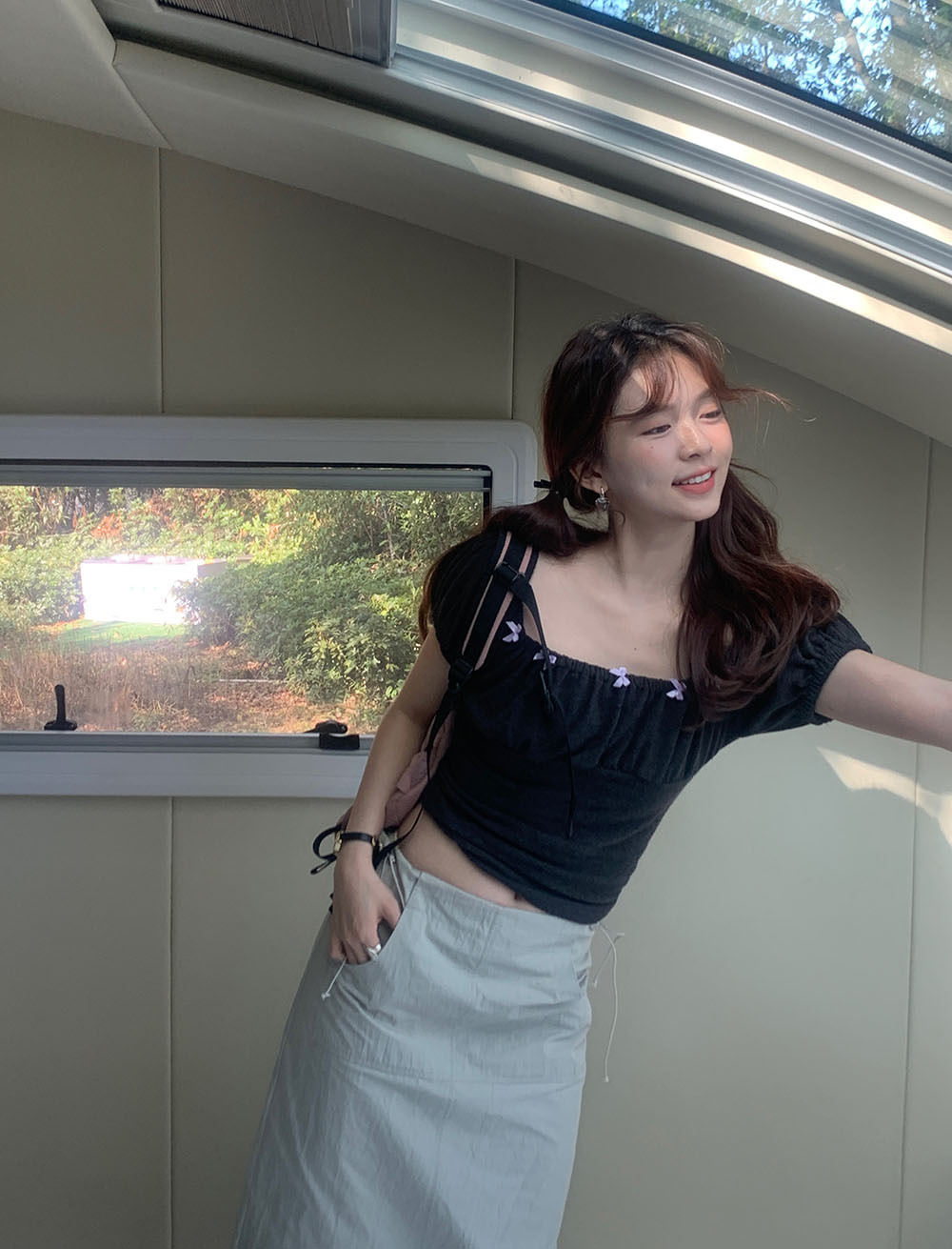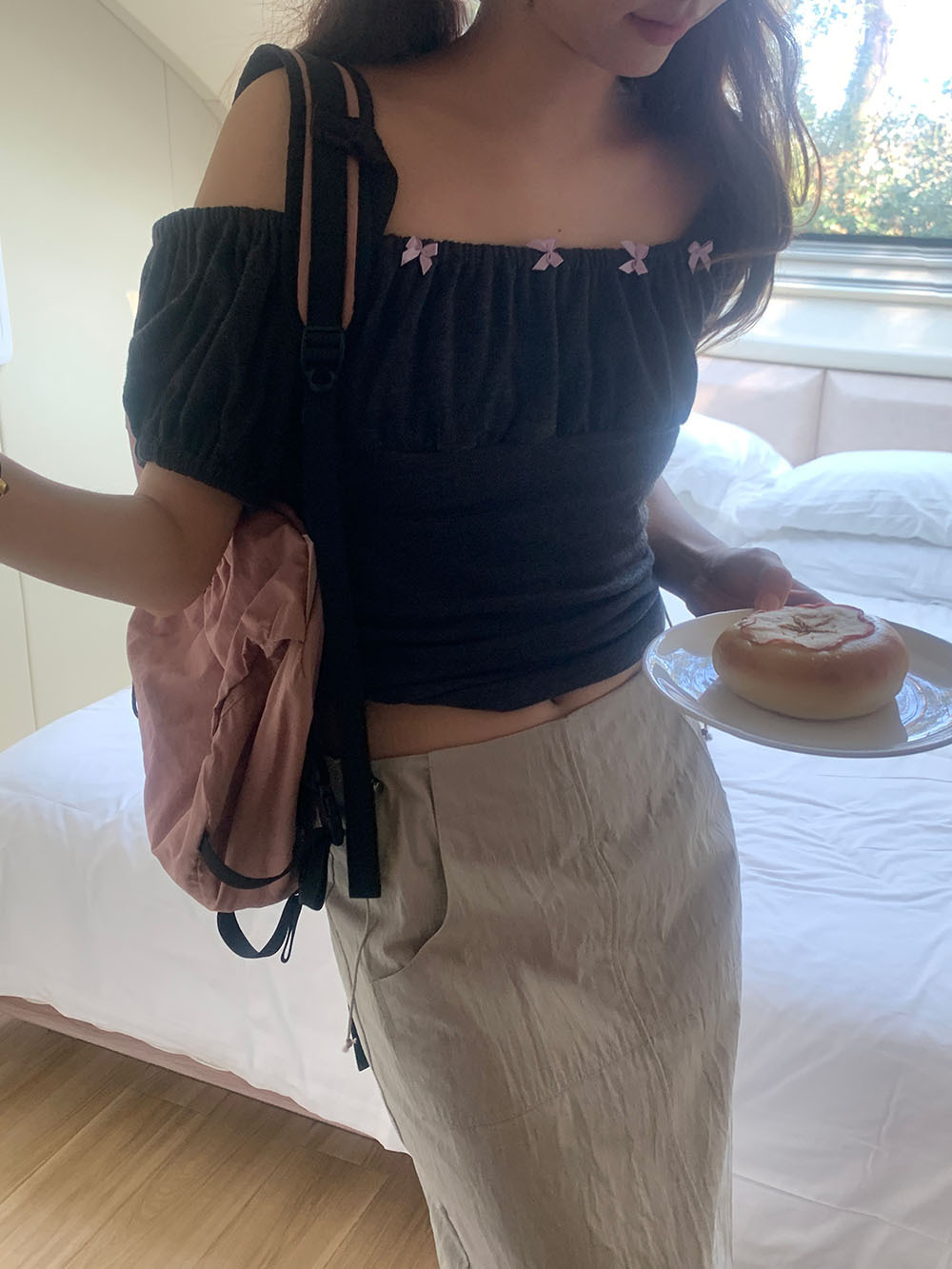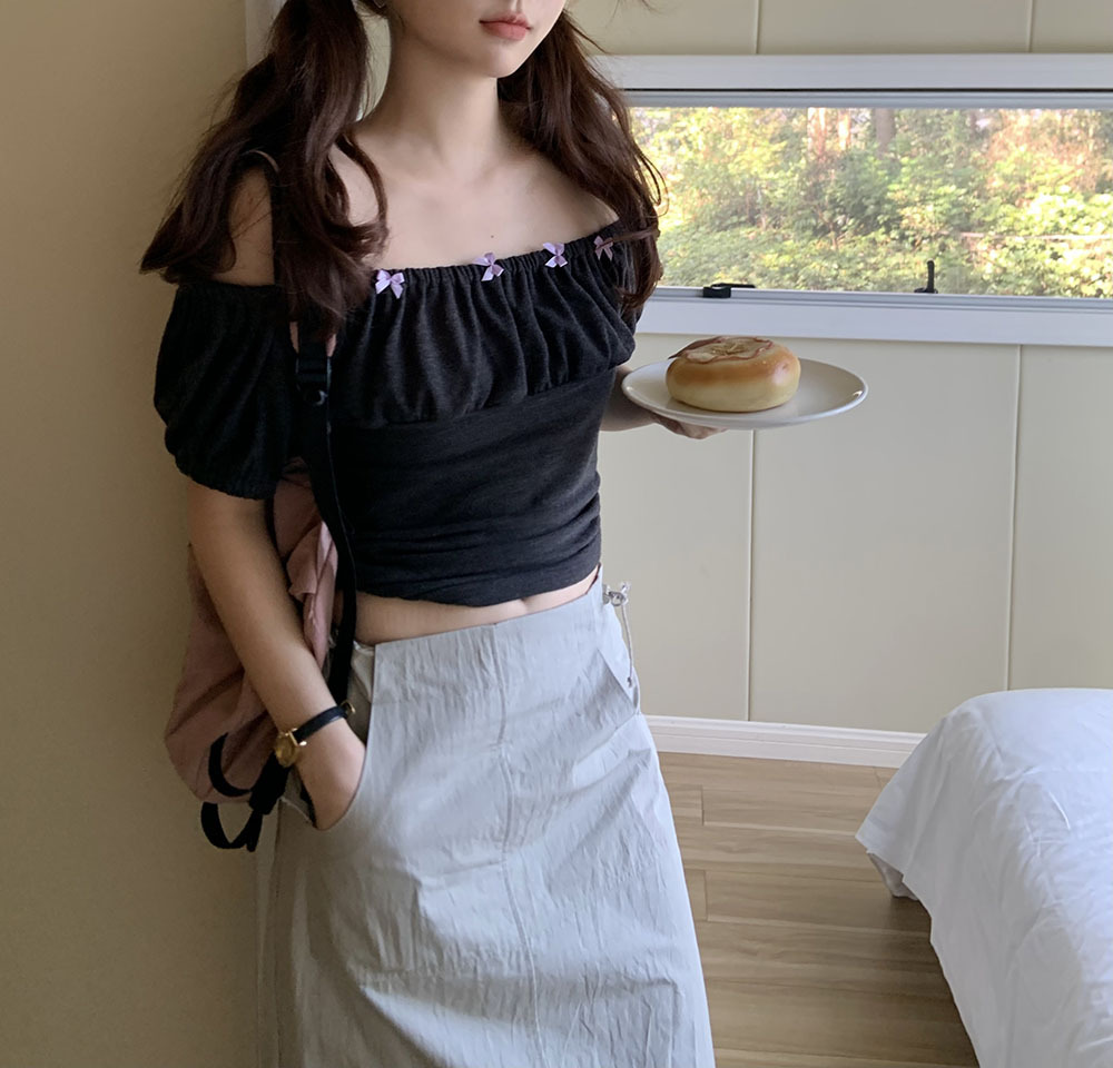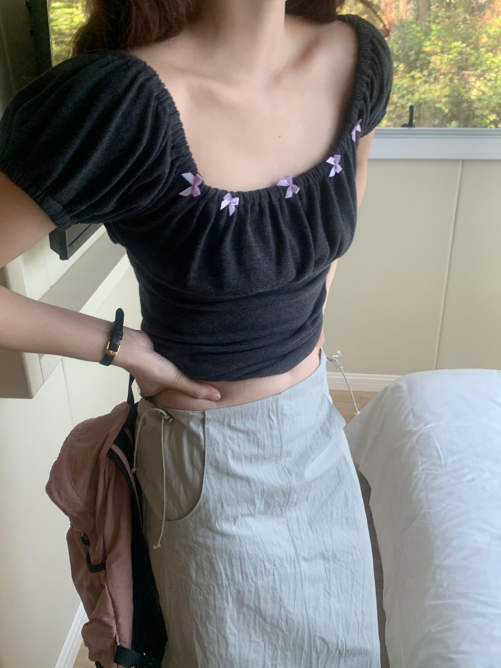 JMA-598 实拍 夏季韩版小众设计感可爱蝴蝶结点缀皱褶泡泡袖短袖T恤上衣女