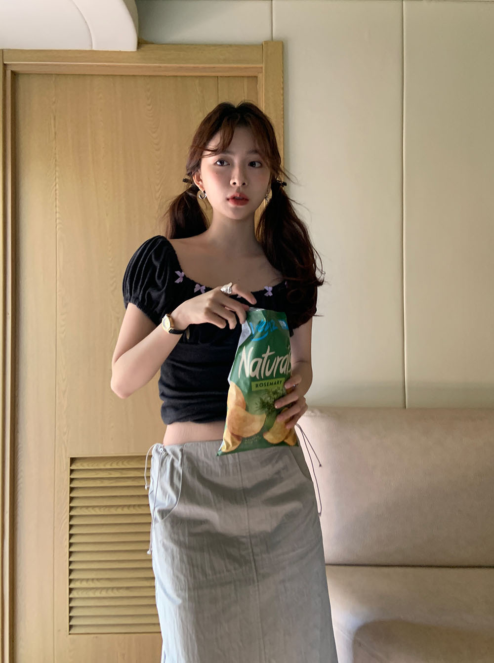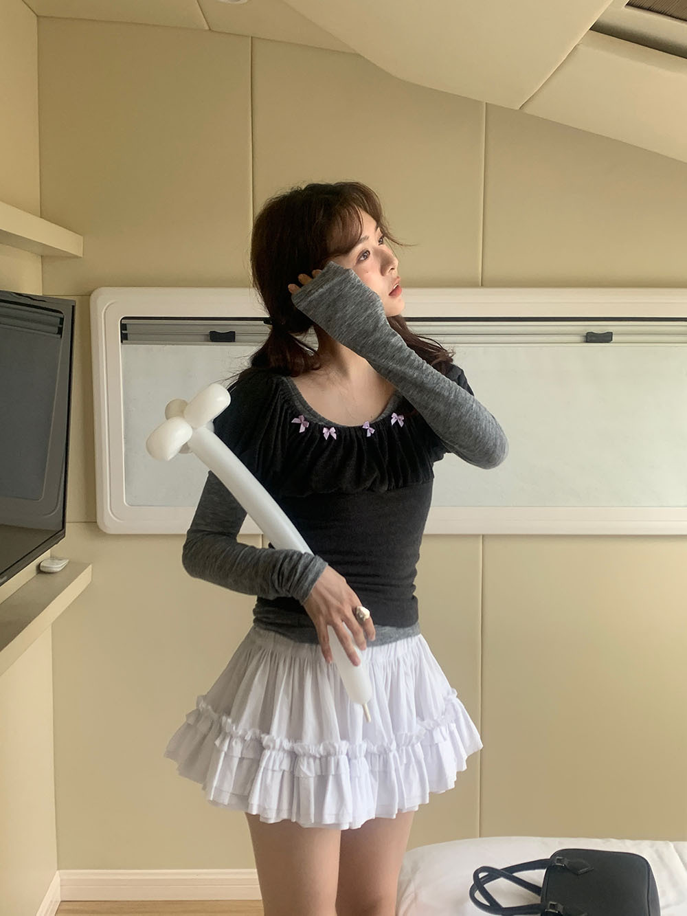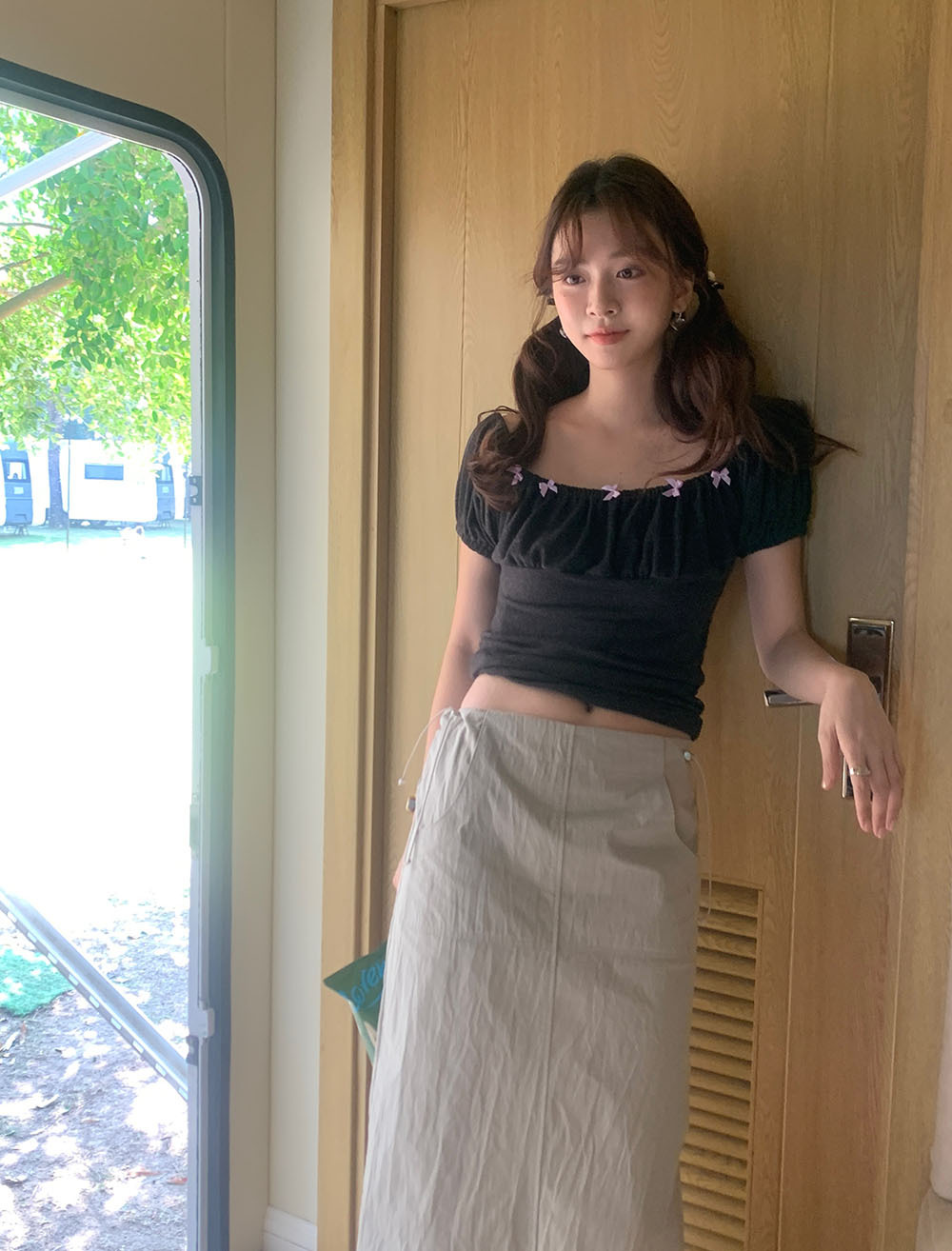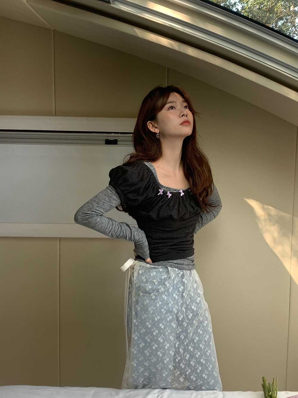 JMA-598 实拍 夏季韩版小众设计感可爱蝴蝶结点缀皱褶泡泡袖短袖T恤上衣女
