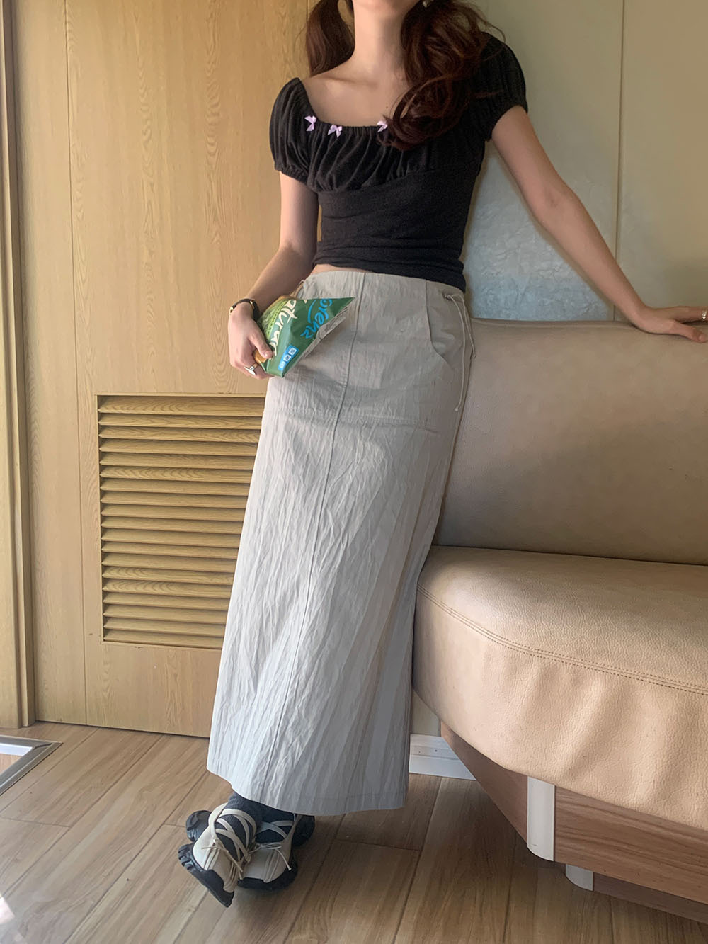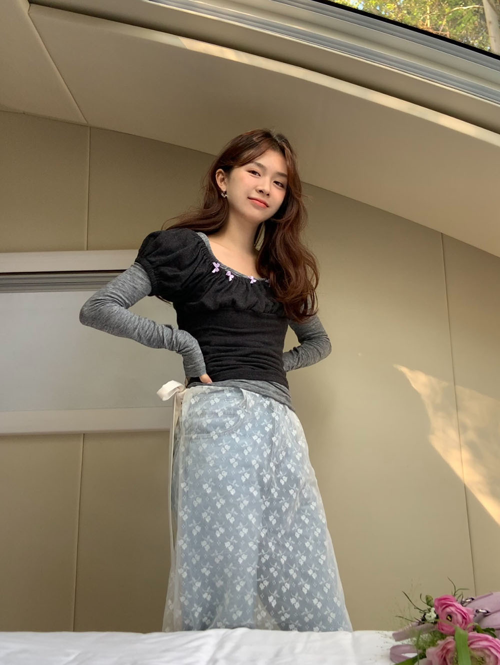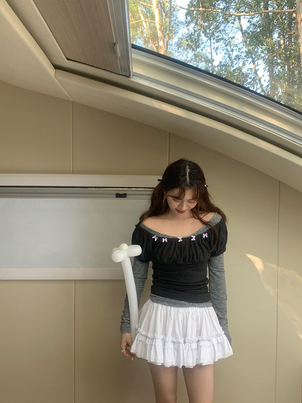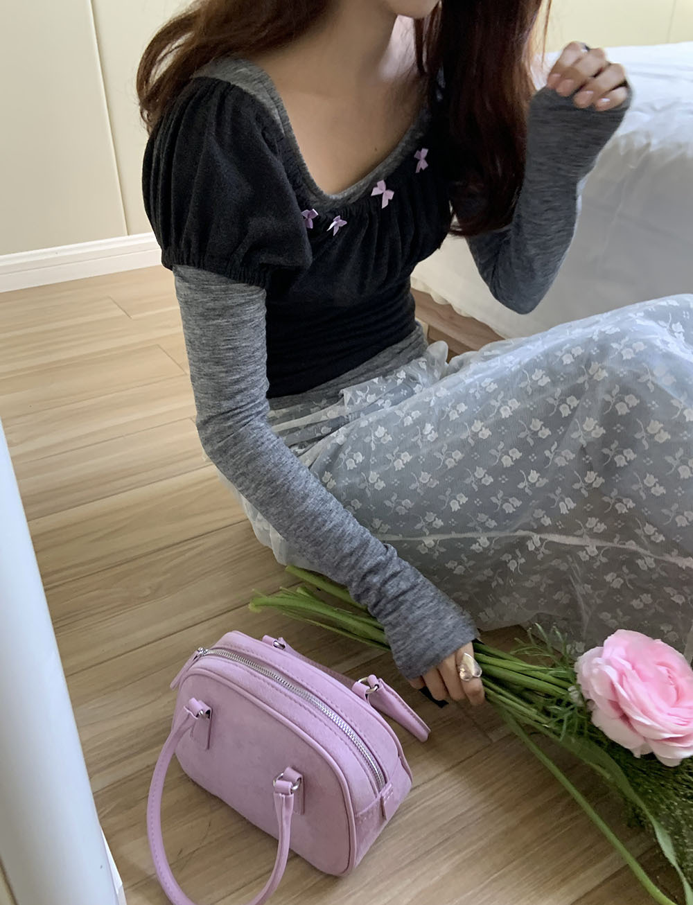 JMA-598 实拍 夏季韩版小众设计感可爱蝴蝶结点缀皱褶泡泡袖短袖T恤上衣女