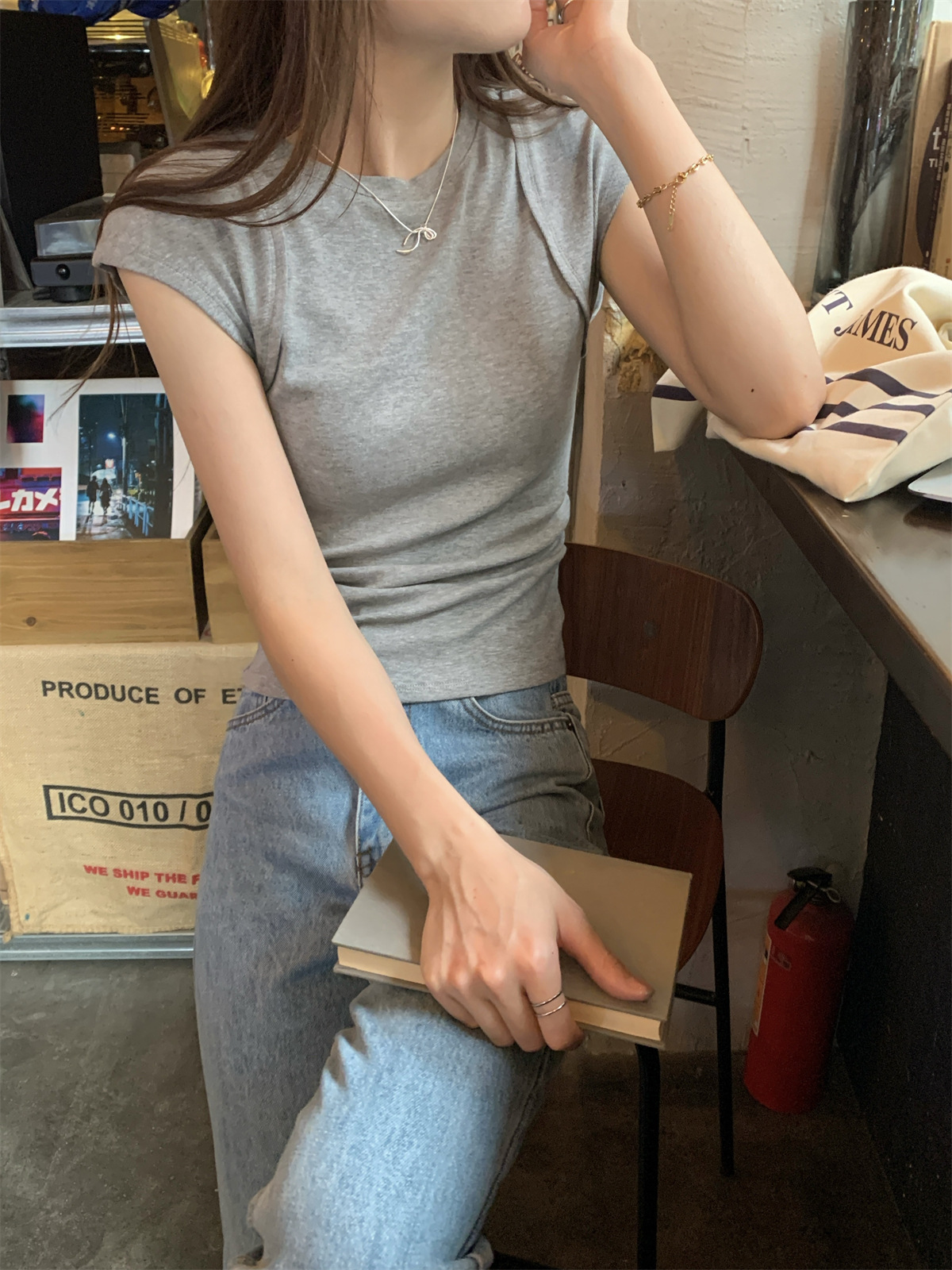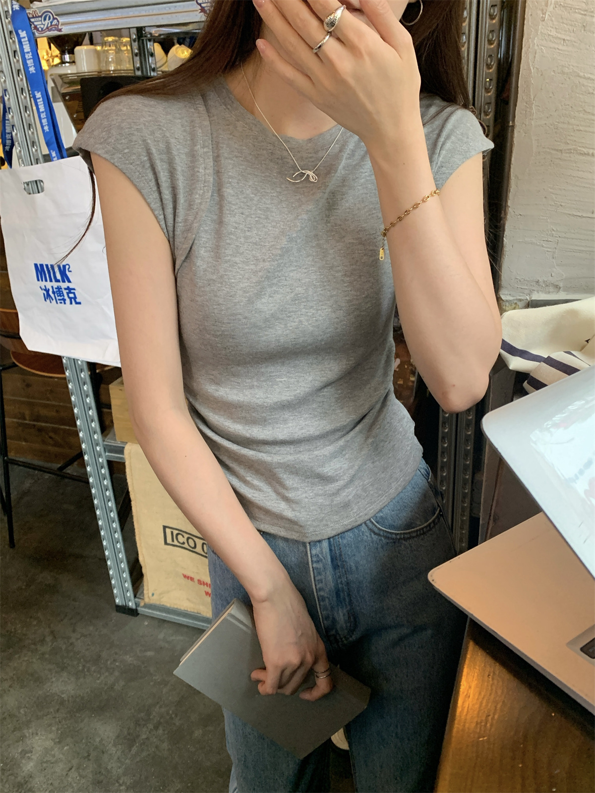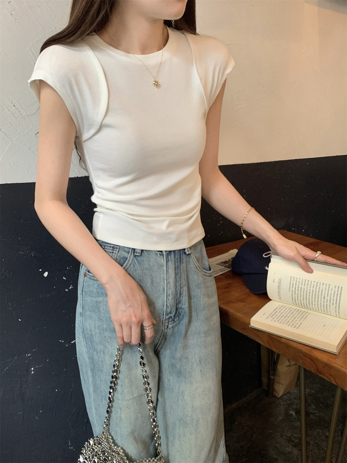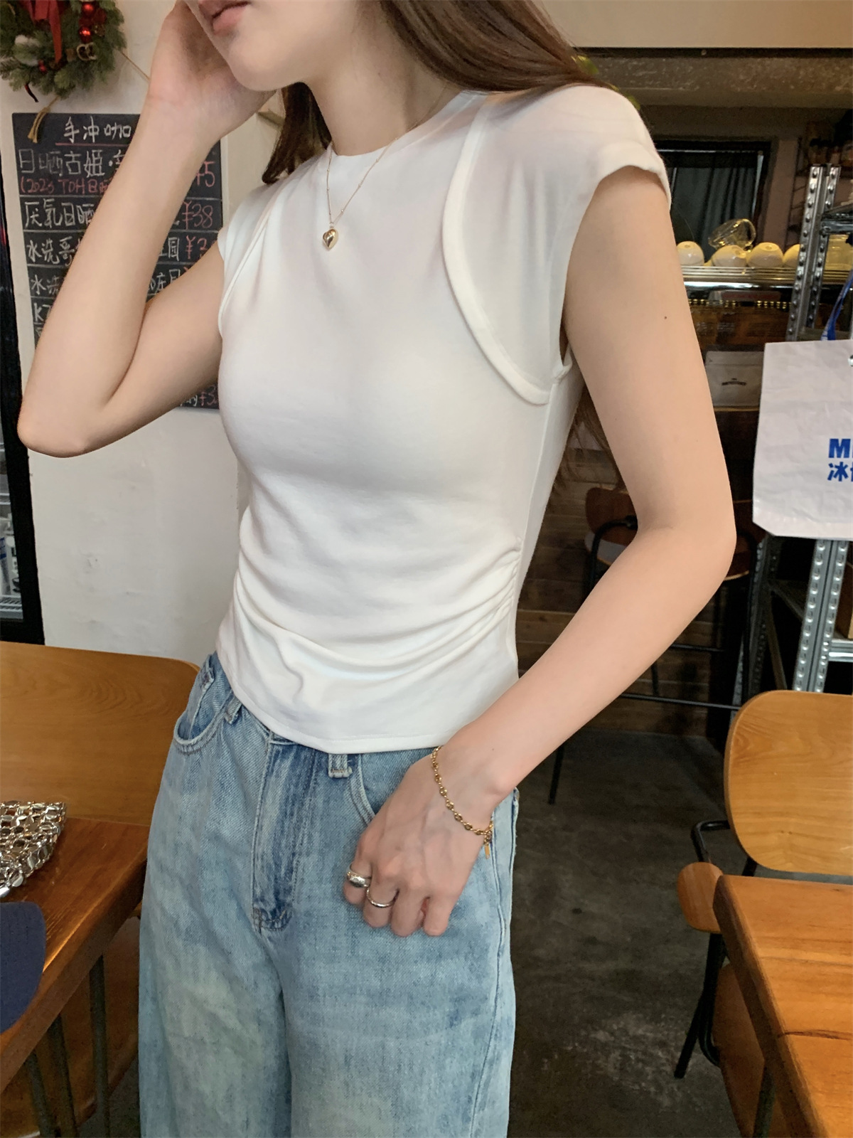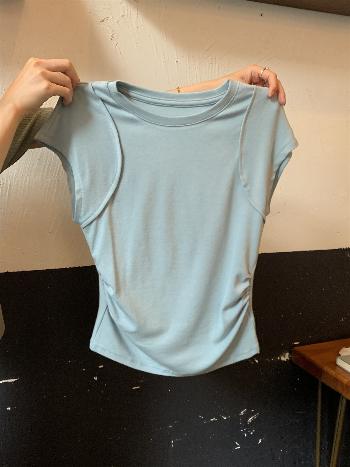 JMA-600 实拍 2024夏季韩版圆领褶皱显瘦设计感百搭辣妹修身短袖T恤上衣女