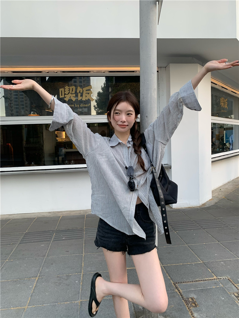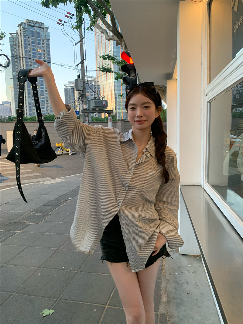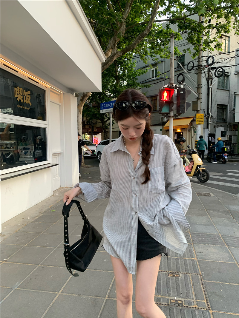 JMA-607 春夏季韩版设计感小众宽松慵懒风中长款条纹长袖衬衫上衣防晒外套