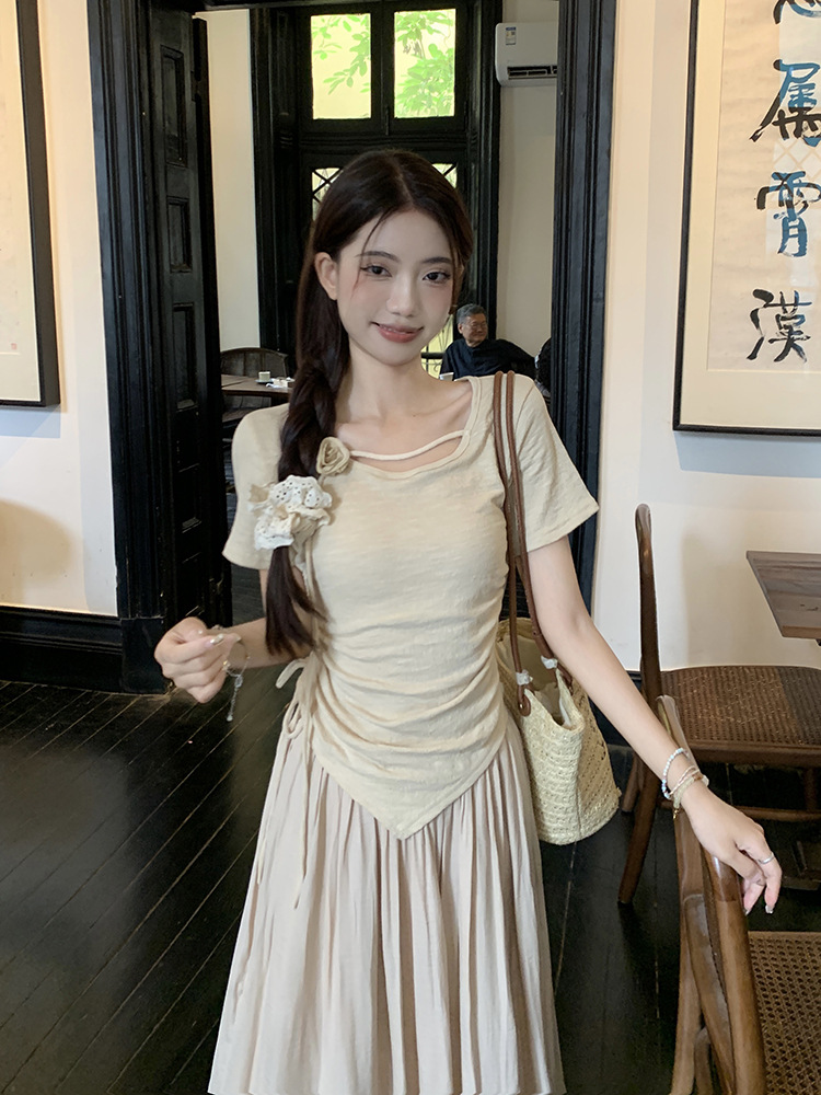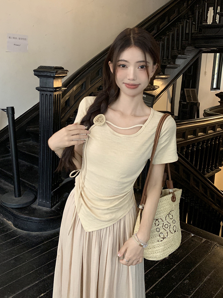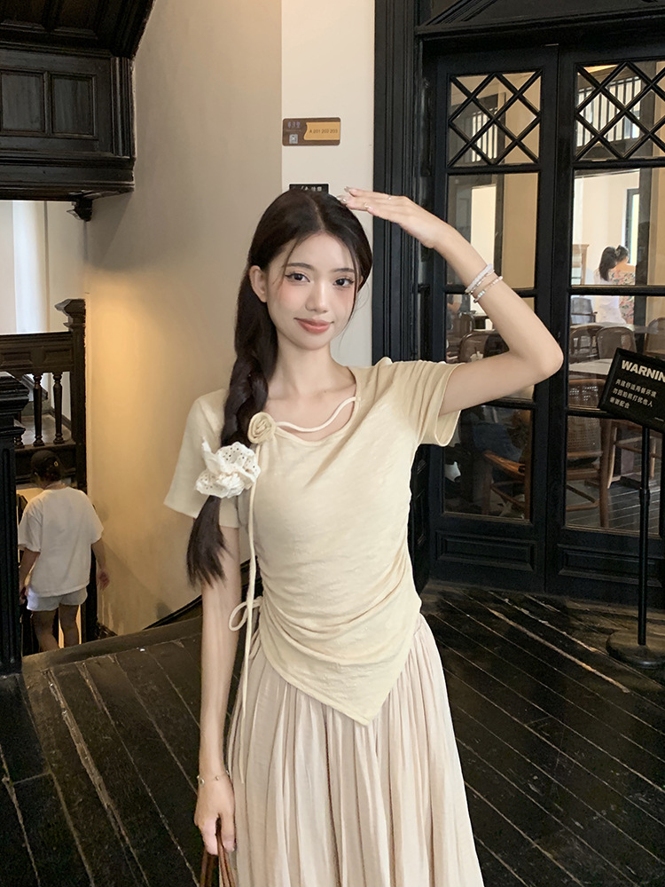 JMA-611 夏季新中式禅意设计感玫瑰花抽绳短袖T恤上衣女+不规则高腰半身裙
