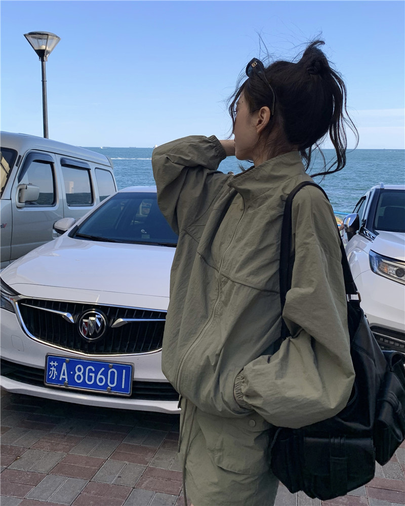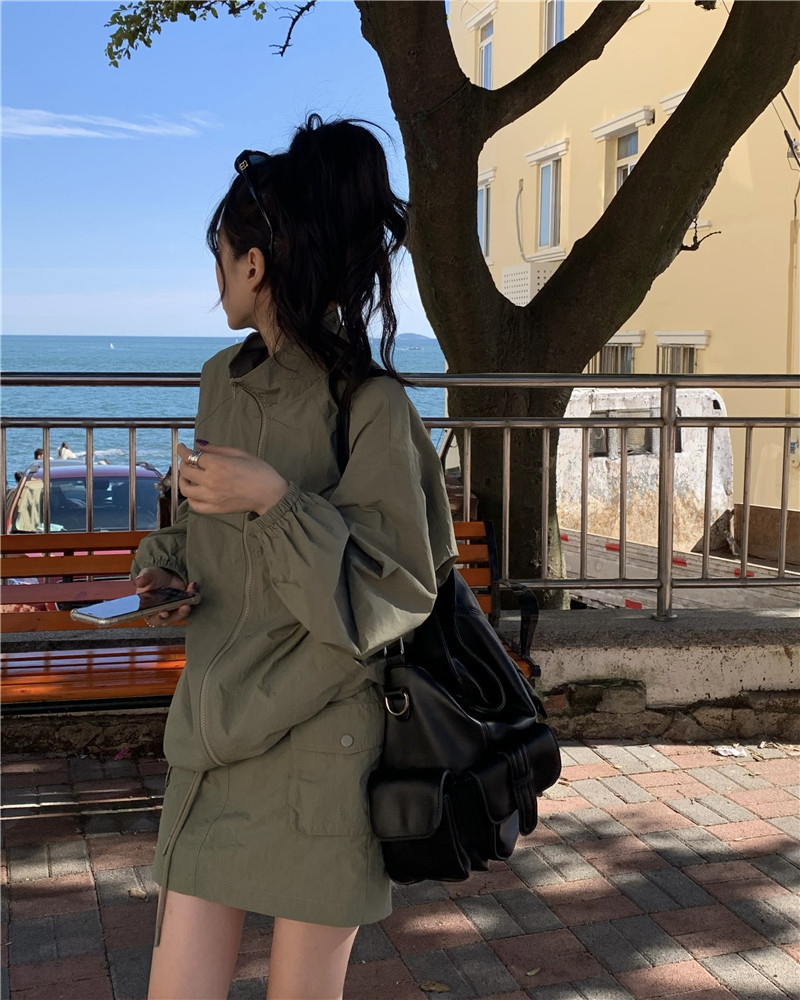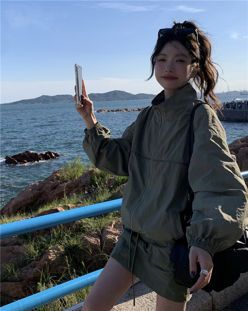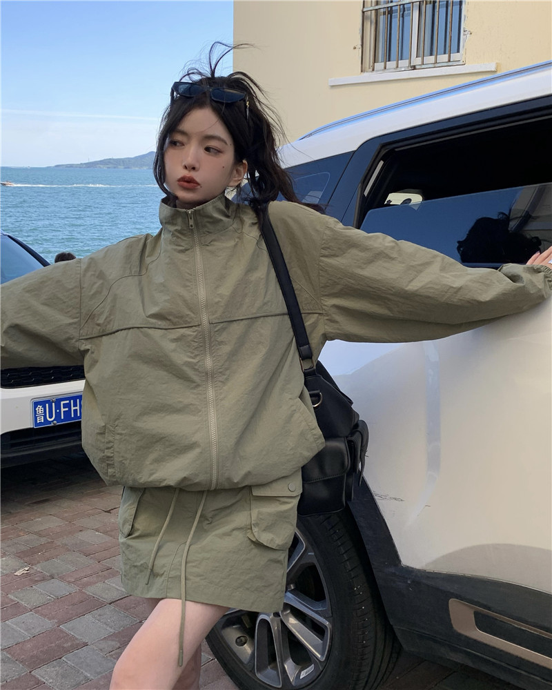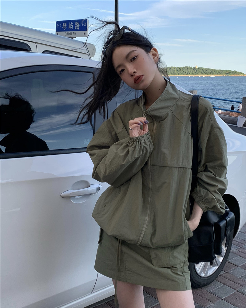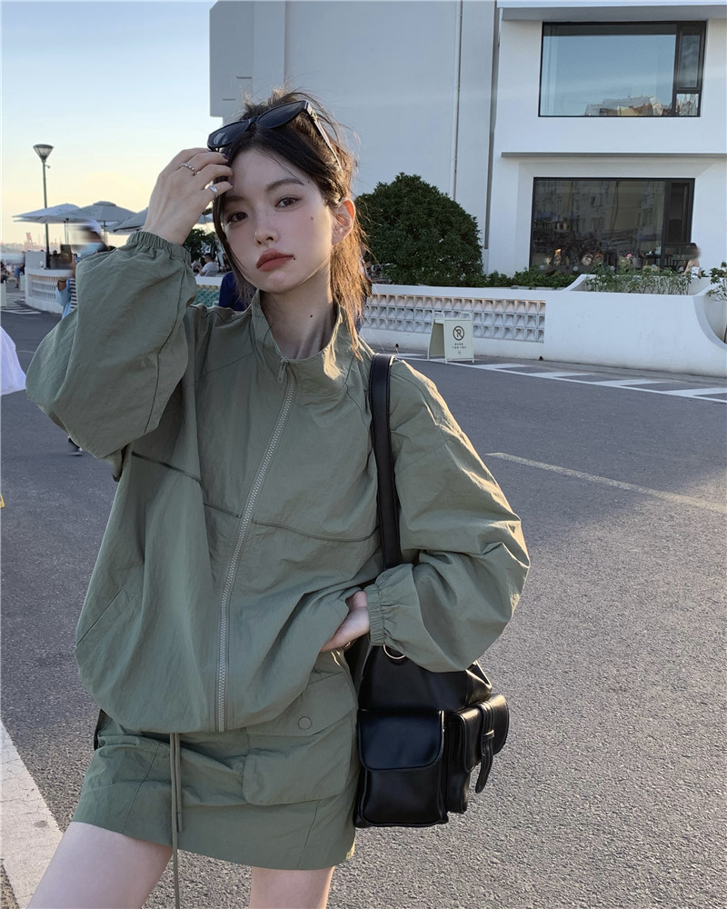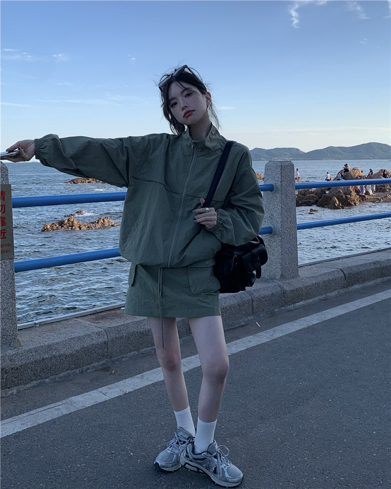 JMA-617 实拍 绿色薄款宽松立领防晒冲锋衣外套女春夏季工装半身裙两件套