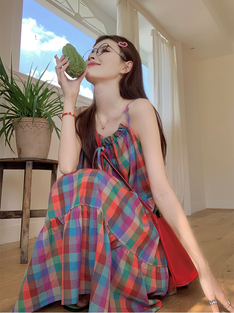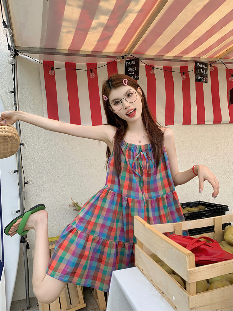 JMA-631 实拍2024夏季韩版多巴胺俏皮少女韩系彩色格子可调节吊带裙连衣裙