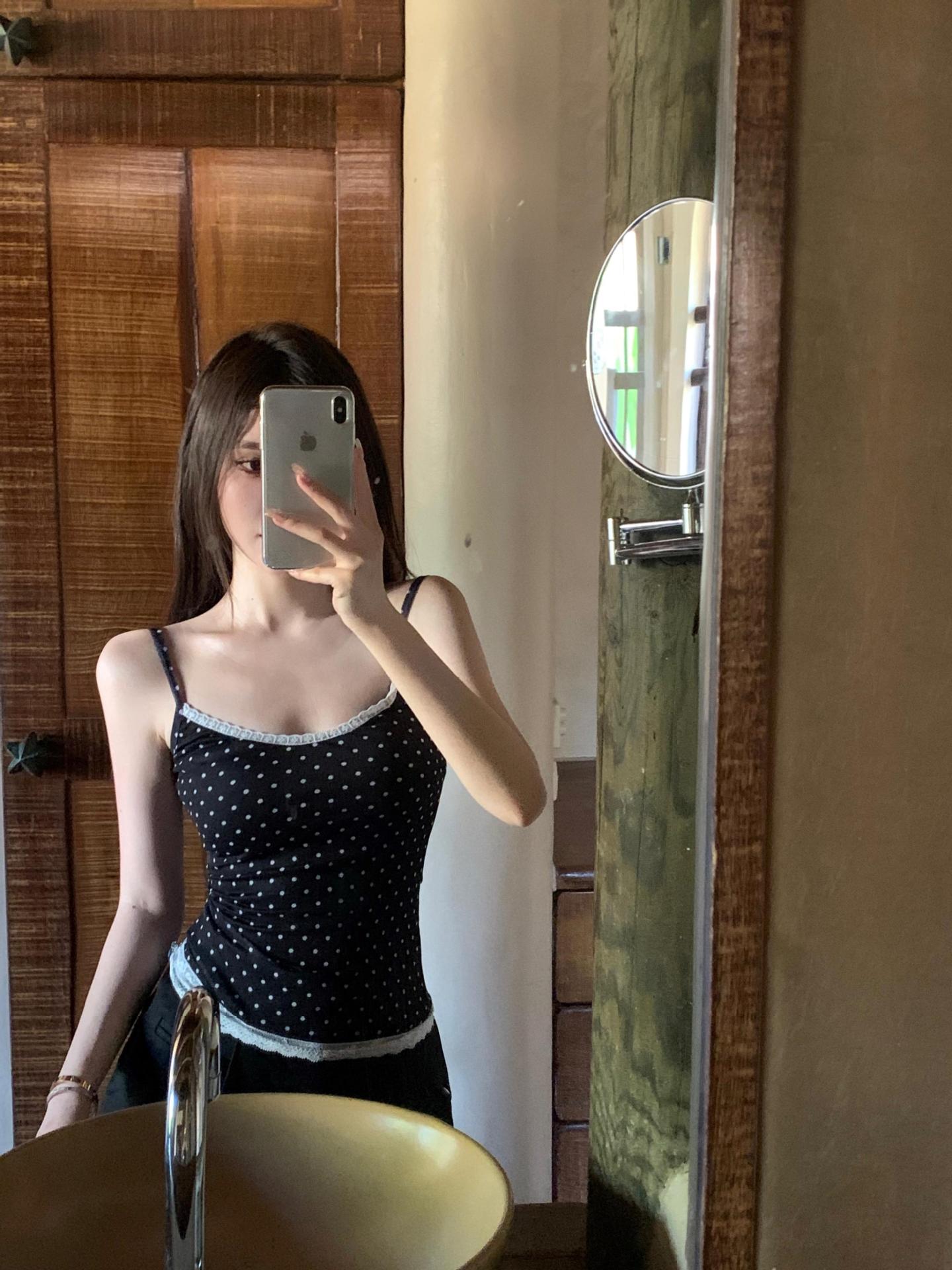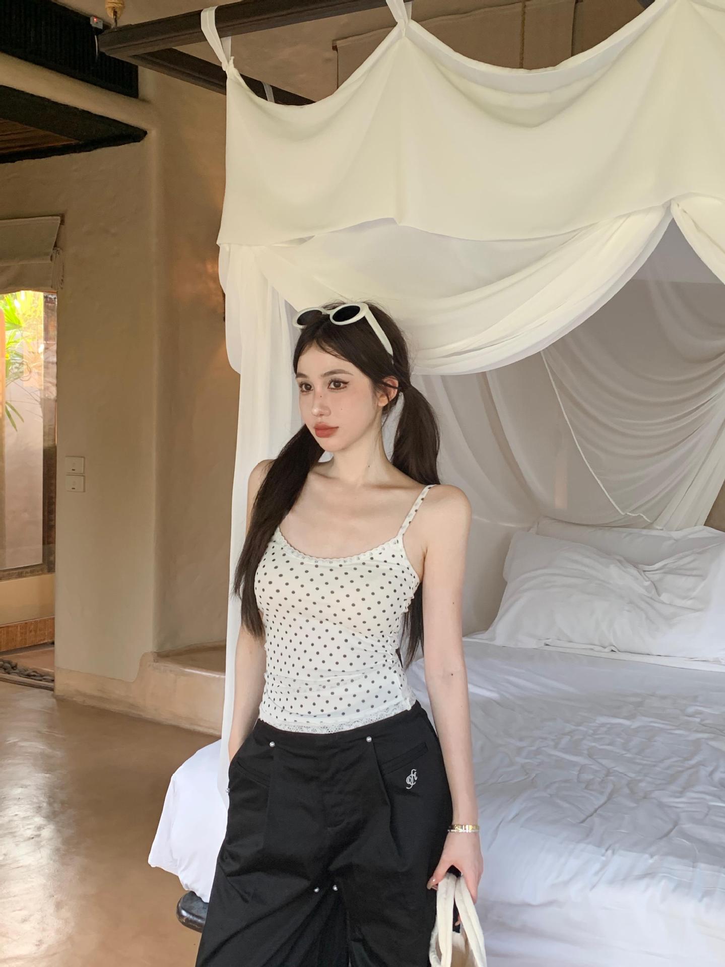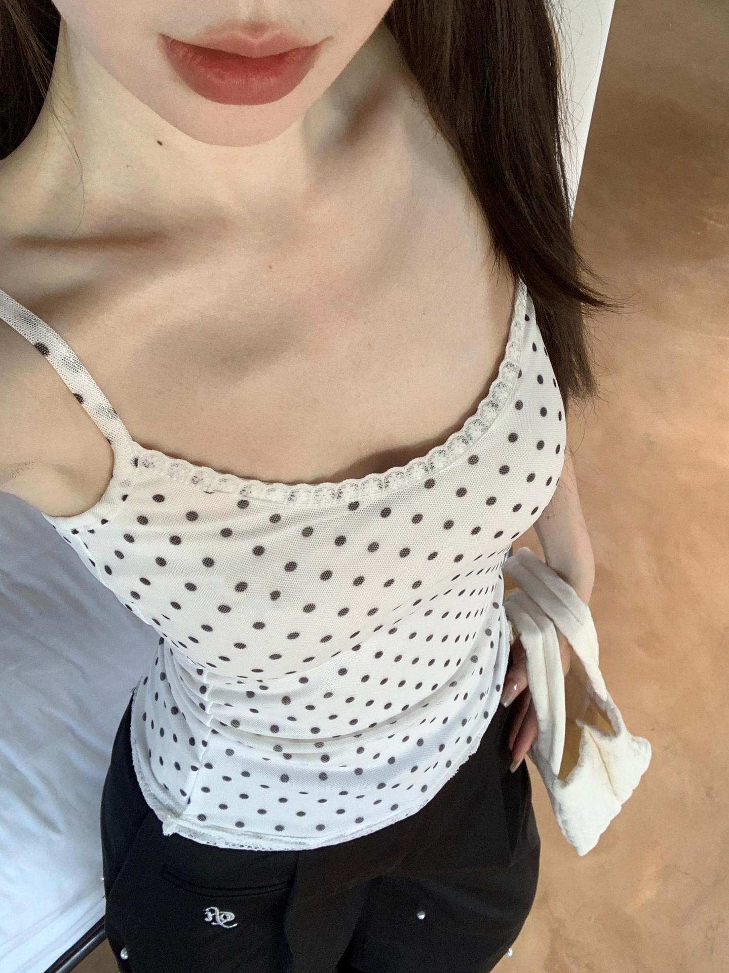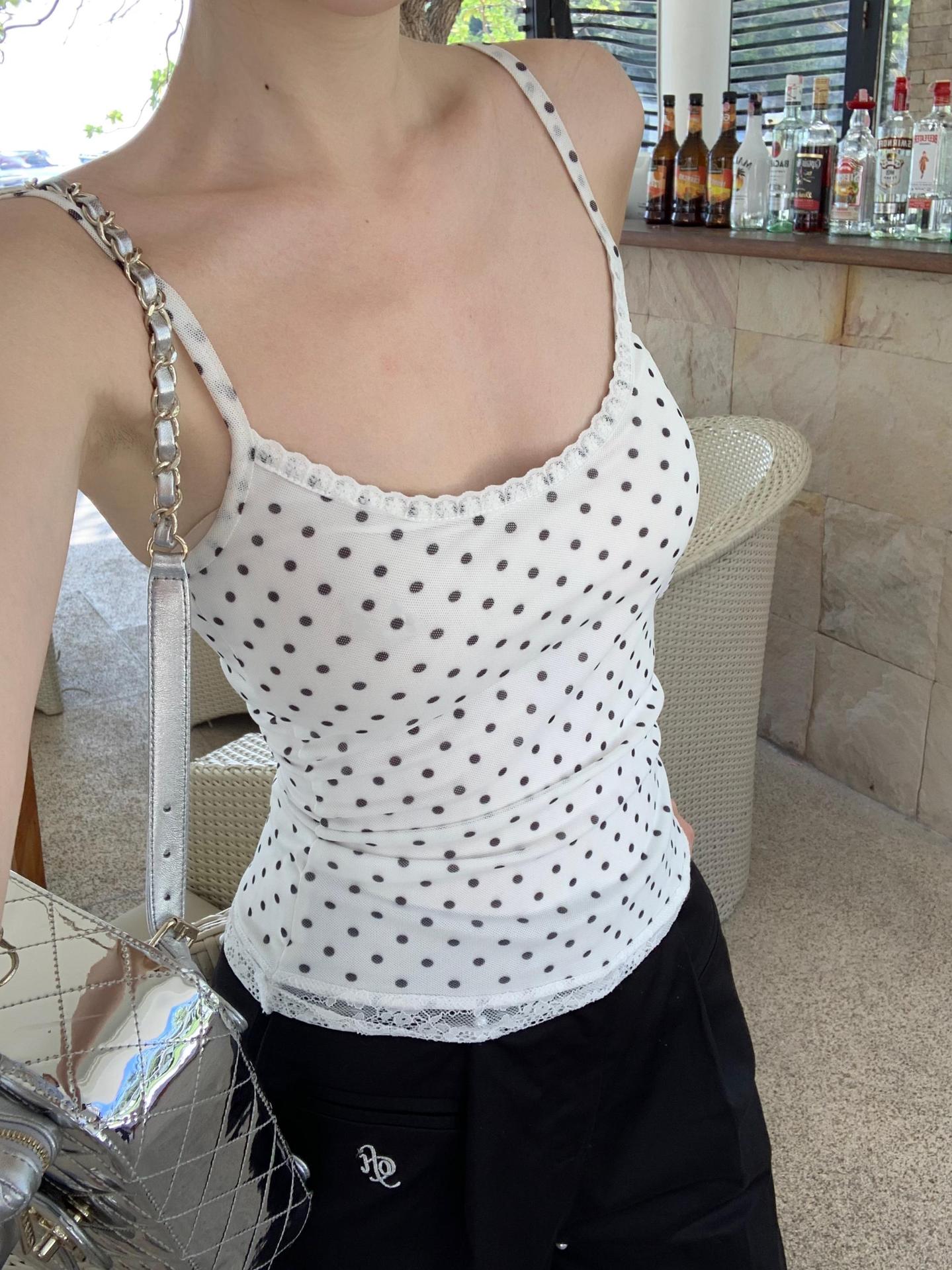 JMA-634 实拍甜辣风波点假两件蕾丝吊带衫女芭蕾风修身纯欲风打底内搭背心