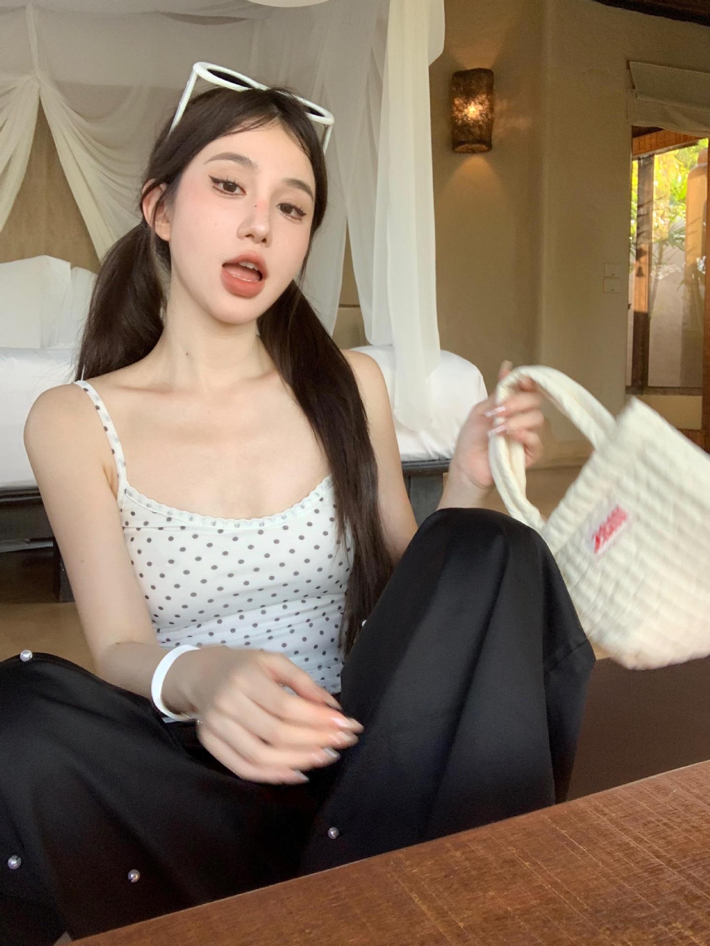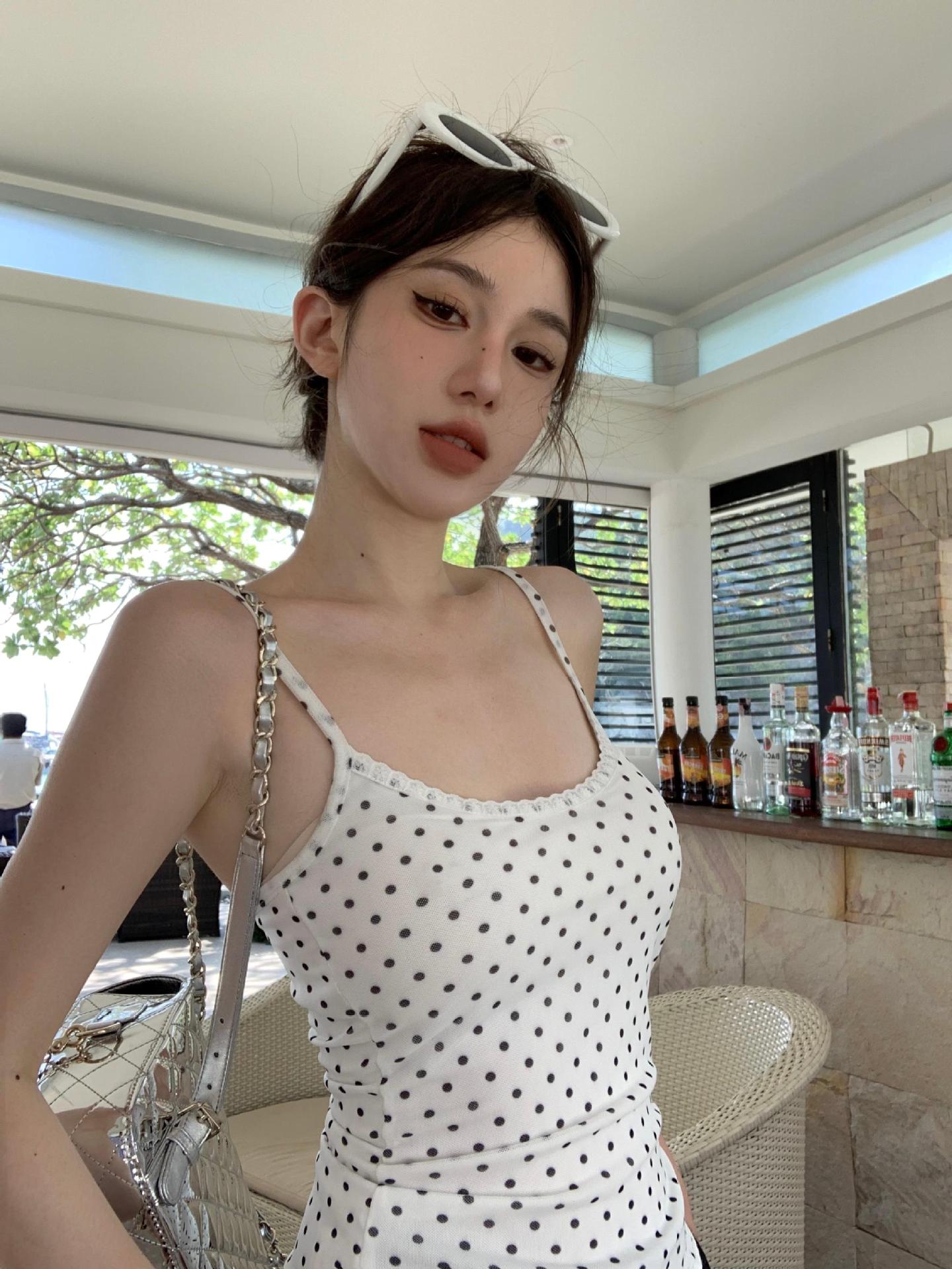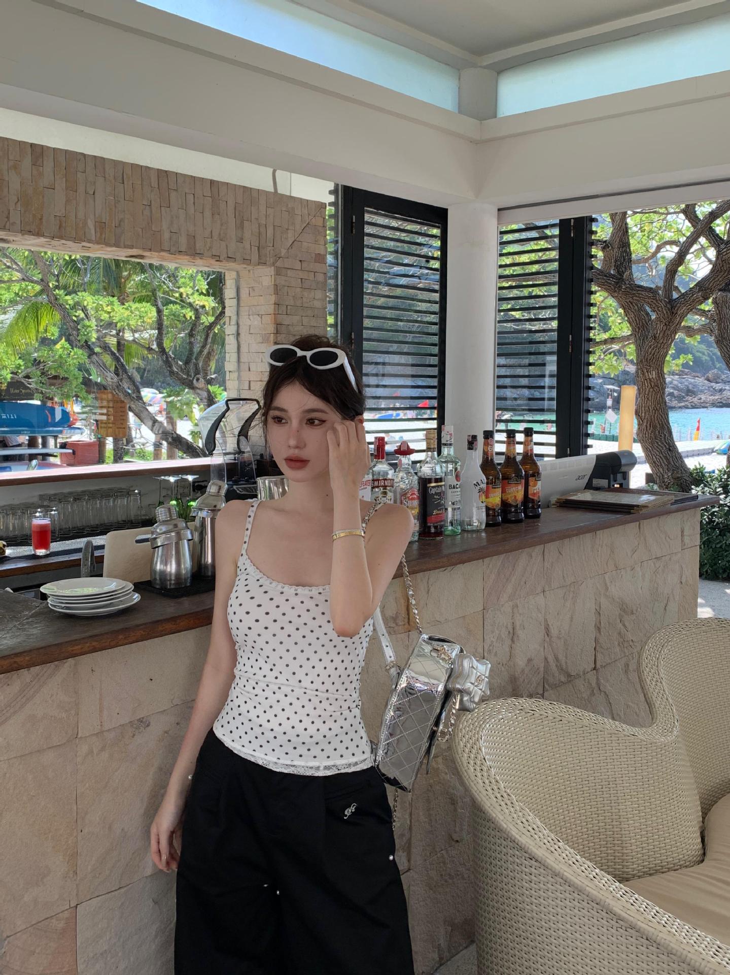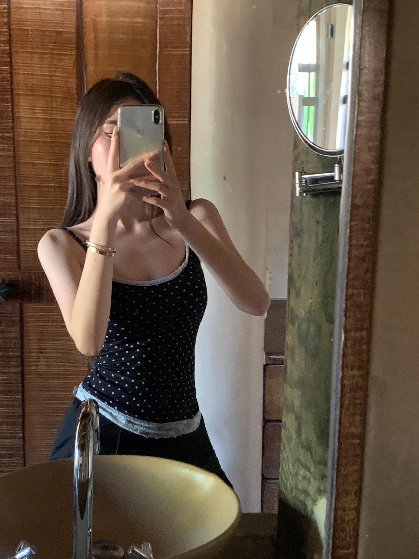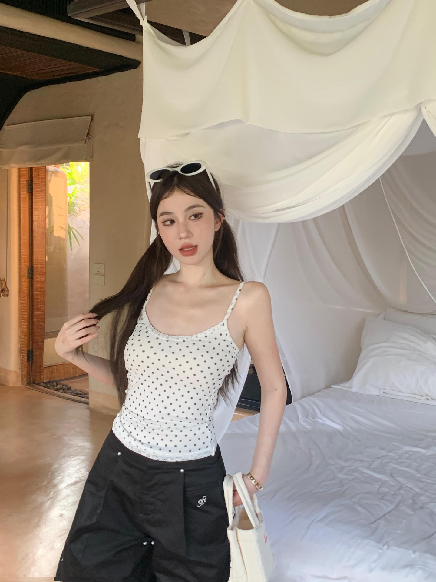 JMA-634 实拍甜辣风波点假两件蕾丝吊带衫女芭蕾风修身纯欲风打底内搭背心