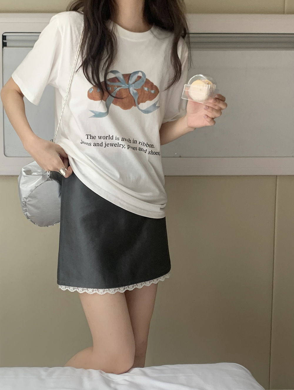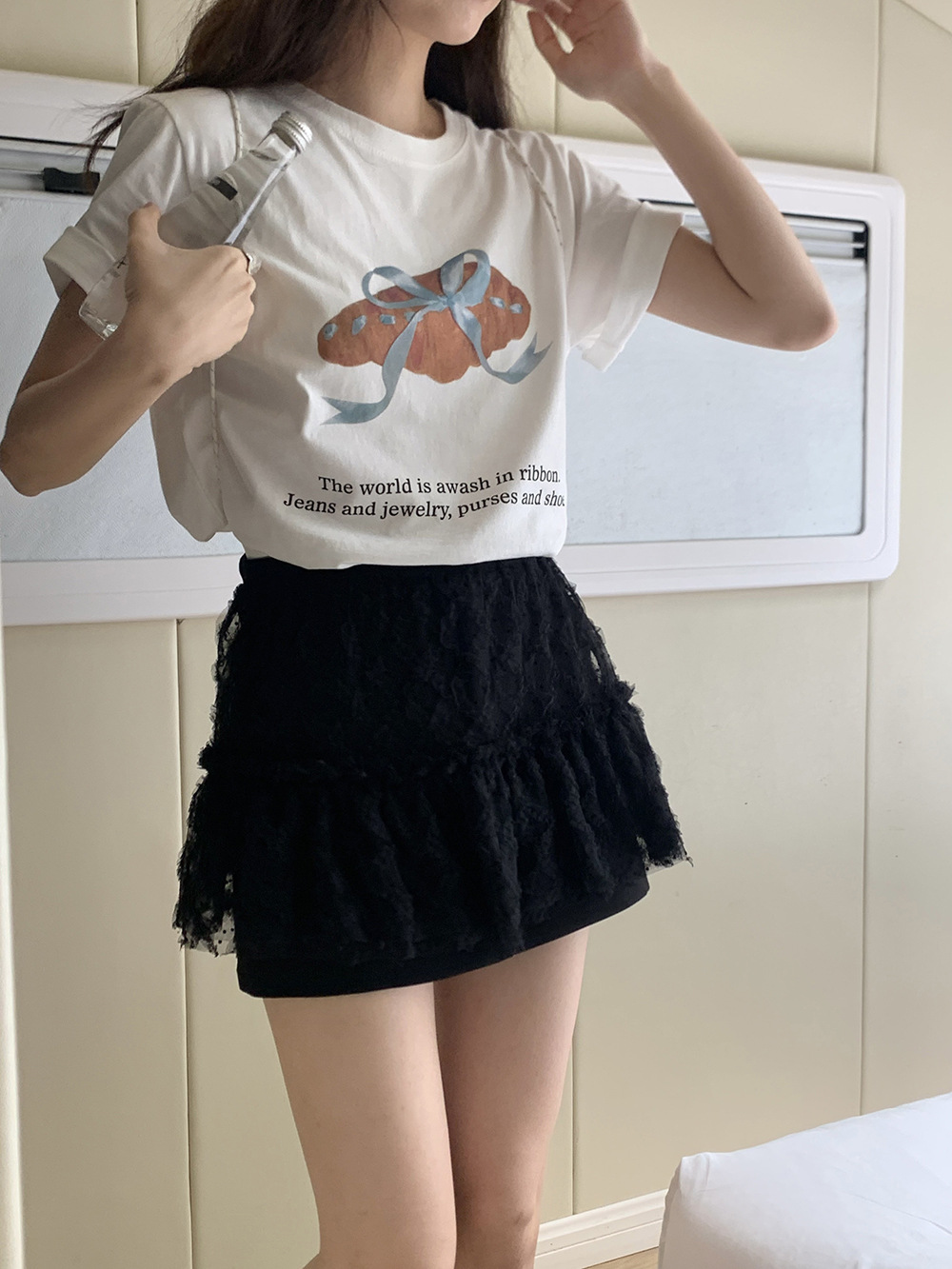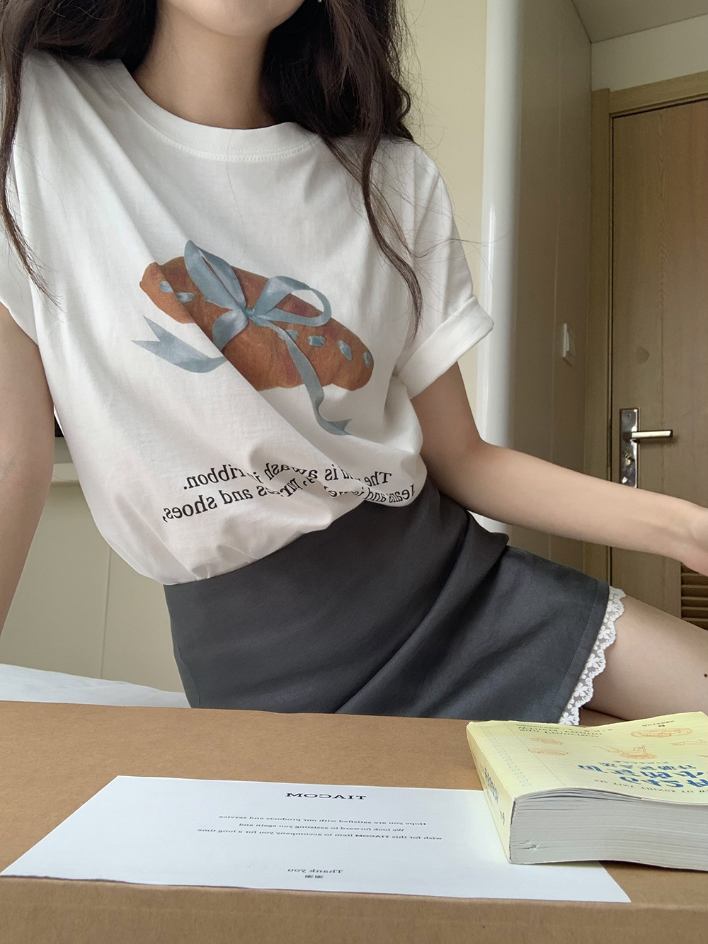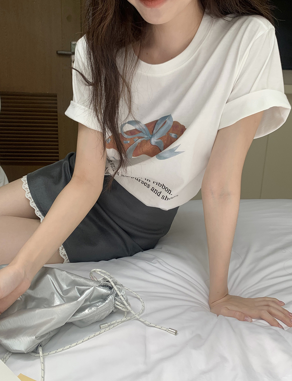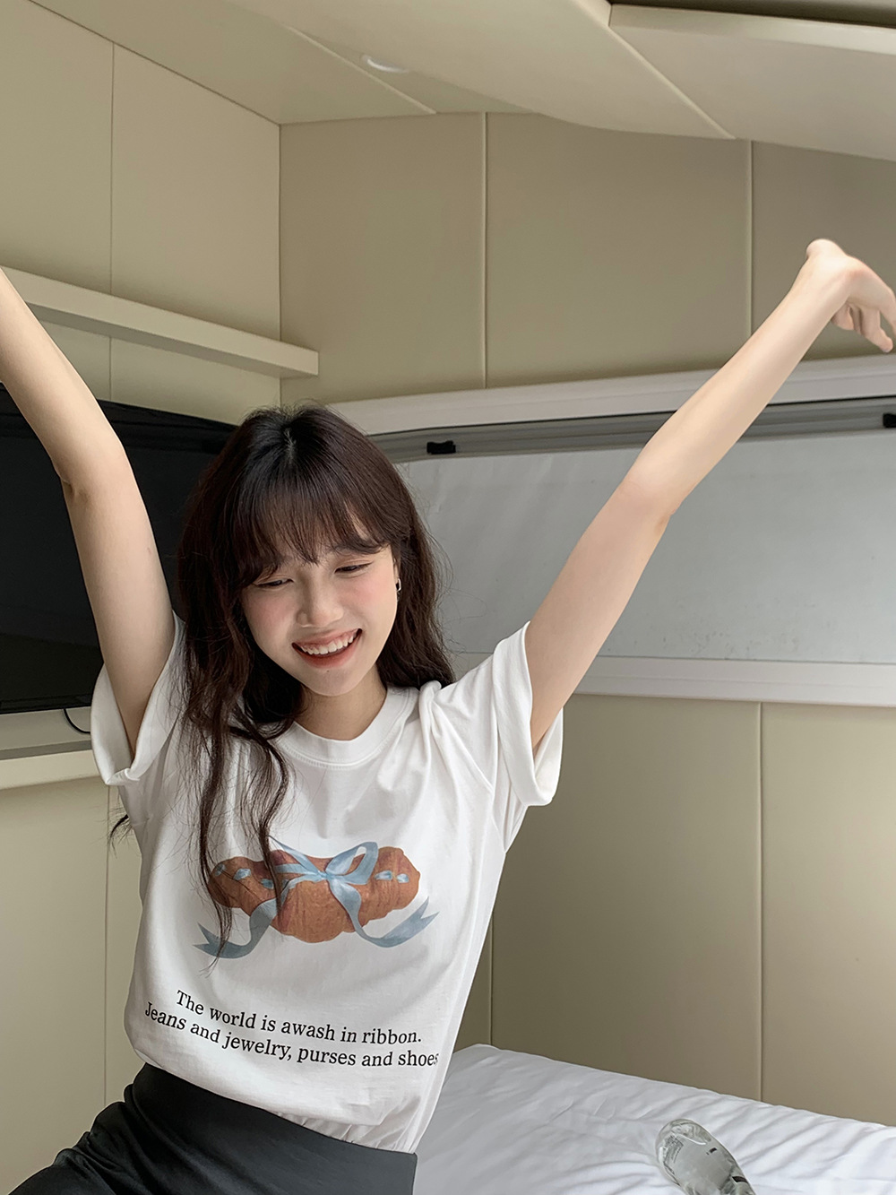 JMA-657 实拍 2024夏季新款韩系牛角包蓝蝴蝶结丝带复古可爱圆领短袖T恤女