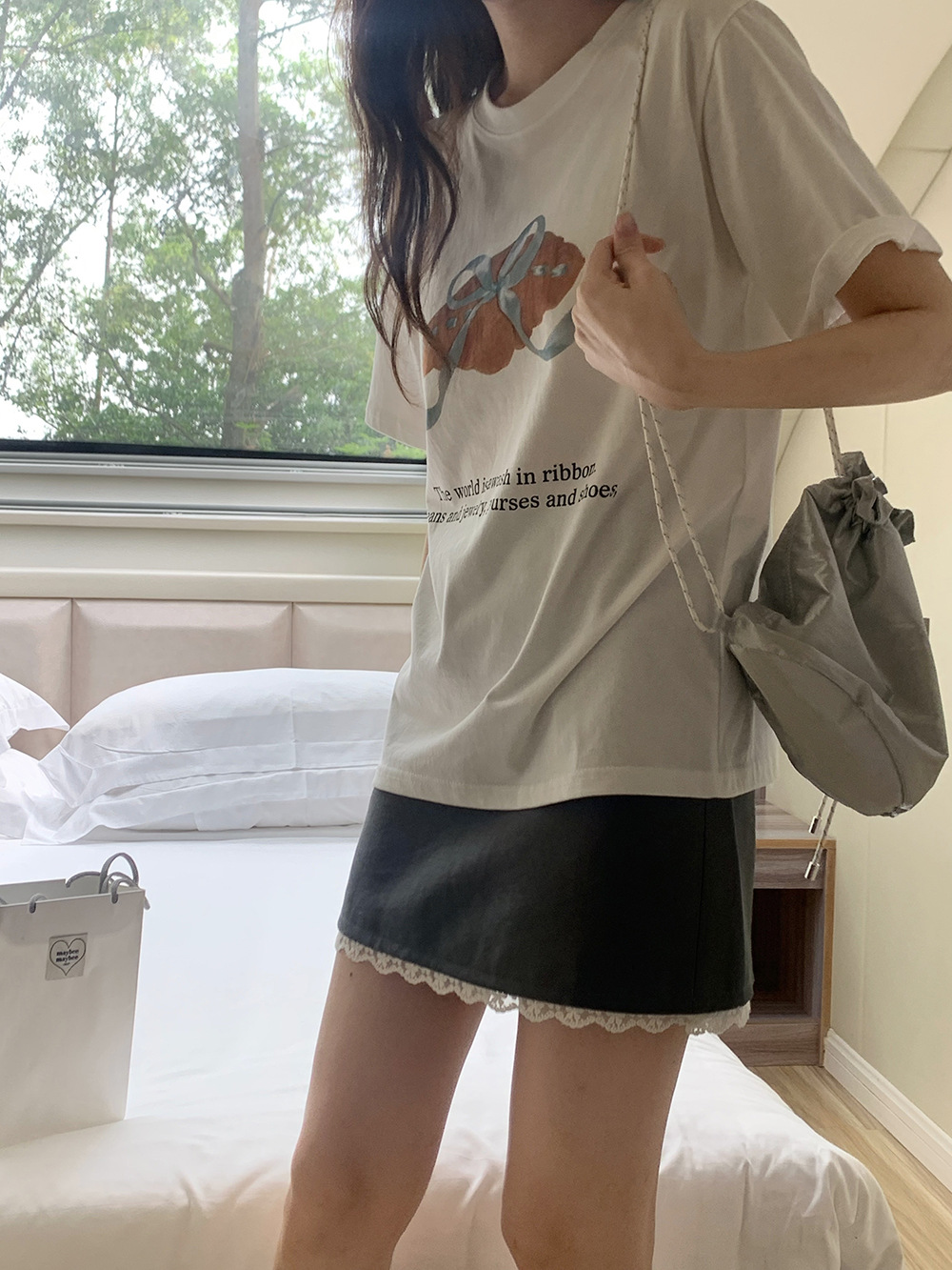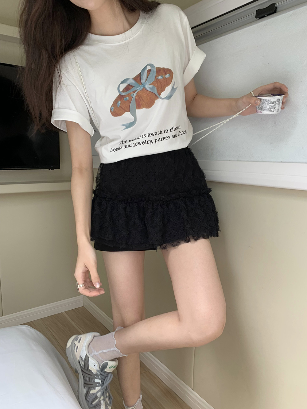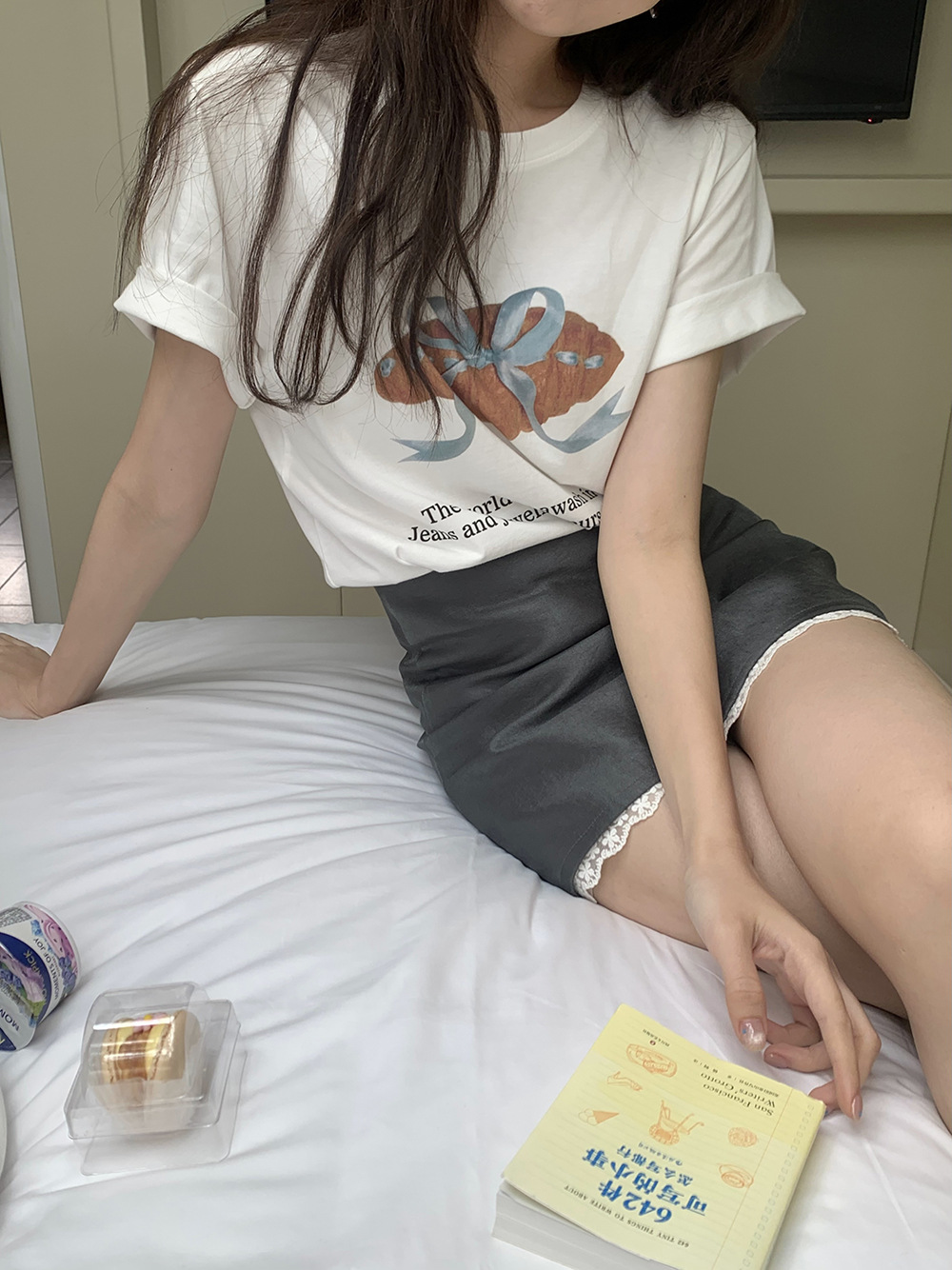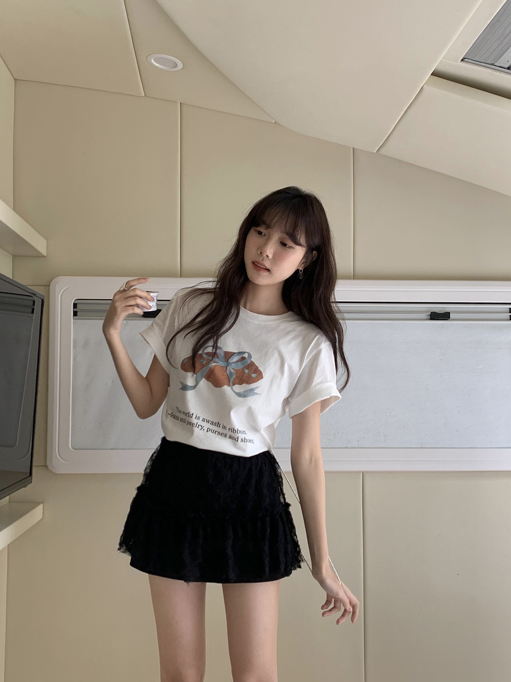 JMA-657 实拍 2024夏季新款韩系牛角包蓝蝴蝶结丝带复古可爱圆领短袖T恤女