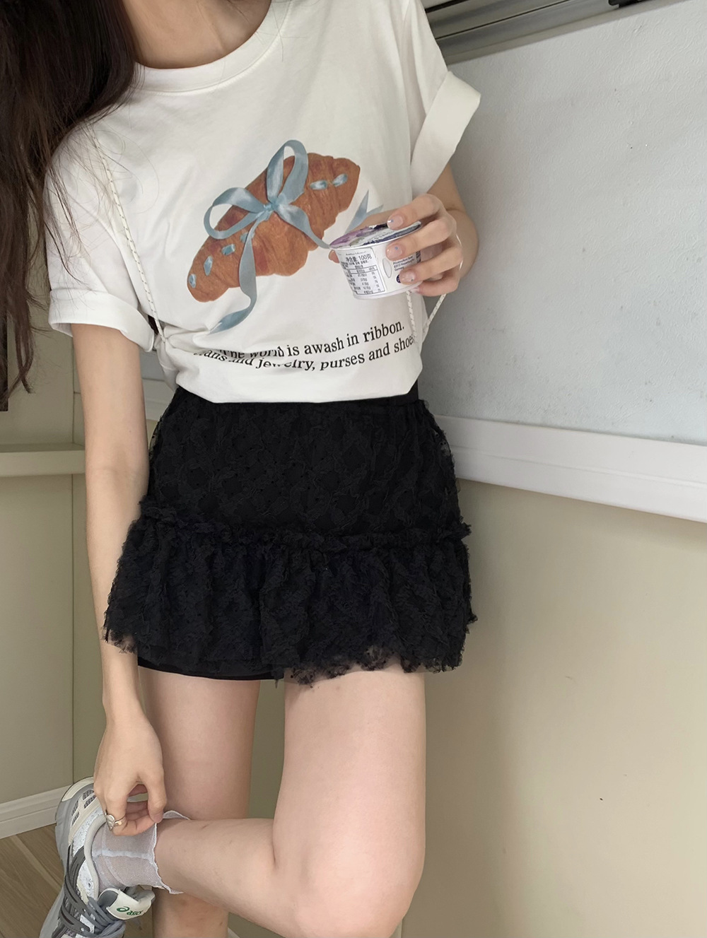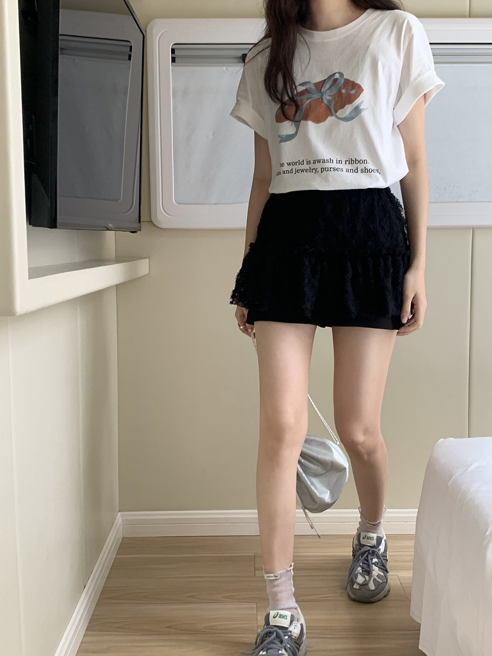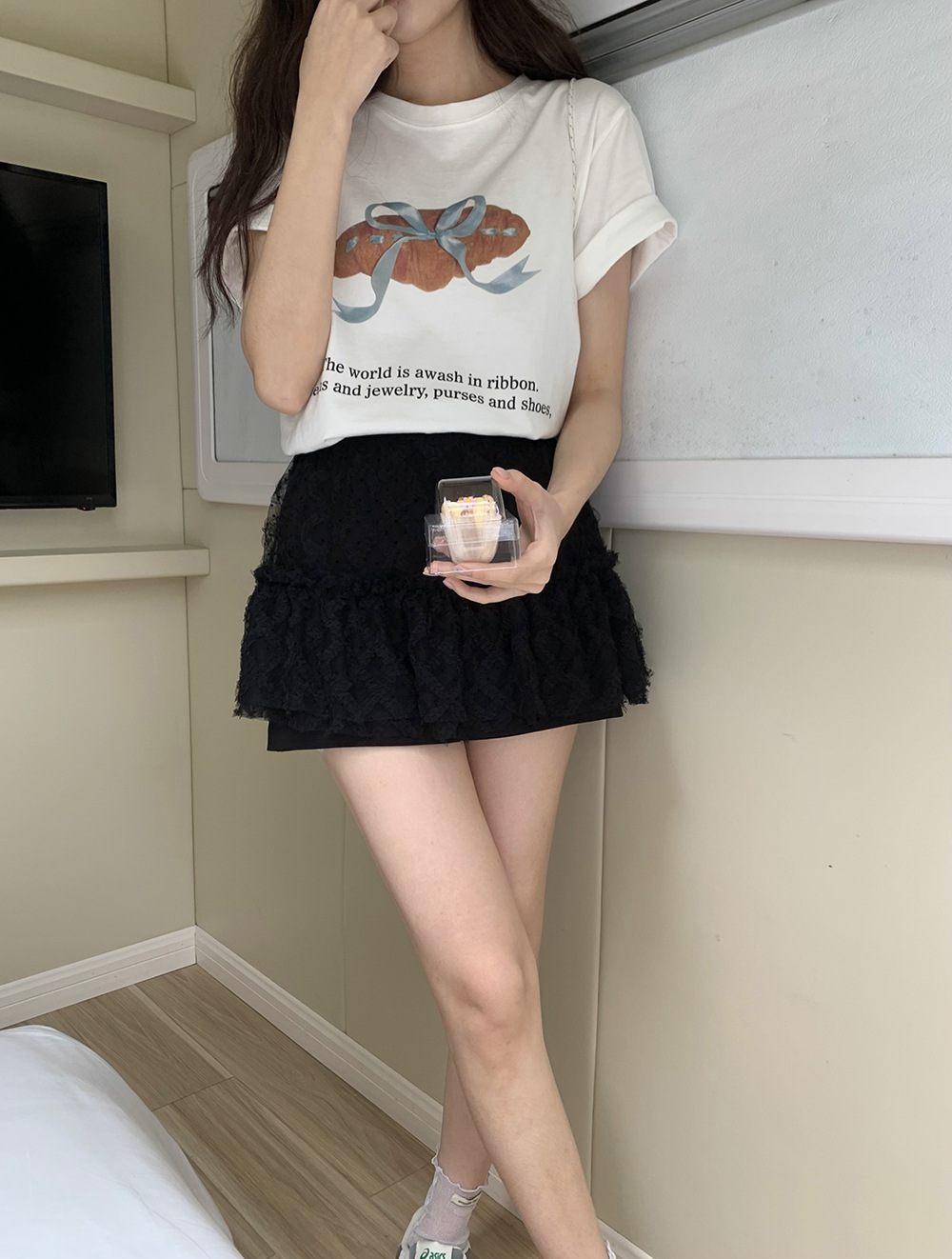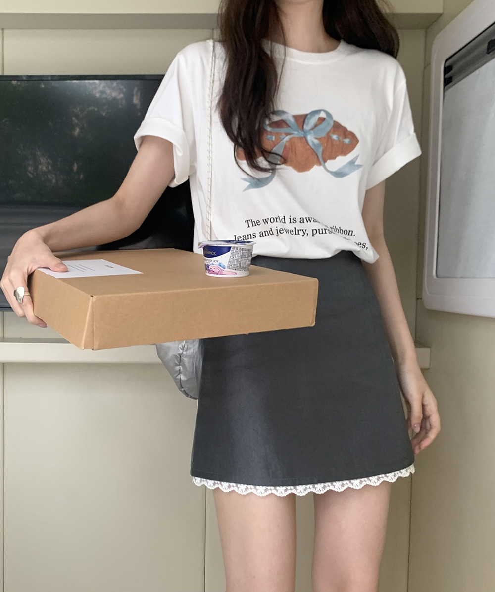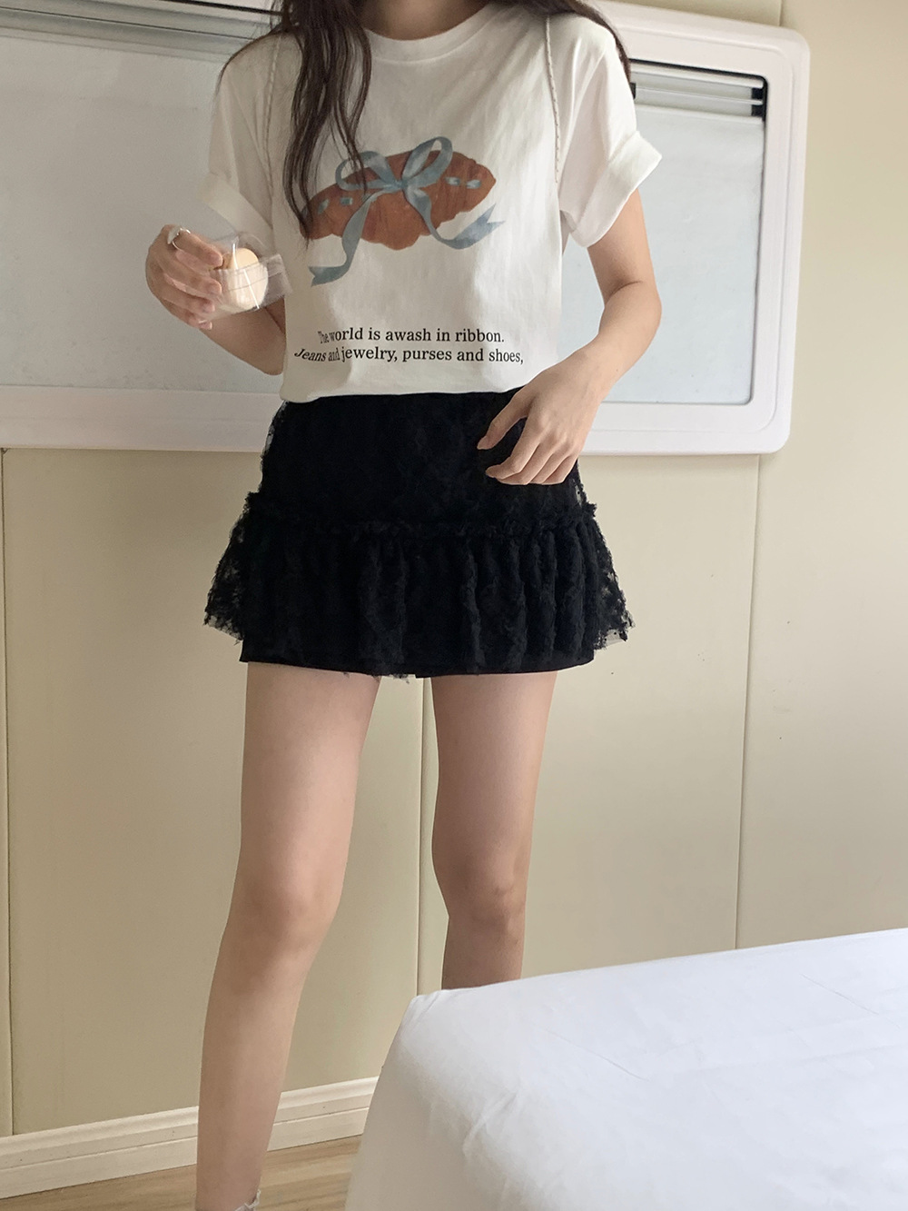 JMA-657 实拍 2024夏季新款韩系牛角包蓝蝴蝶结丝带复古可爱圆领短袖T恤女