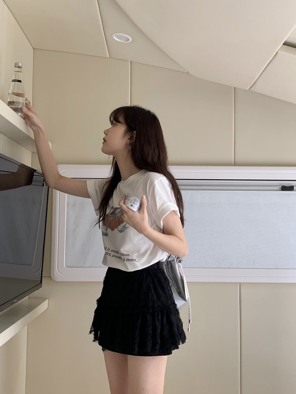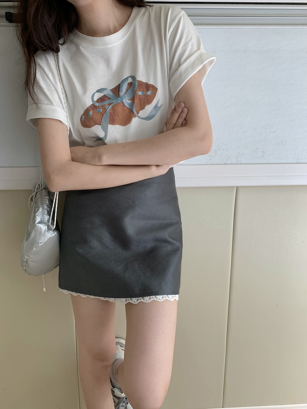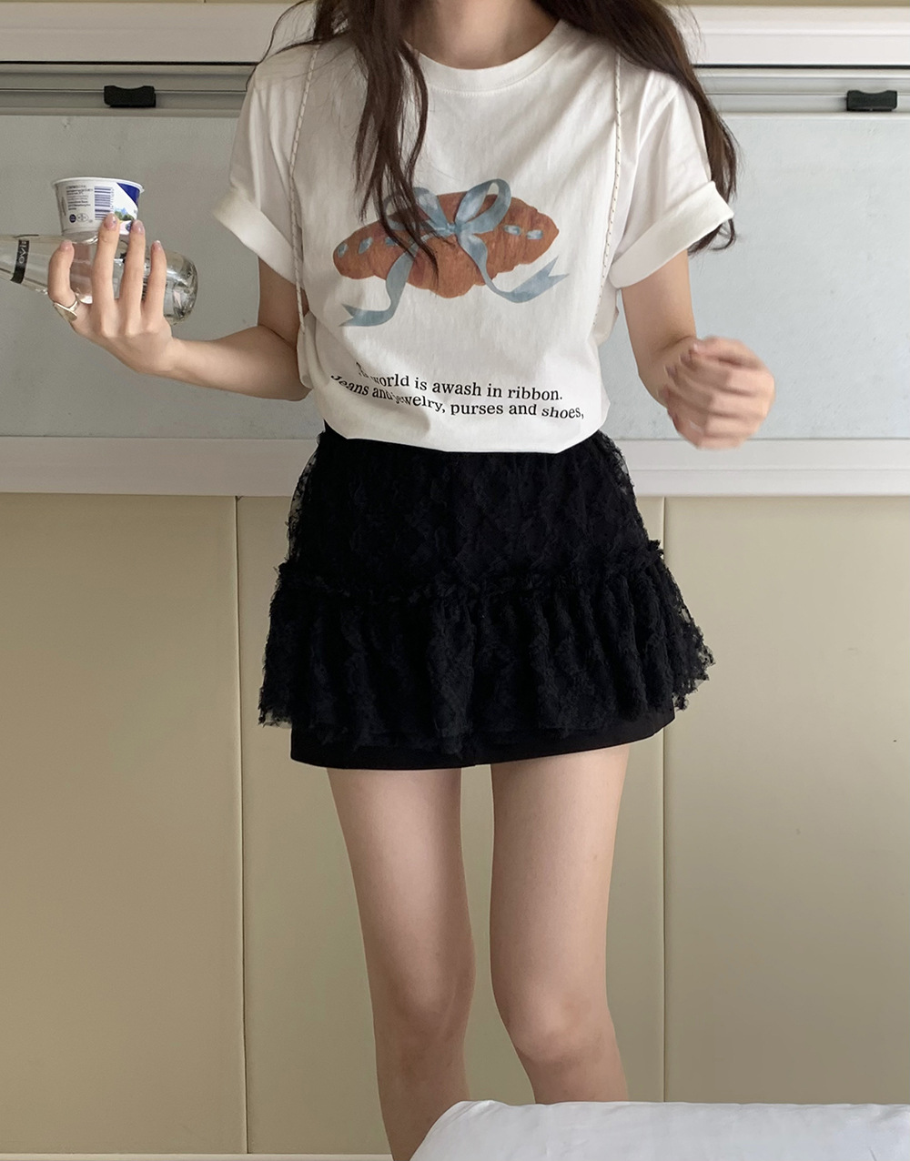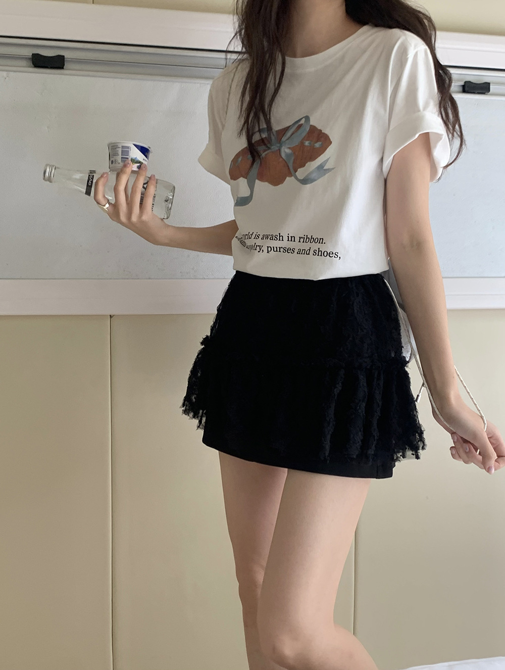 JMA-657 实拍 2024夏季新款韩系牛角包蓝蝴蝶结丝带复古可爱圆领短袖T恤女