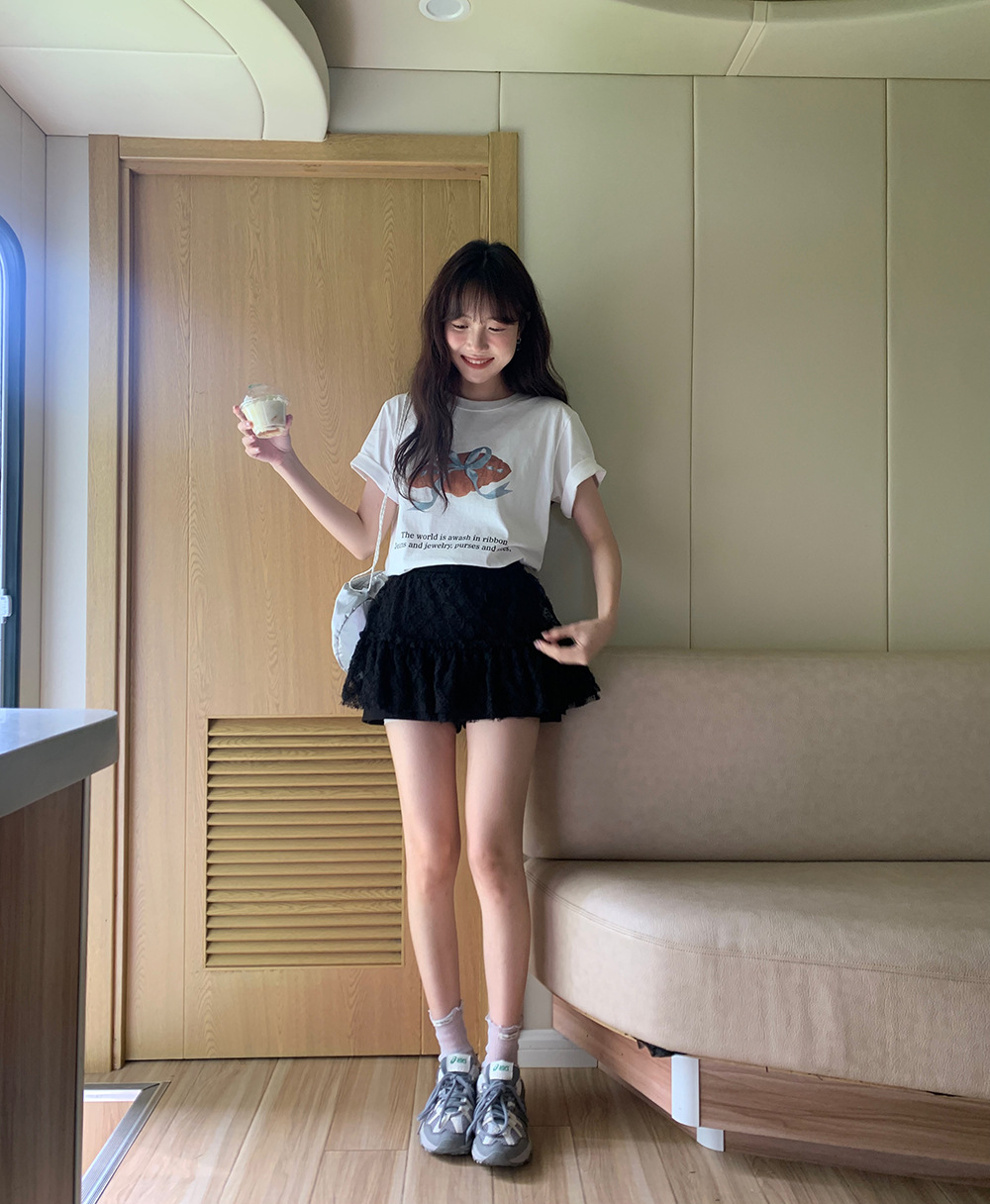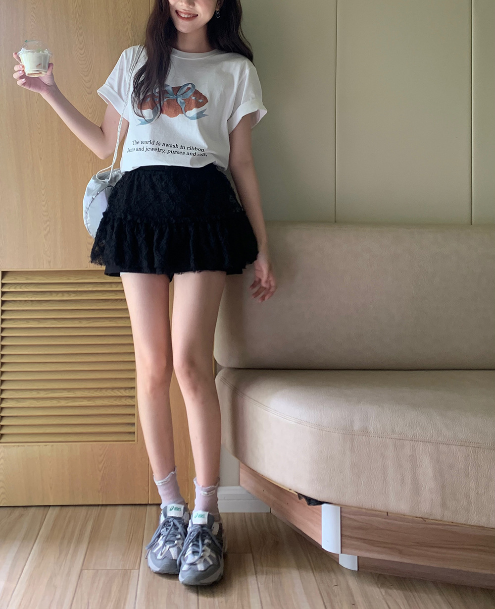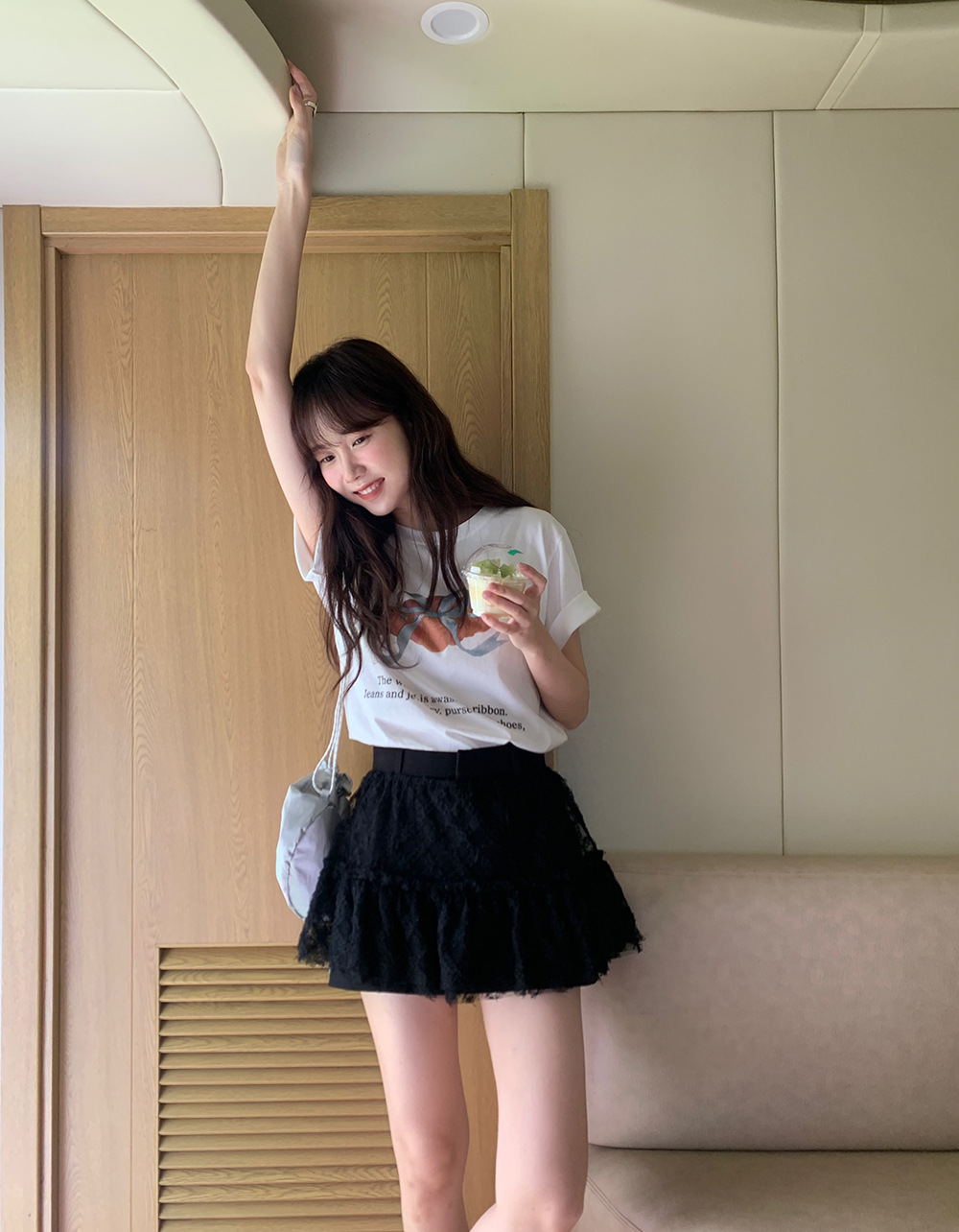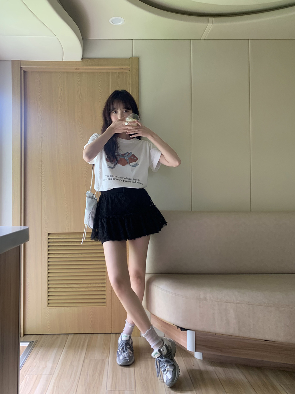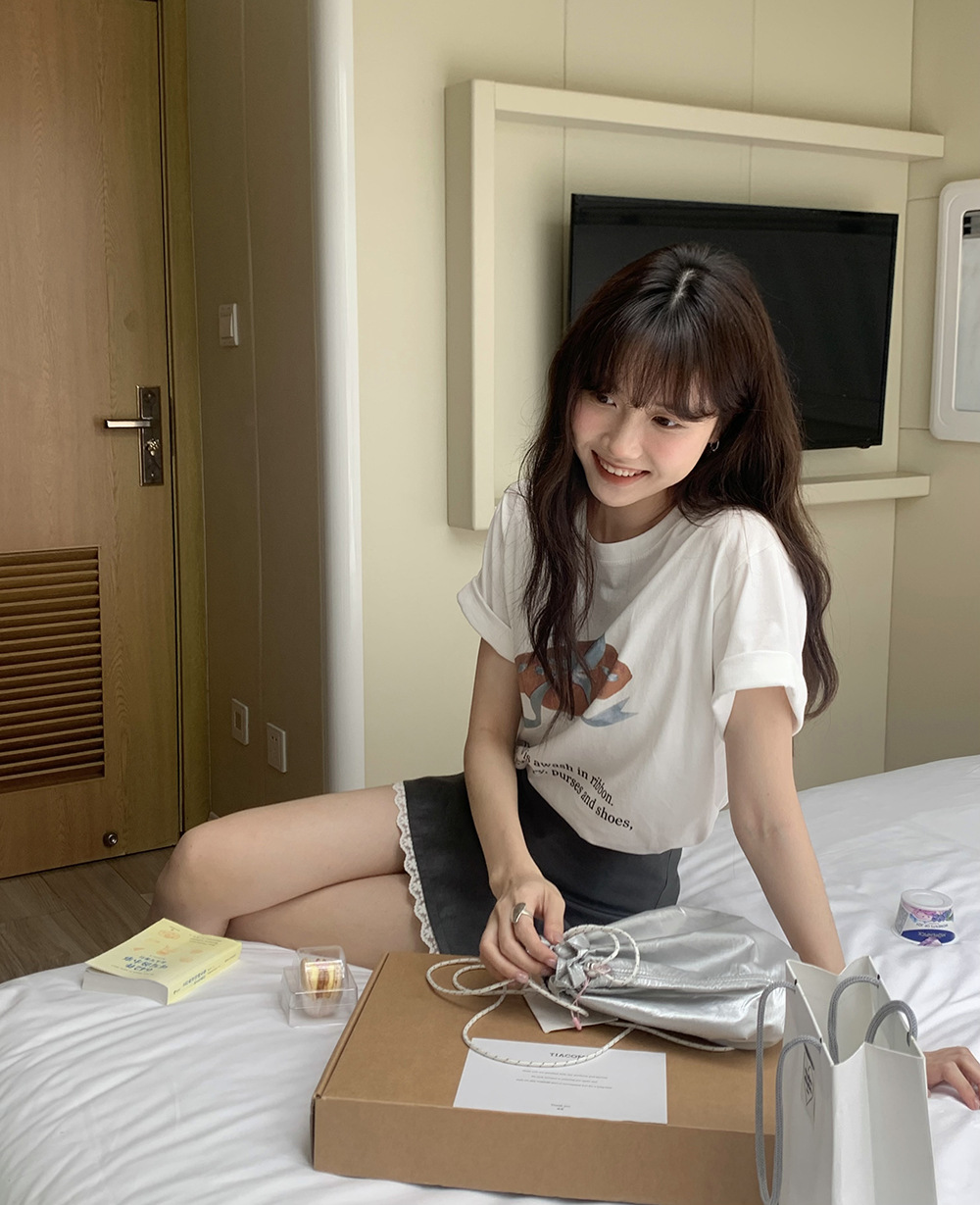 JMA-657 实拍 2024夏季新款韩系牛角包蓝蝴蝶结丝带复古可爱圆领短袖T恤女