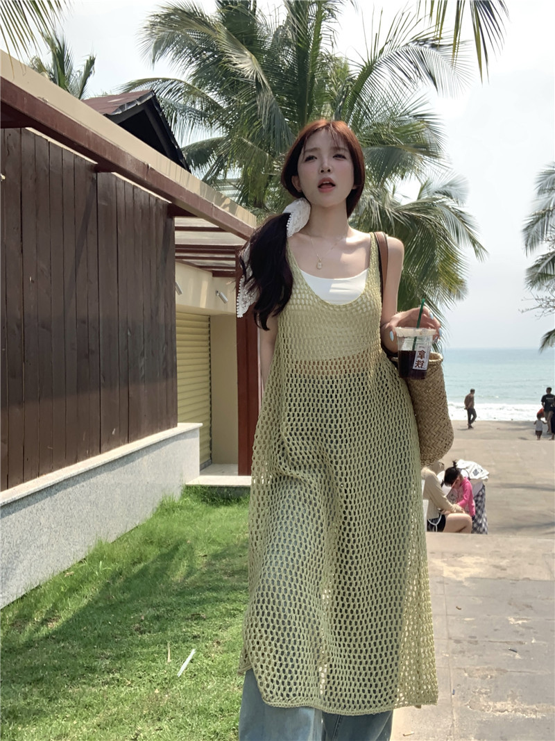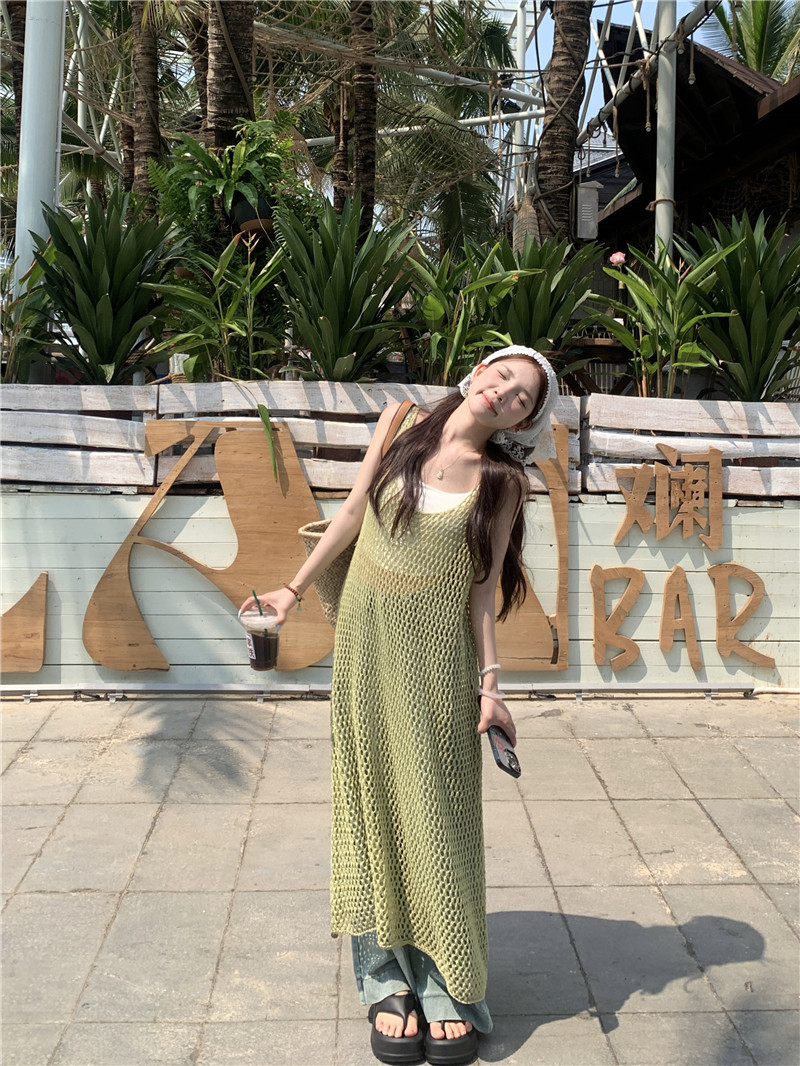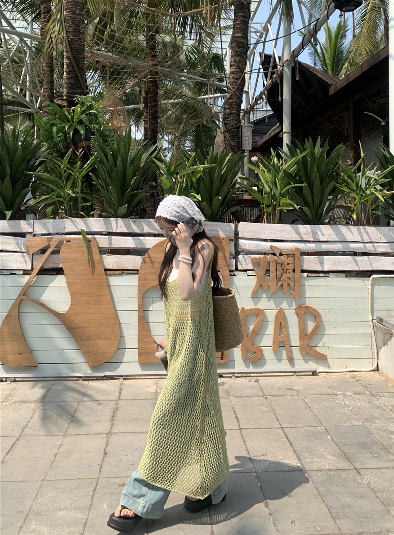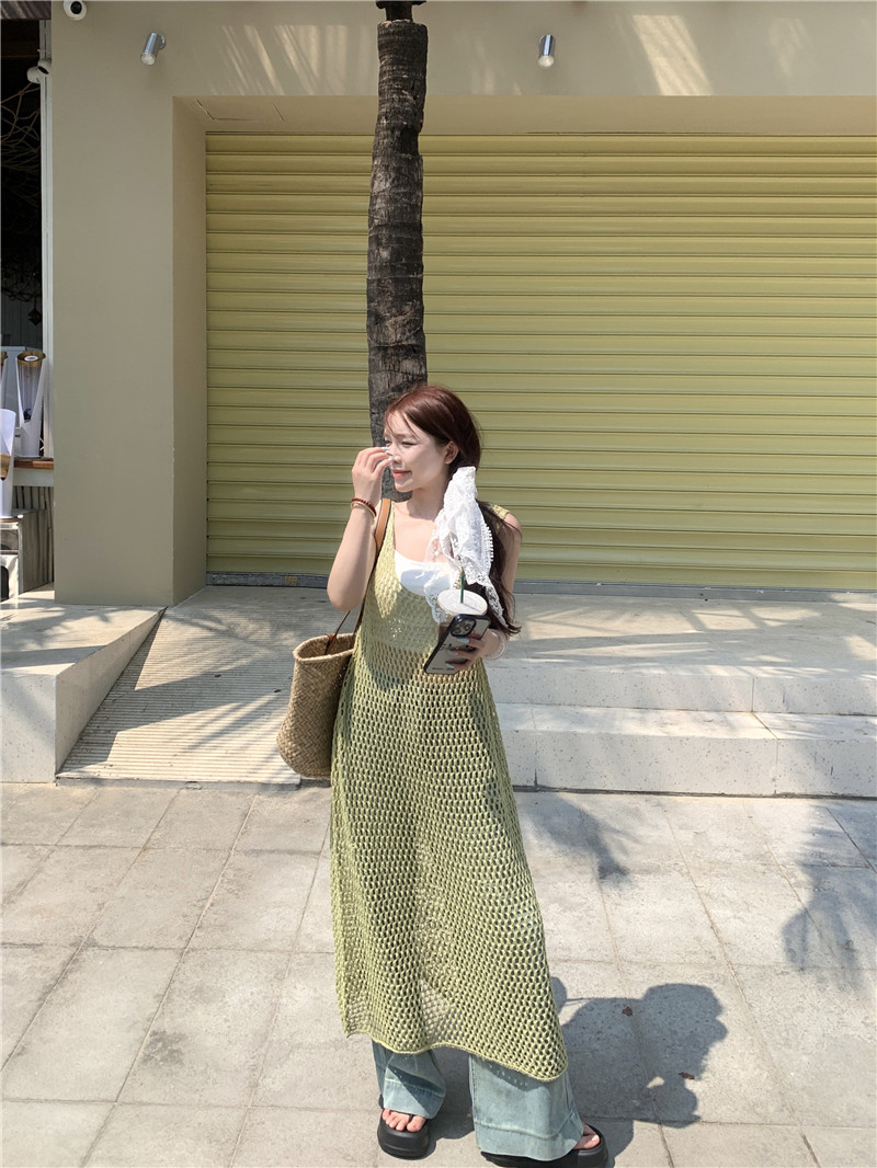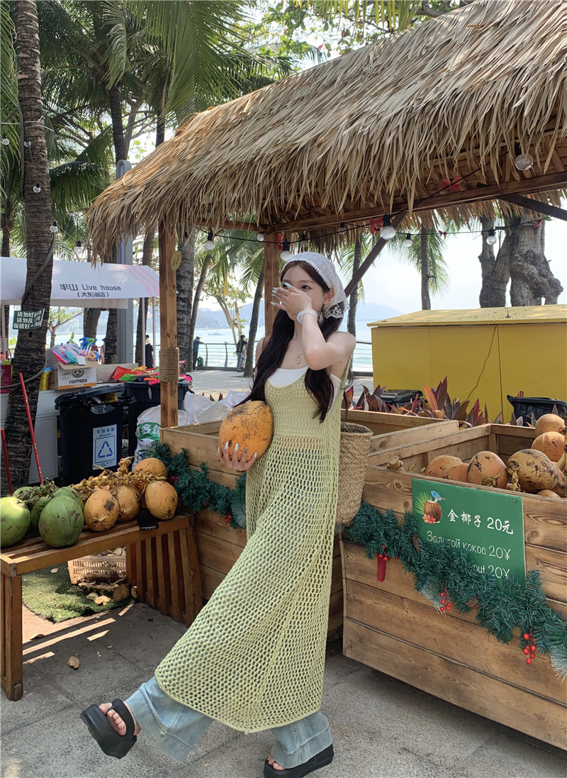 JMA-668 实拍 2024夏季新款韩版柠檬绿茶小众设计感镂空叠穿背心裙连衣裙