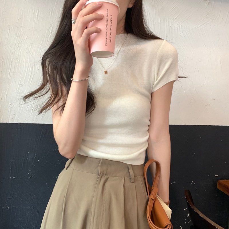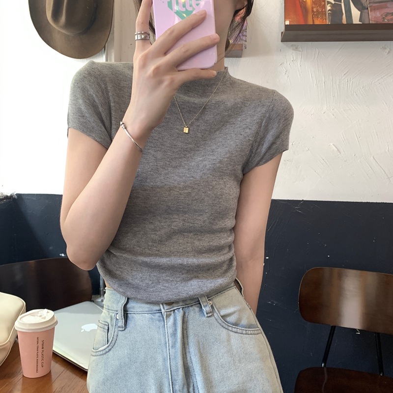 JMA-690 实拍 2024春夏韩版修身半高领褶皱设计感辣妹短款针织短袖T恤上衣