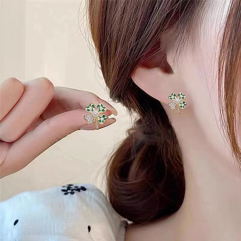 JME-666 法式时尚简约镶钻绿色格子四叶草耳钉小巧百搭耳环优雅百搭耳饰女