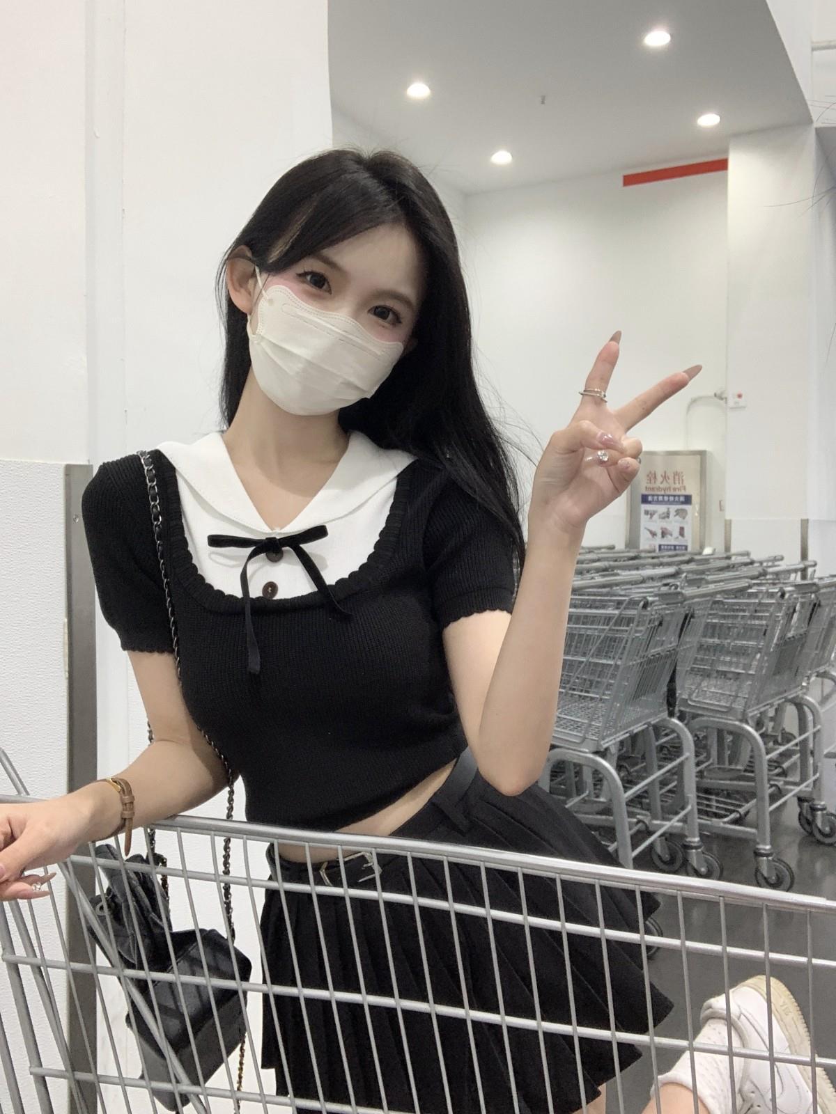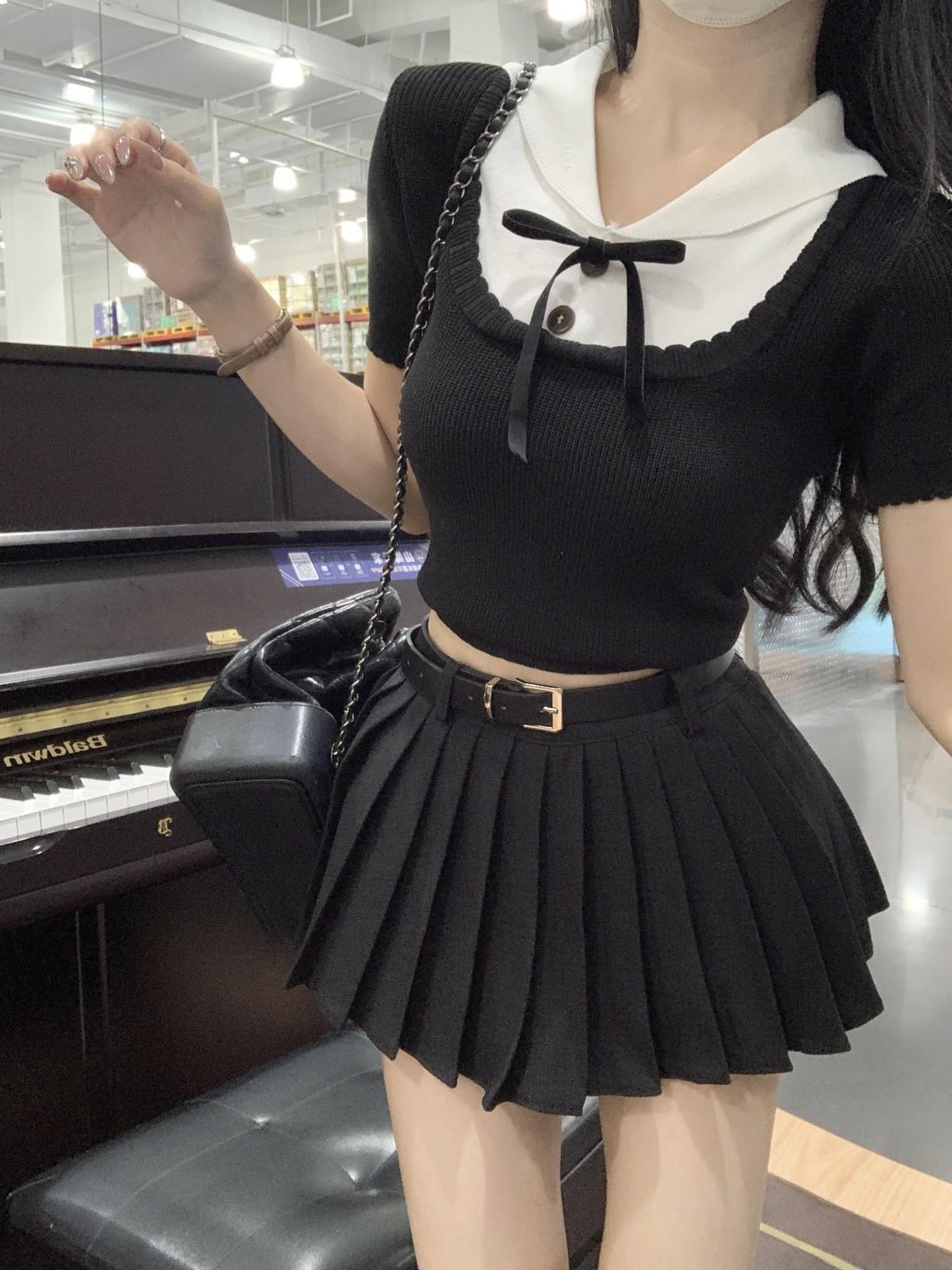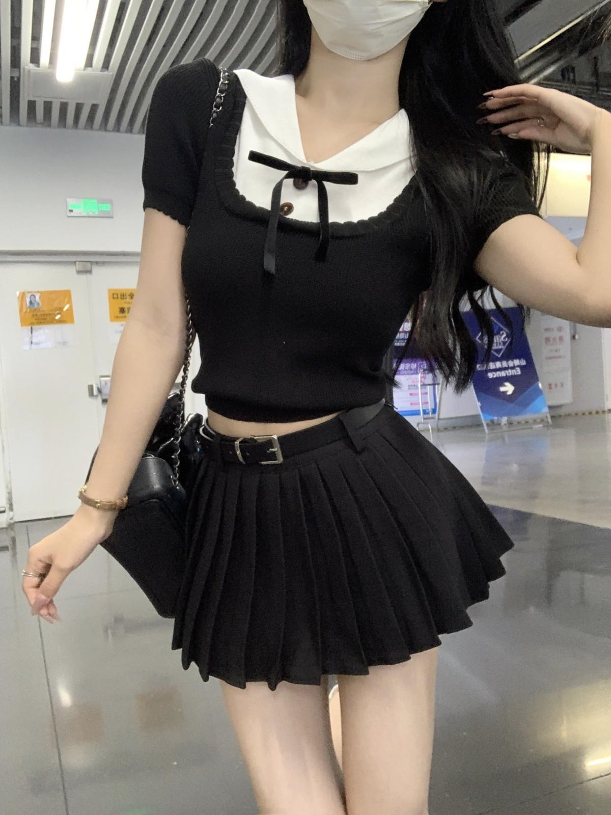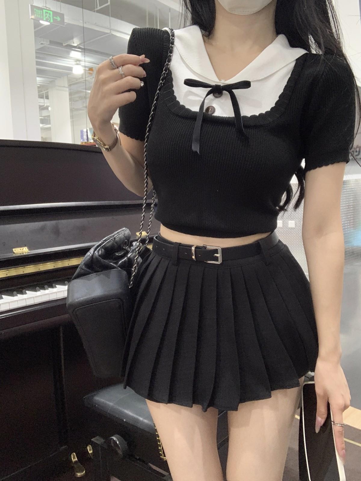 JMA-698 夏季韩版修身小香风娃娃领撞色设计感针织短袖T恤甜辣风短款上衣
