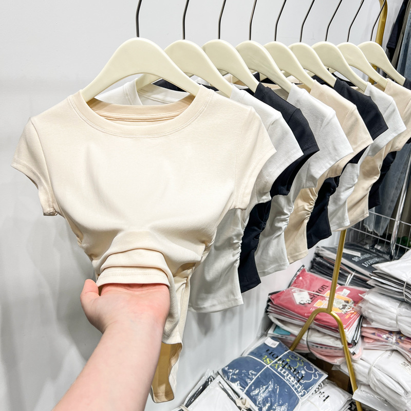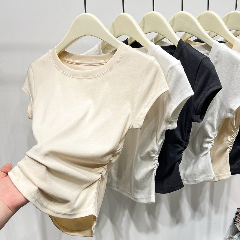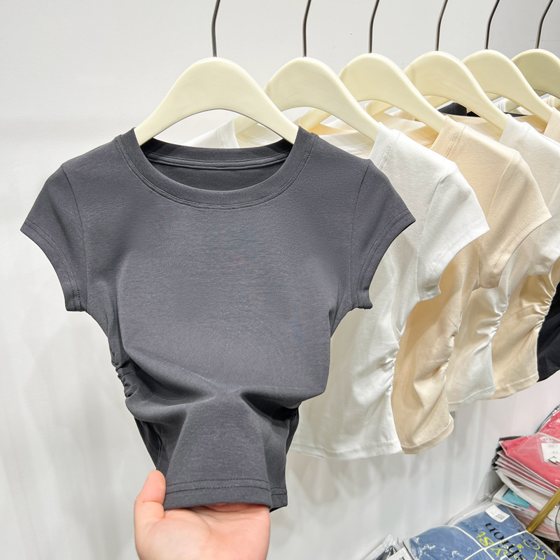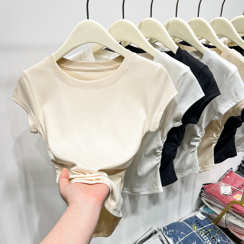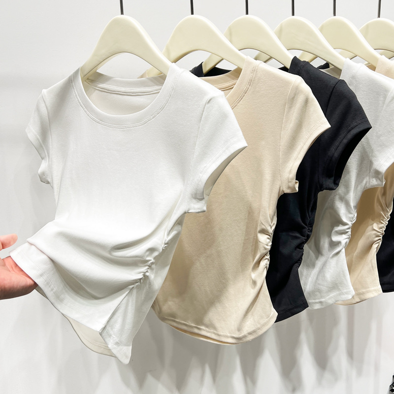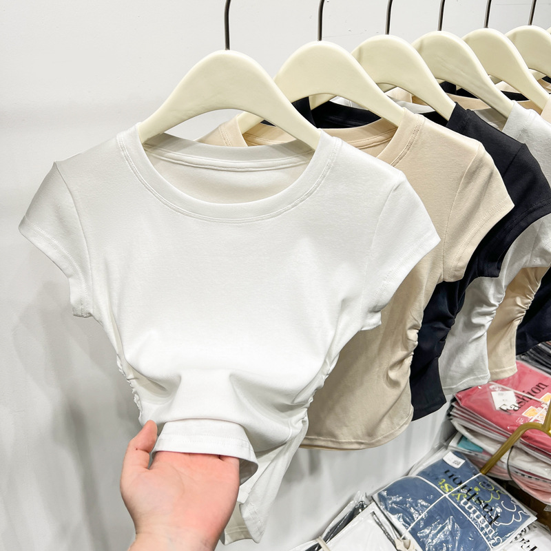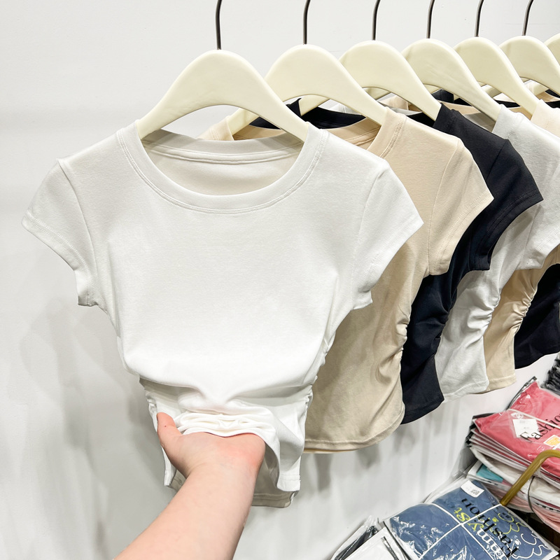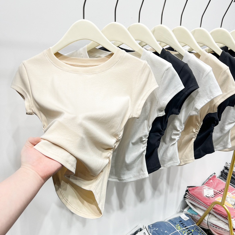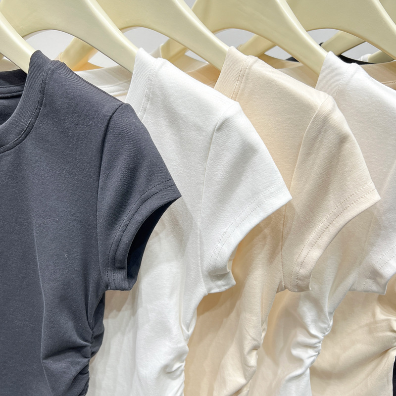 JMA-703 实拍 显瘦正肩短袖女t恤2023夏季新款法式设计感收腰抽褶纯欲上衣