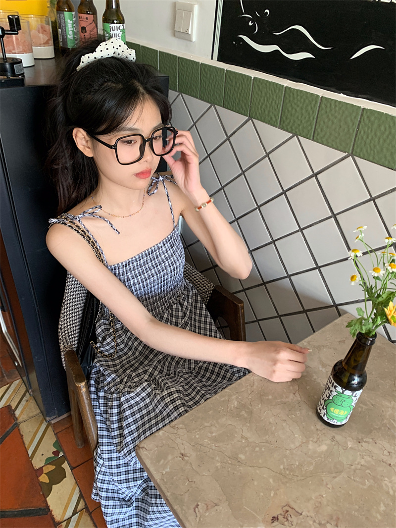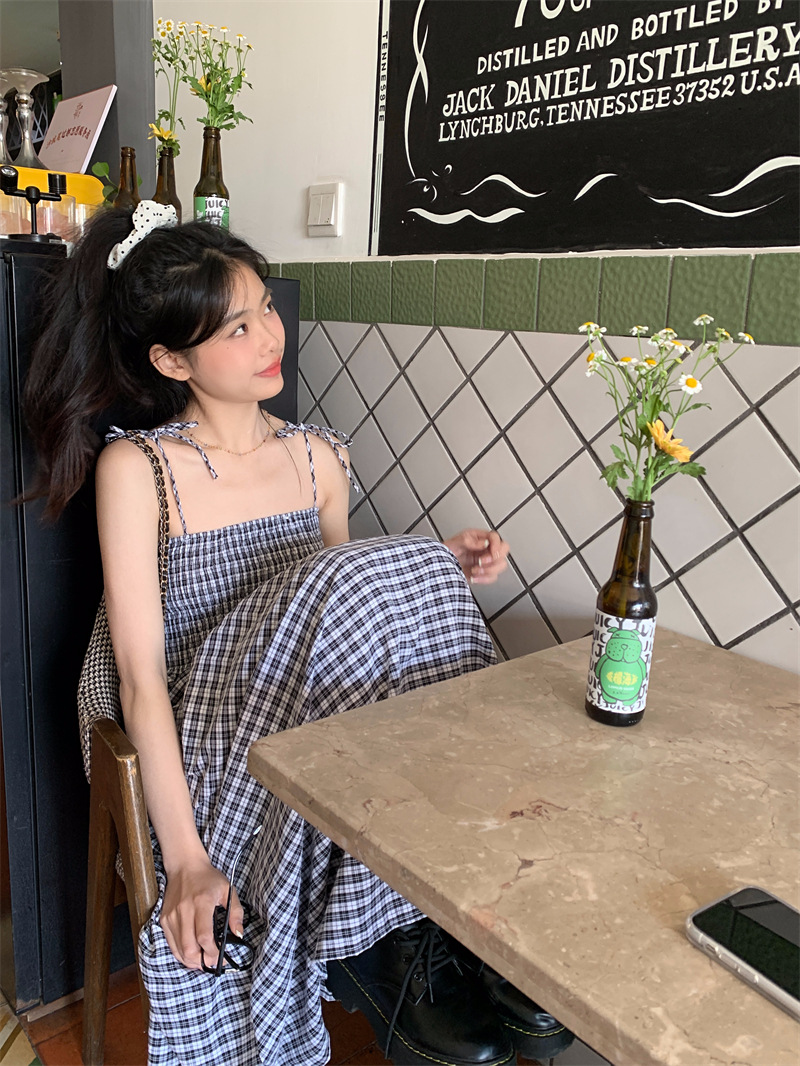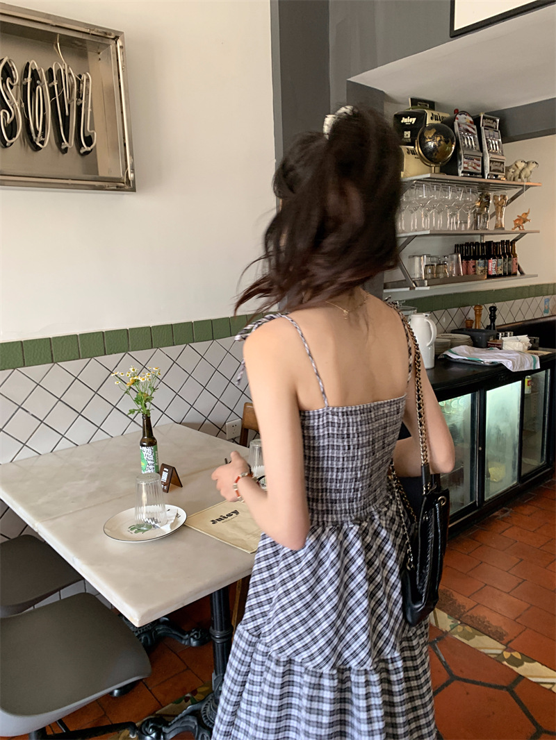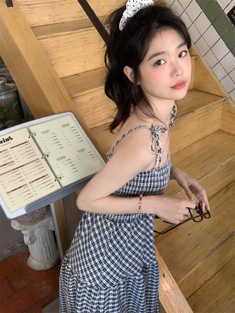 JMA-704 实拍 夏季韩版茶里茶气别致格子连衣裙子茶歇法式小香风吊带长裙
