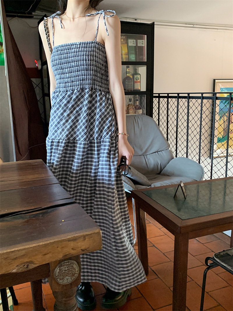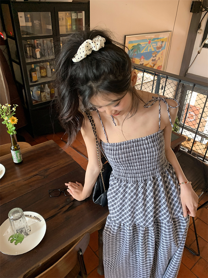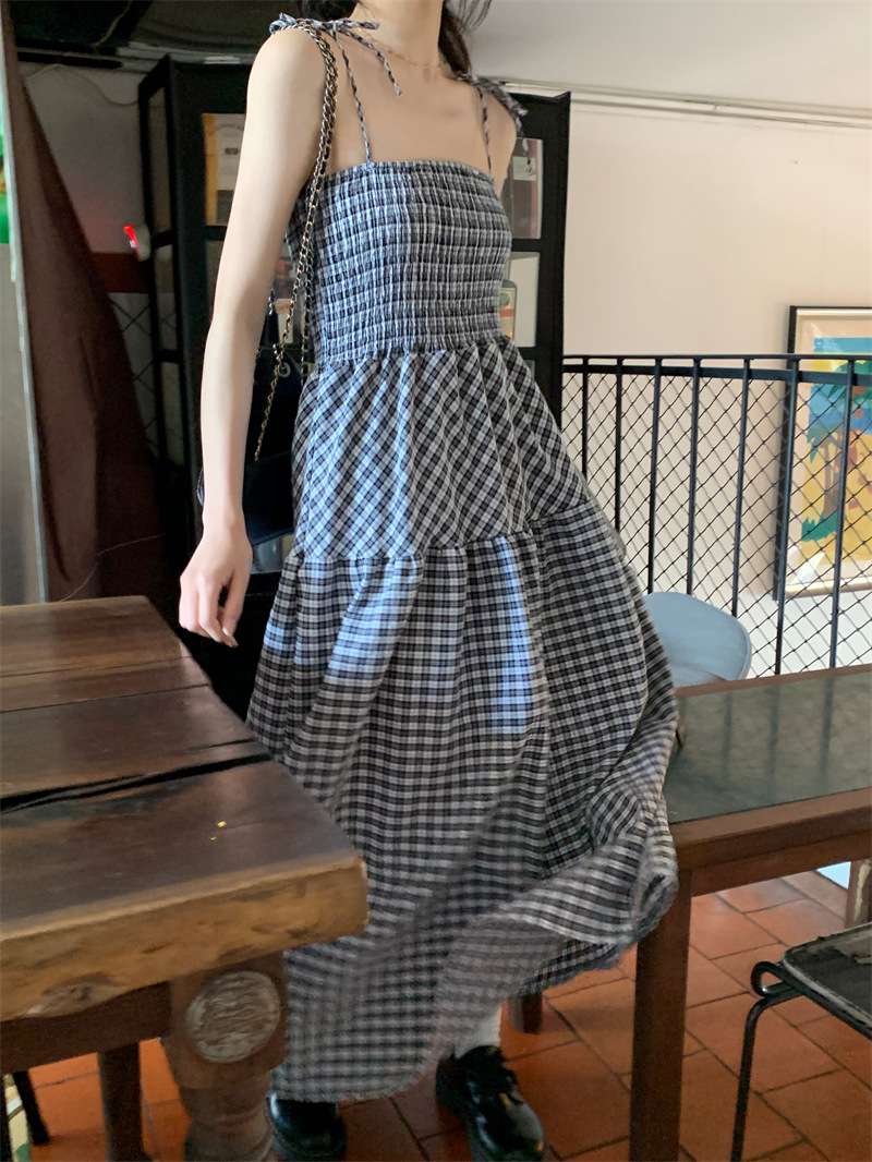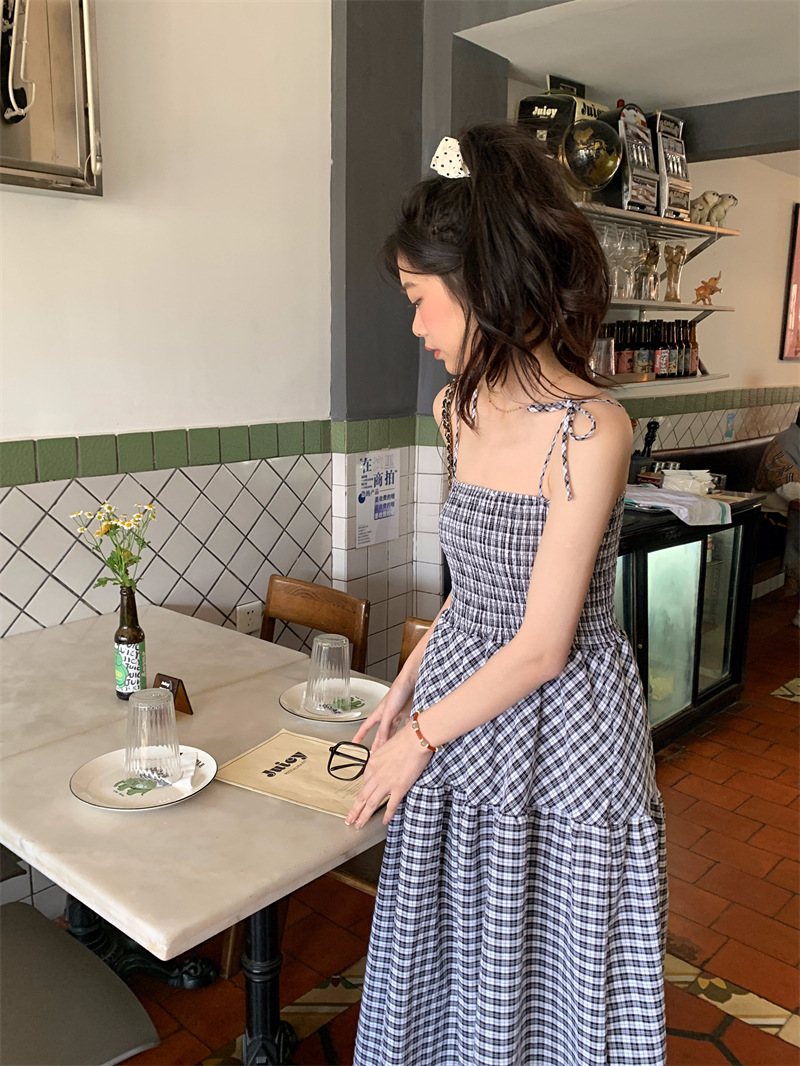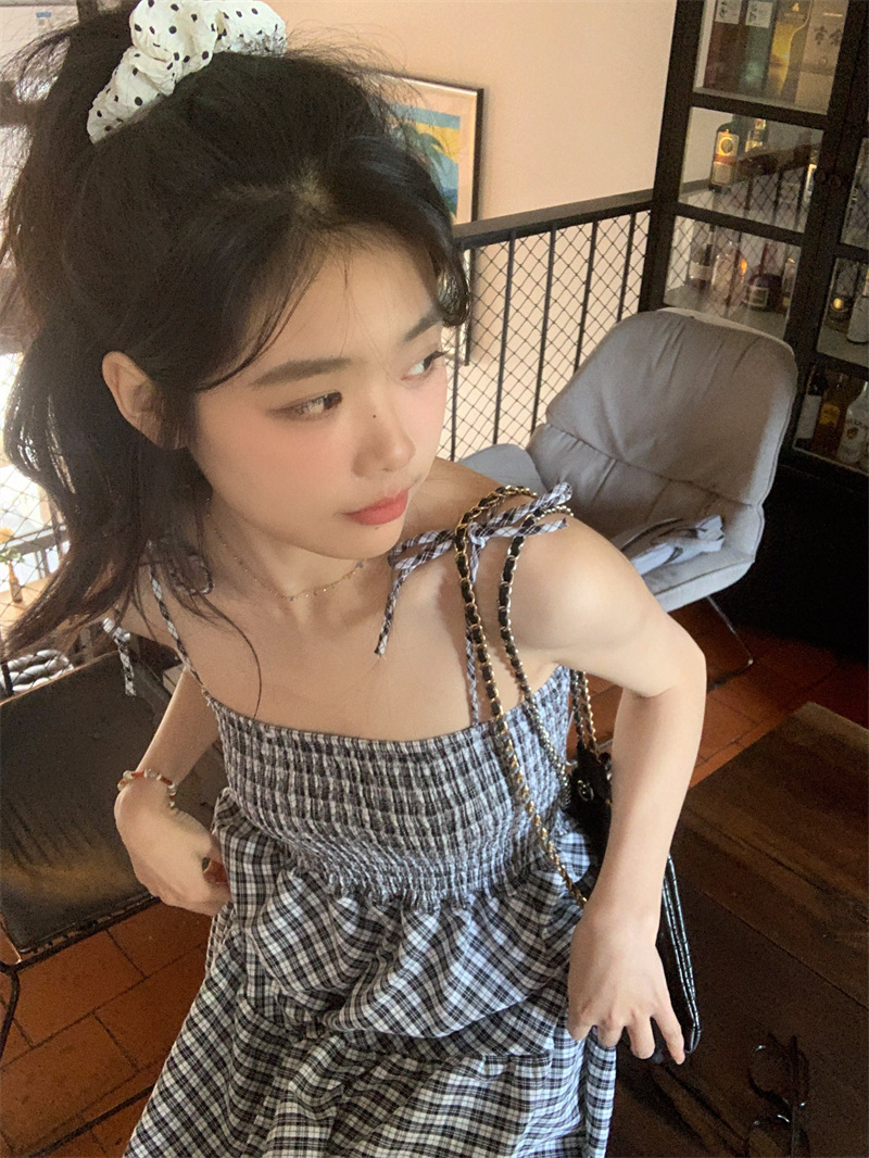 JMA-704 实拍 夏季韩版茶里茶气别致格子连衣裙子茶歇法式小香风吊带长裙