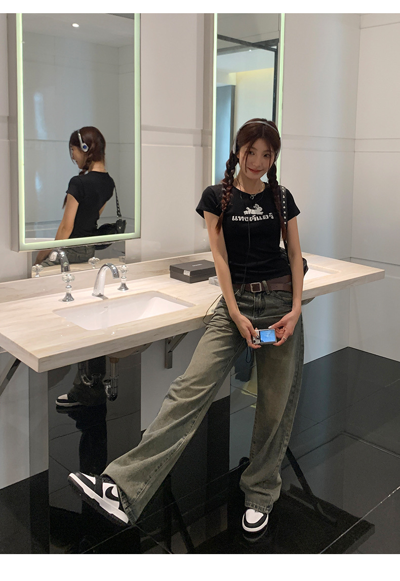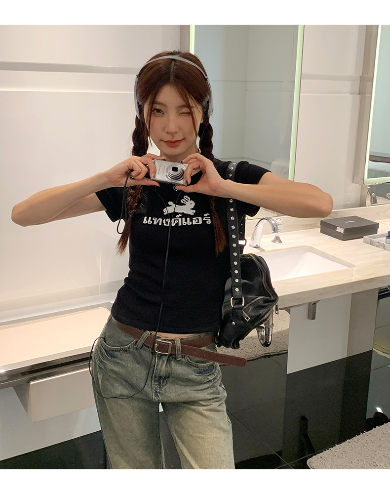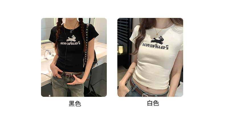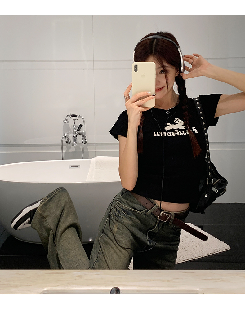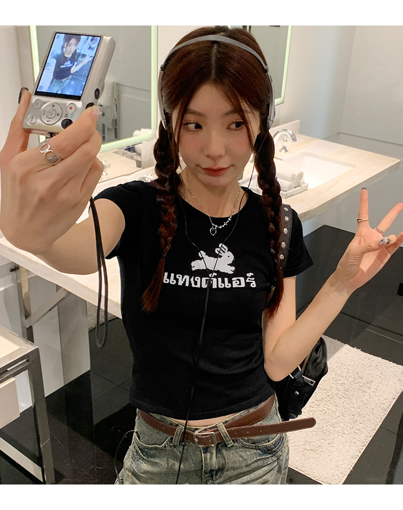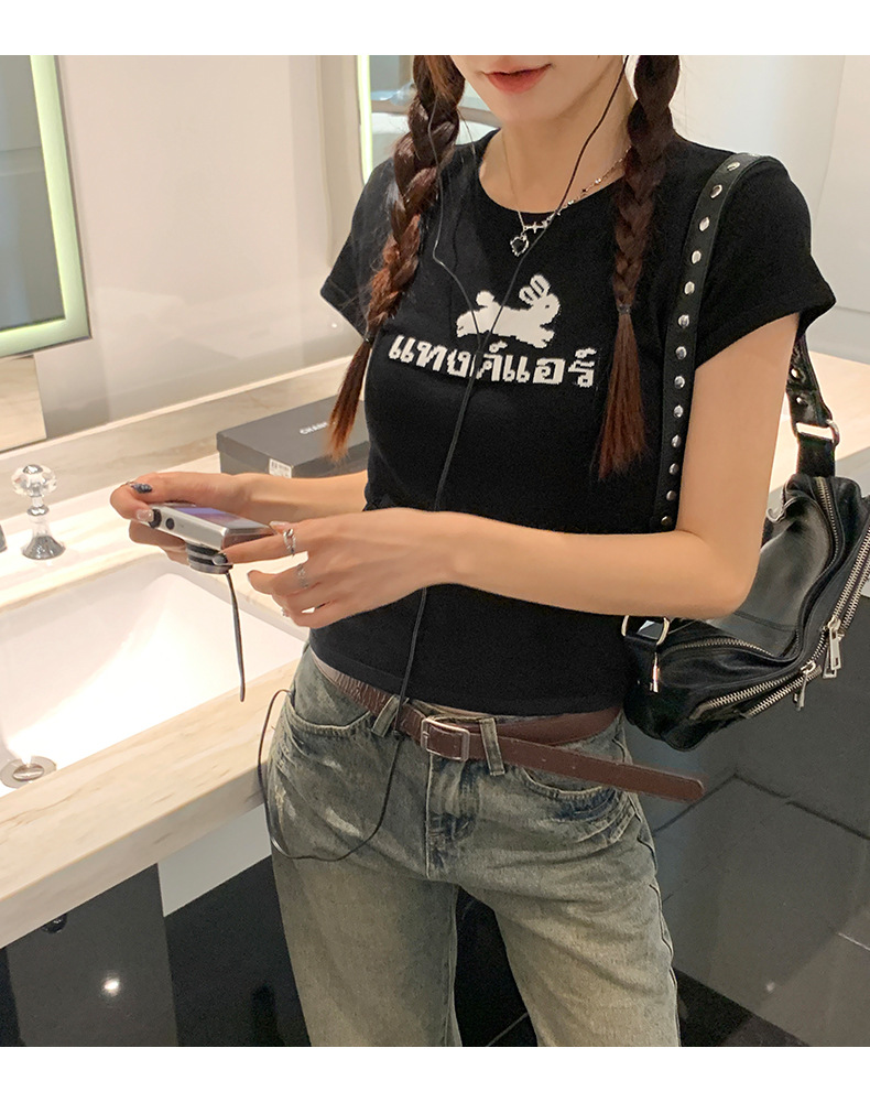 JMA-718 夏季韩版修身显瘦小个子纯欲辣妹风可爱兔子正肩针织短袖t恤女潮