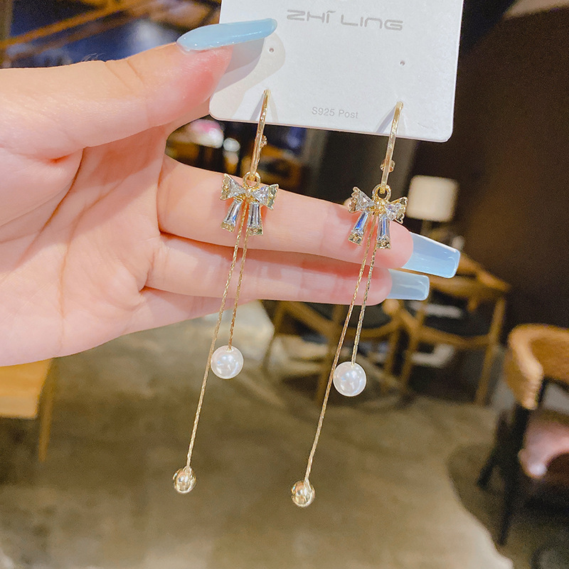JME-699 s925银针珍珠流苏显脸瘦耳坠长款韩式气质水钻蝴蝶结圆圈挂钩耳环