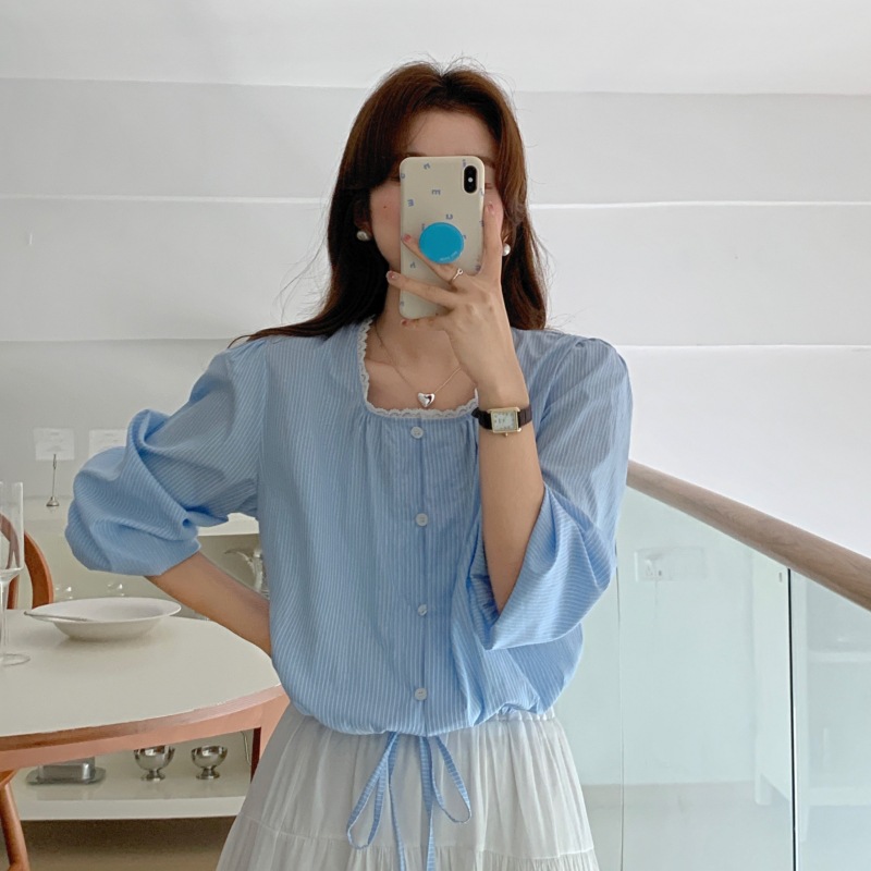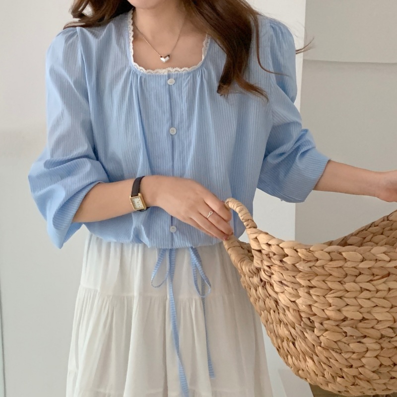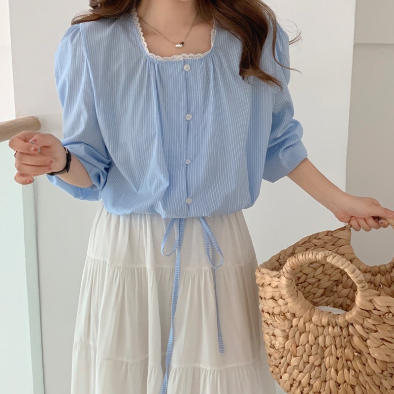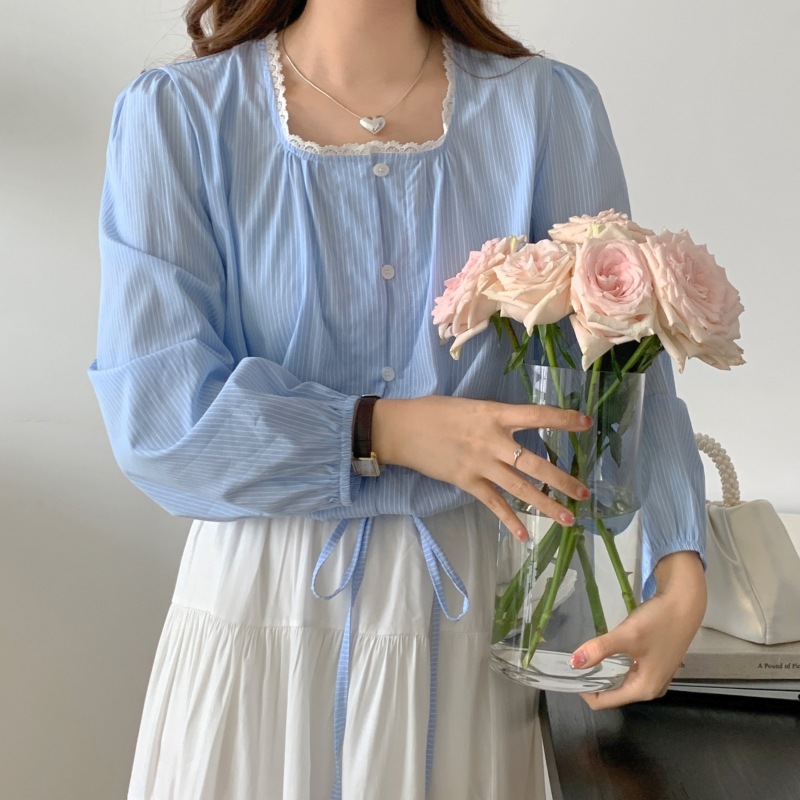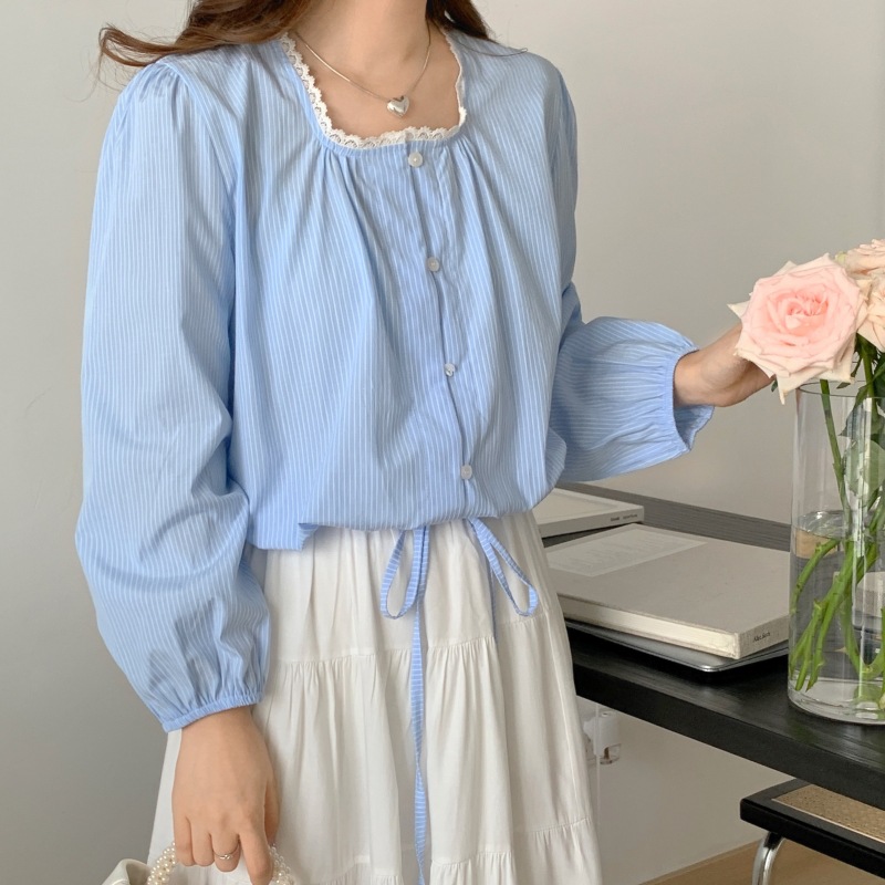 JMA-754 新款韩系甜美温柔气质少女花边条纹系带长袖衬衫