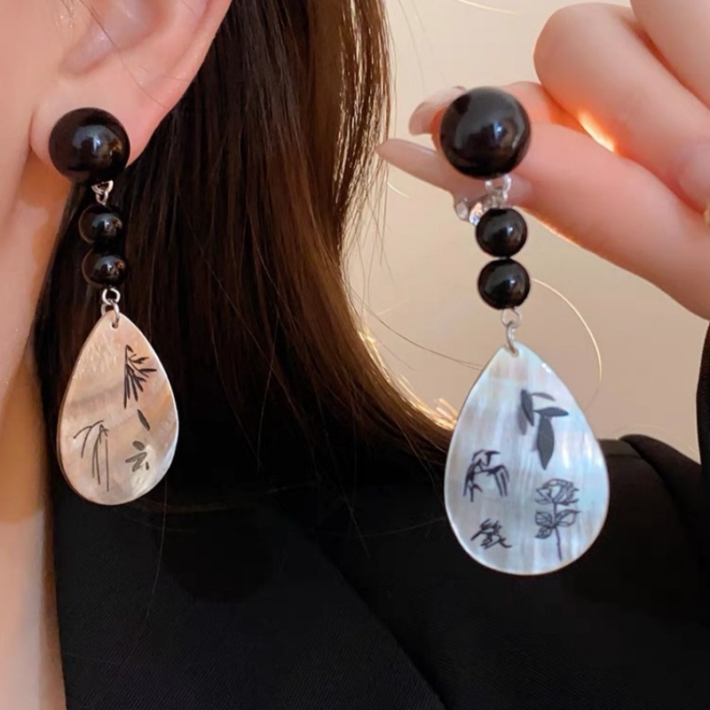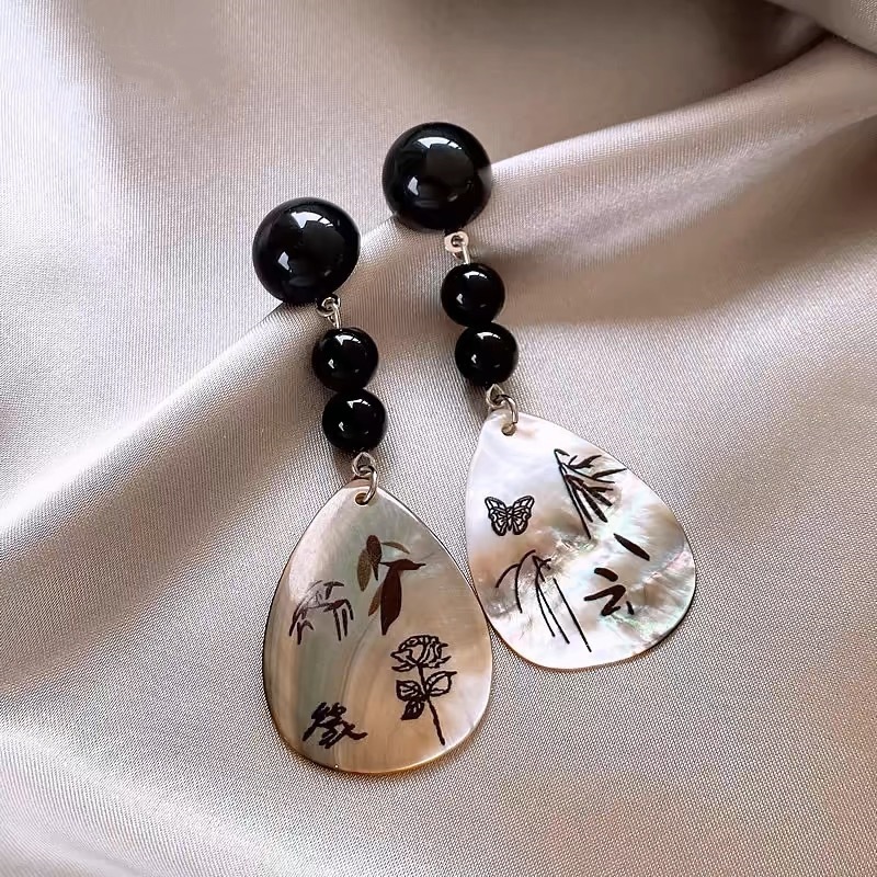 JME-733 新中式水滴印花串珠耳环高级感复古轻奢气质耳钉小众设计文艺耳饰