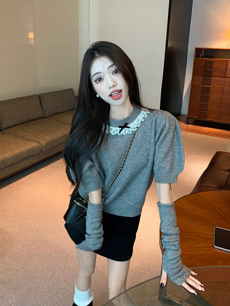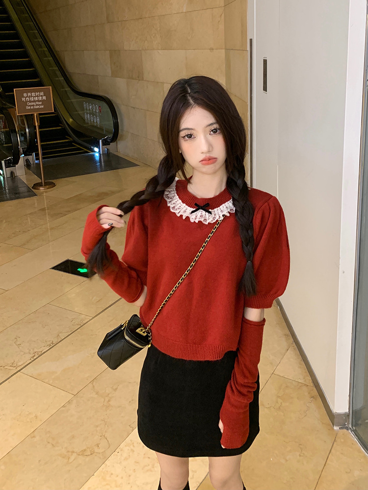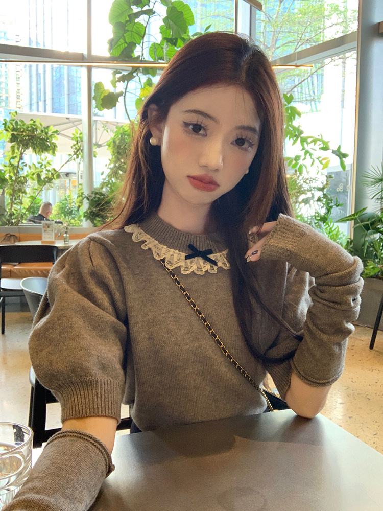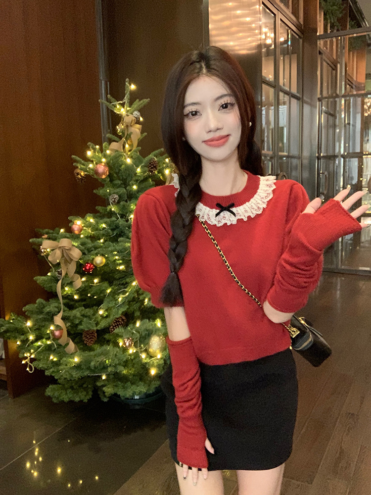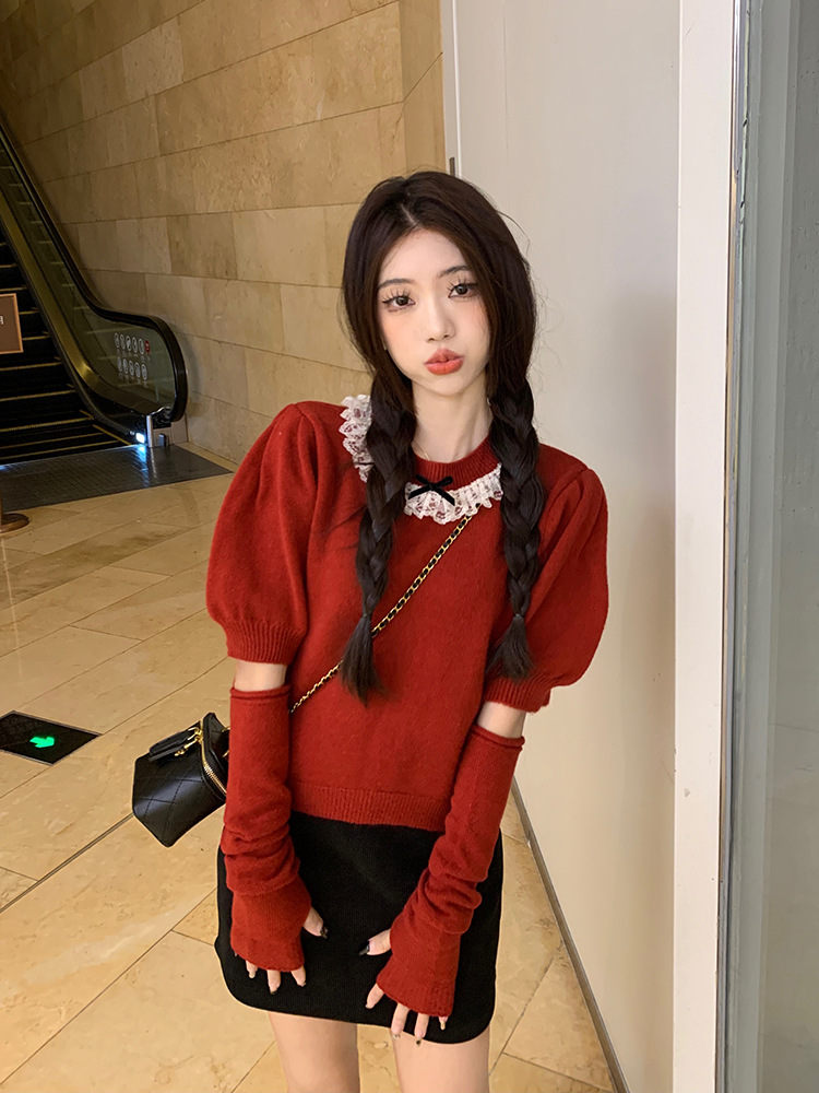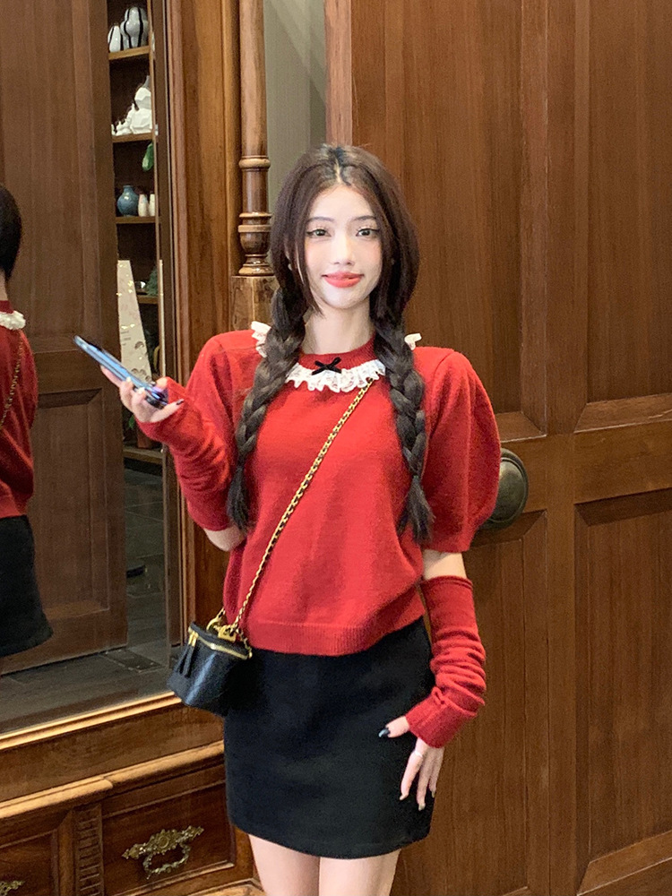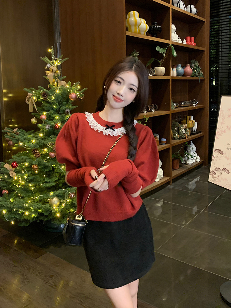 JMA-764 甜心阿miu节日氛围感泡泡袖蕾丝花边领毛衣软糯针织上衣