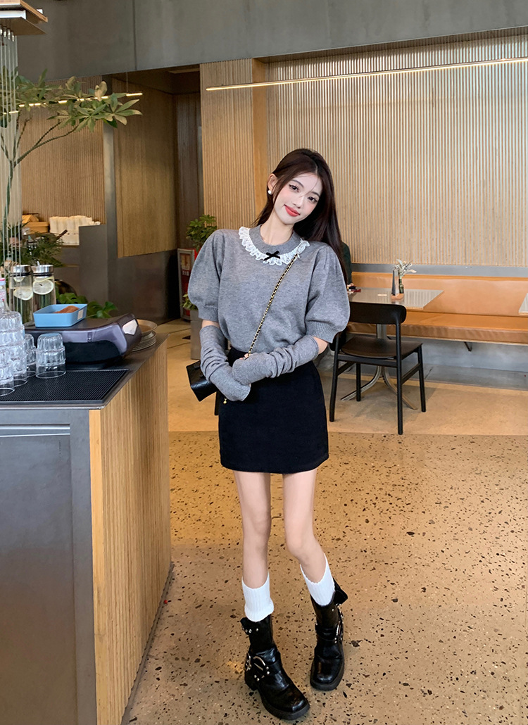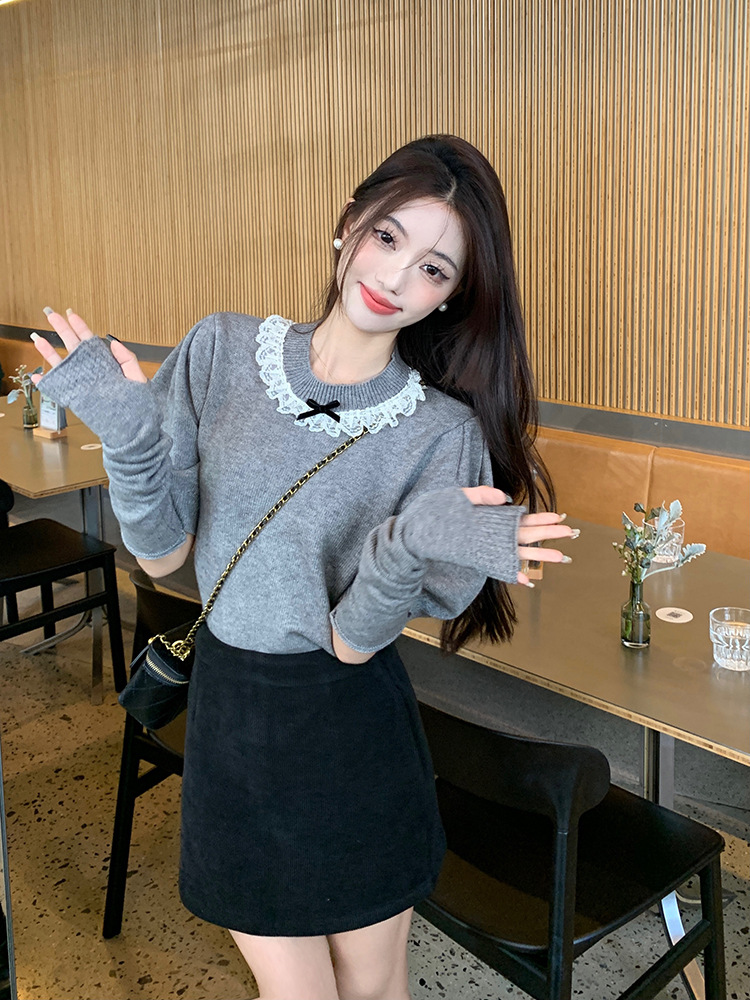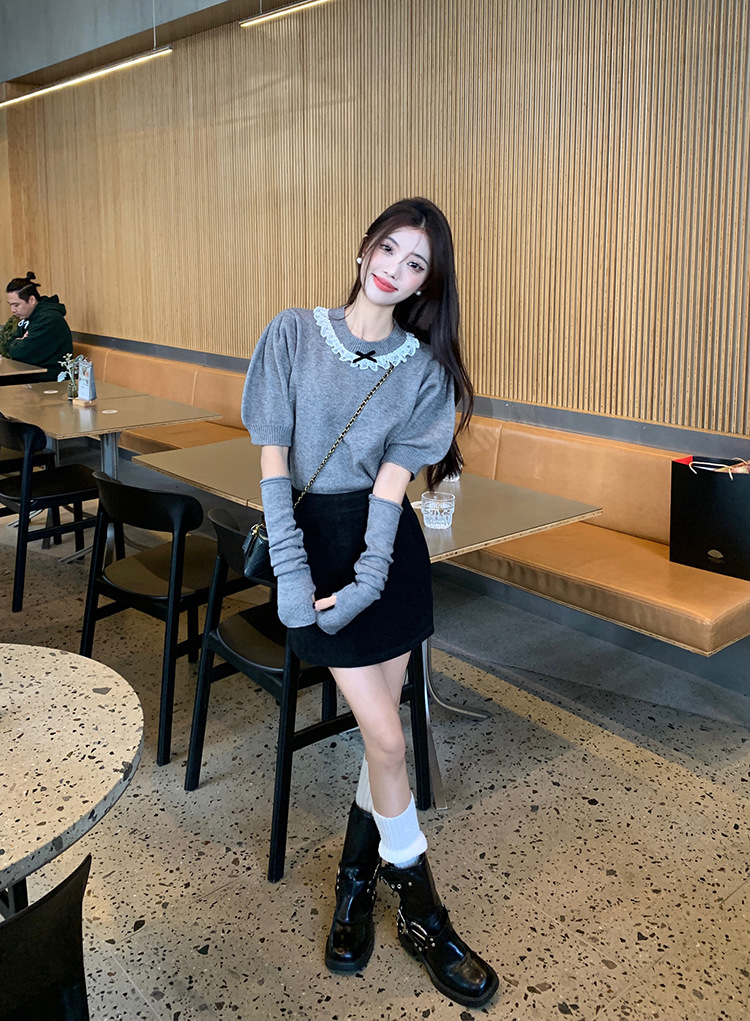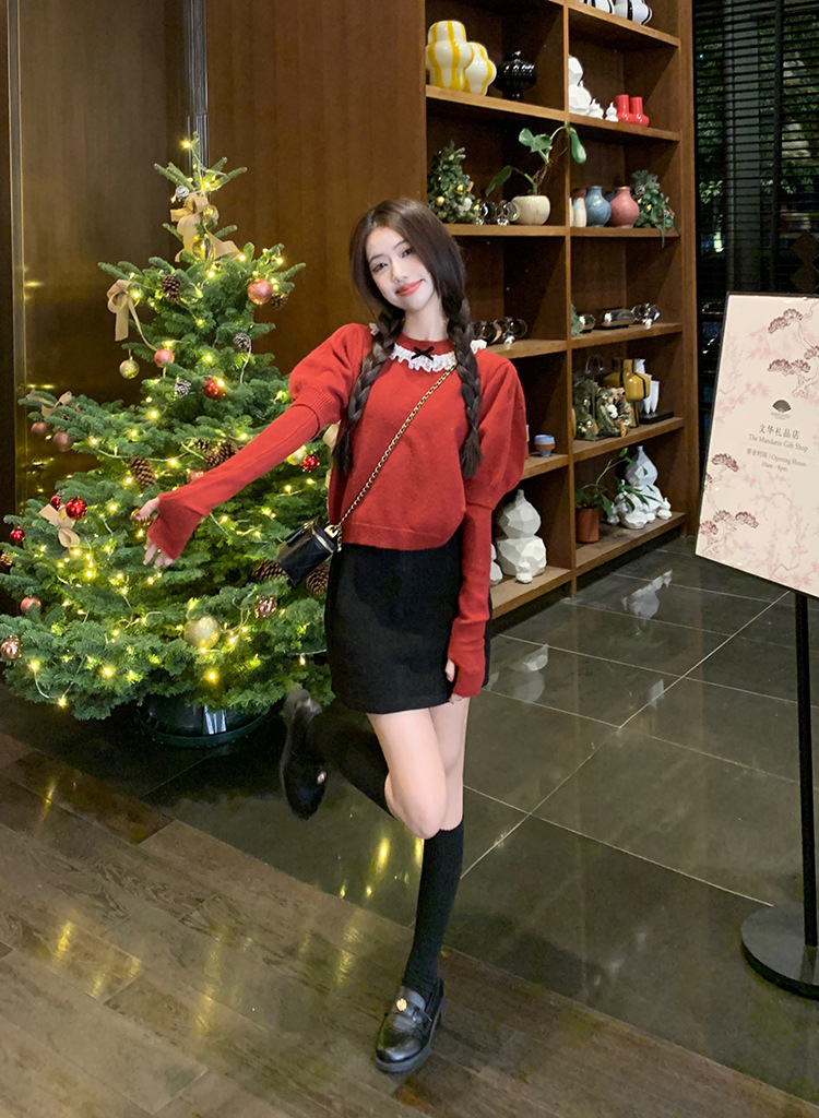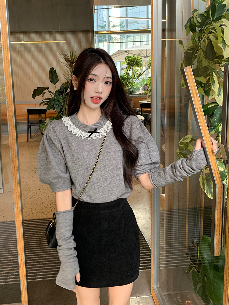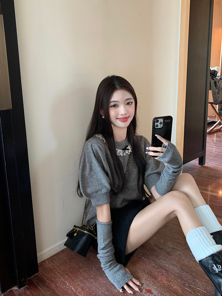 JMA-764 甜心阿miu节日氛围感泡泡袖蕾丝花边领毛衣软糯针织上衣