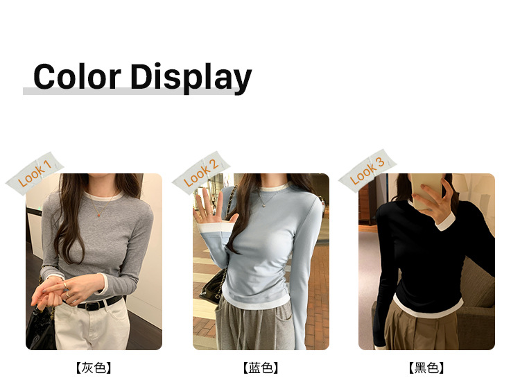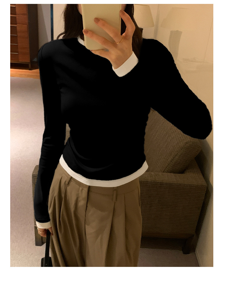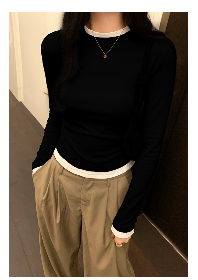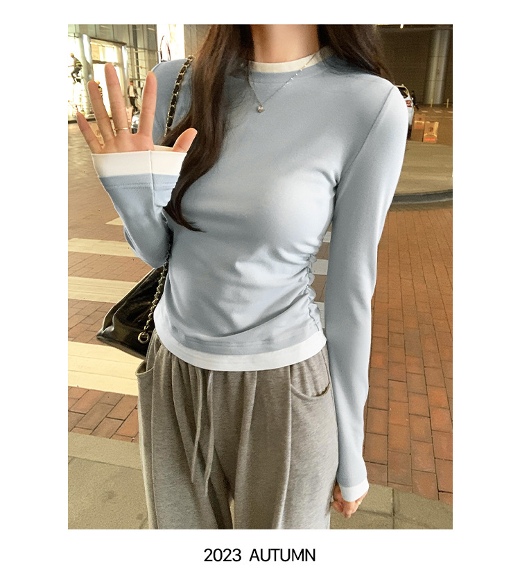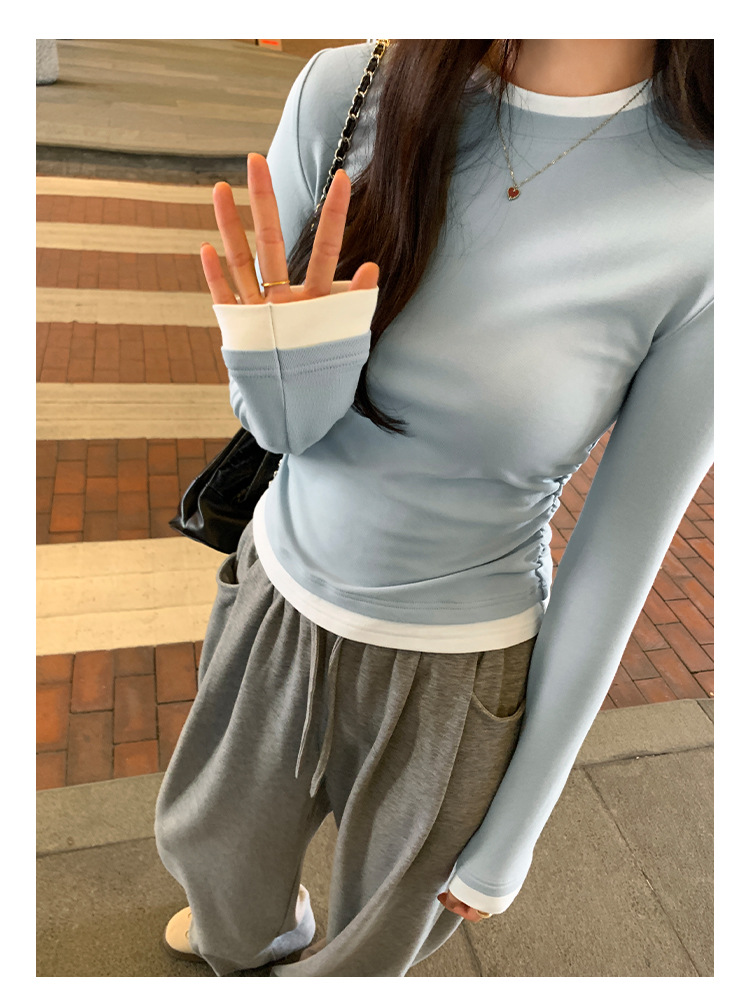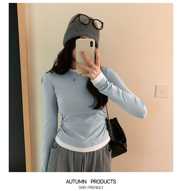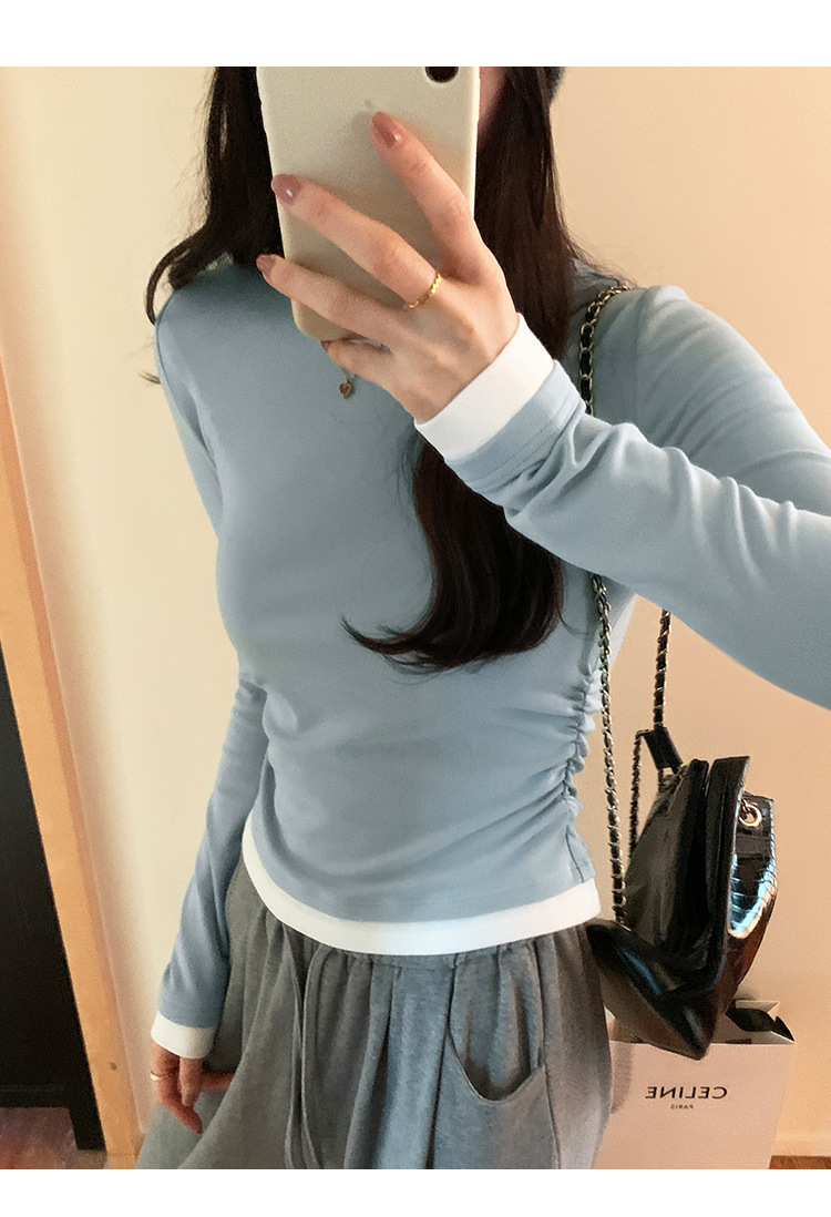 JMA-765 圆领休闲撞色假两件上衣女冬新款褶皱短款百搭长袖T恤